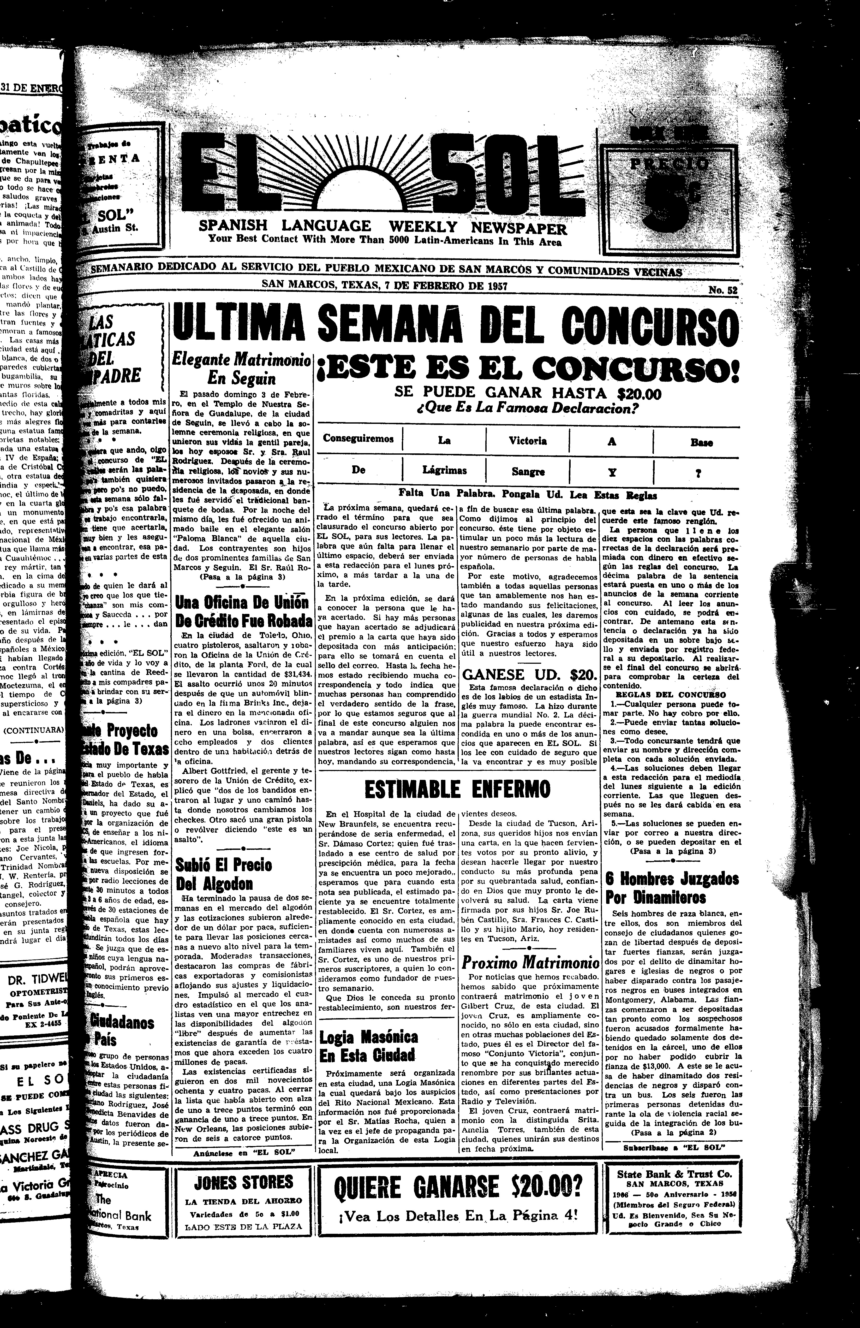 El Sol (San Marcos, Texas), 1957, February 7. Periodicals in the US-Mexico Border Region. https://latinonewspapers.com/s/eng/item/5599.