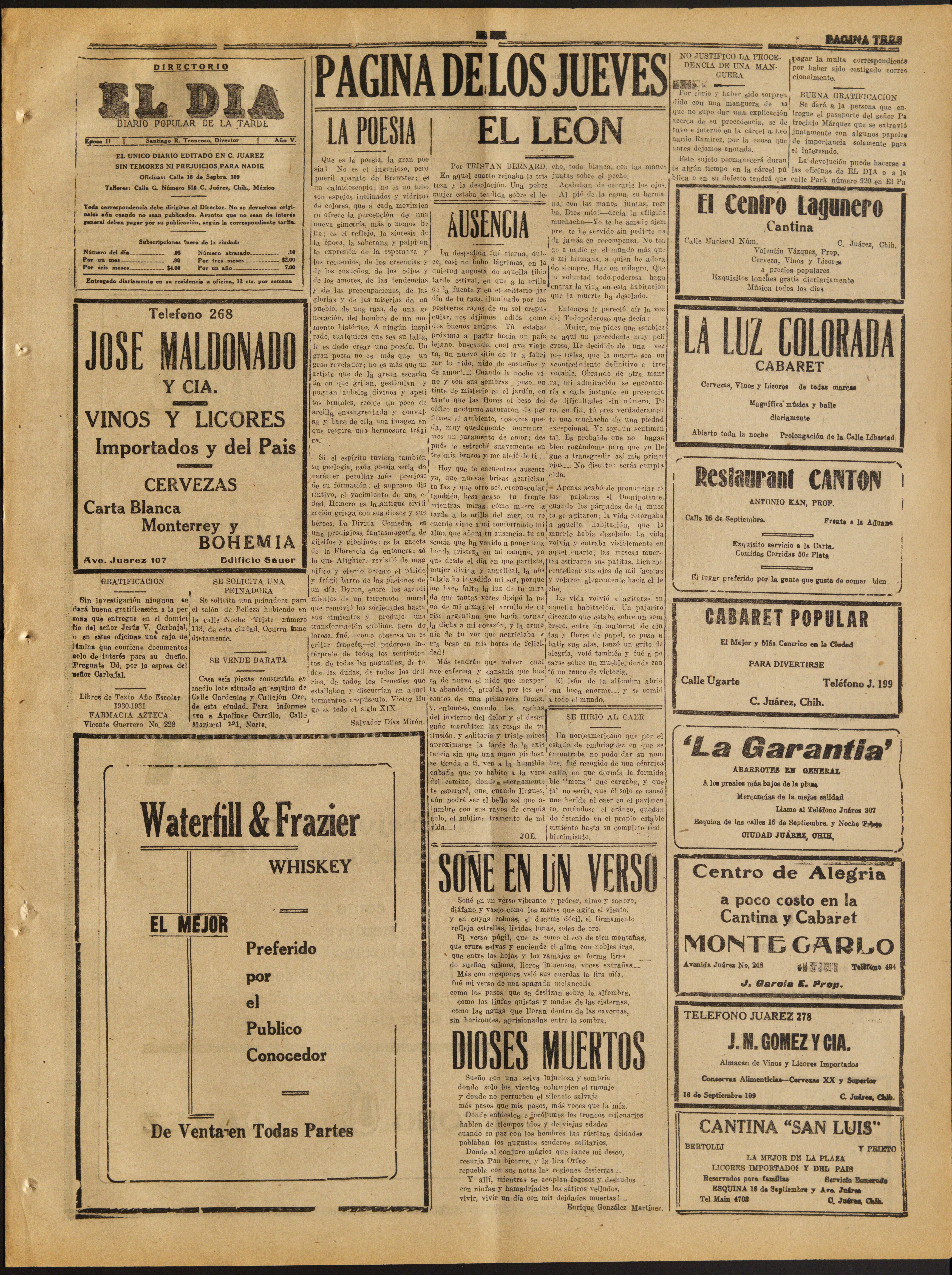 El Dia (Ciudad Juarez, Chihuahua, México), 1930, September 18. Periodicals in the US-Mexico Border Region. https://latinonewspapers.com/s/eng/item/56199.
