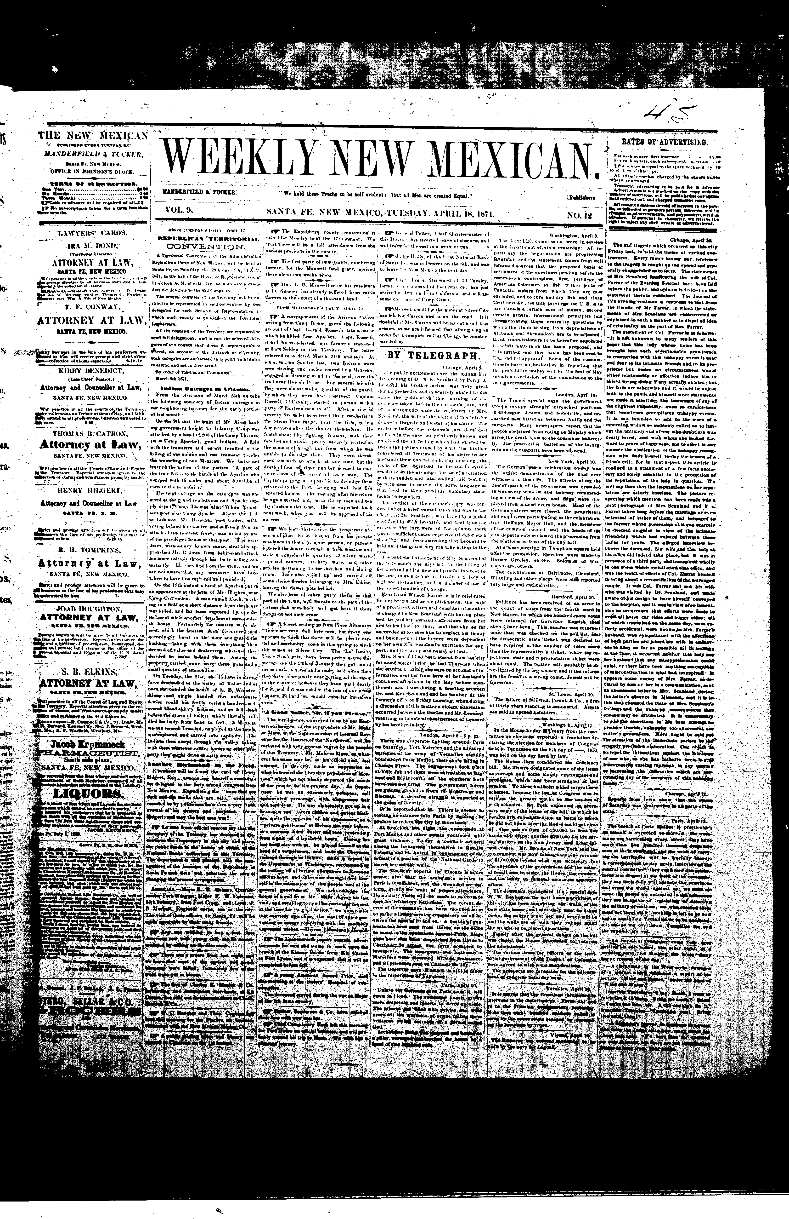 (1871, April 18). Weekly New Mexican. Available from Periodicals in the US-Mexico Border Region: https://latinonewspapers.com/s/eng/item/7280.