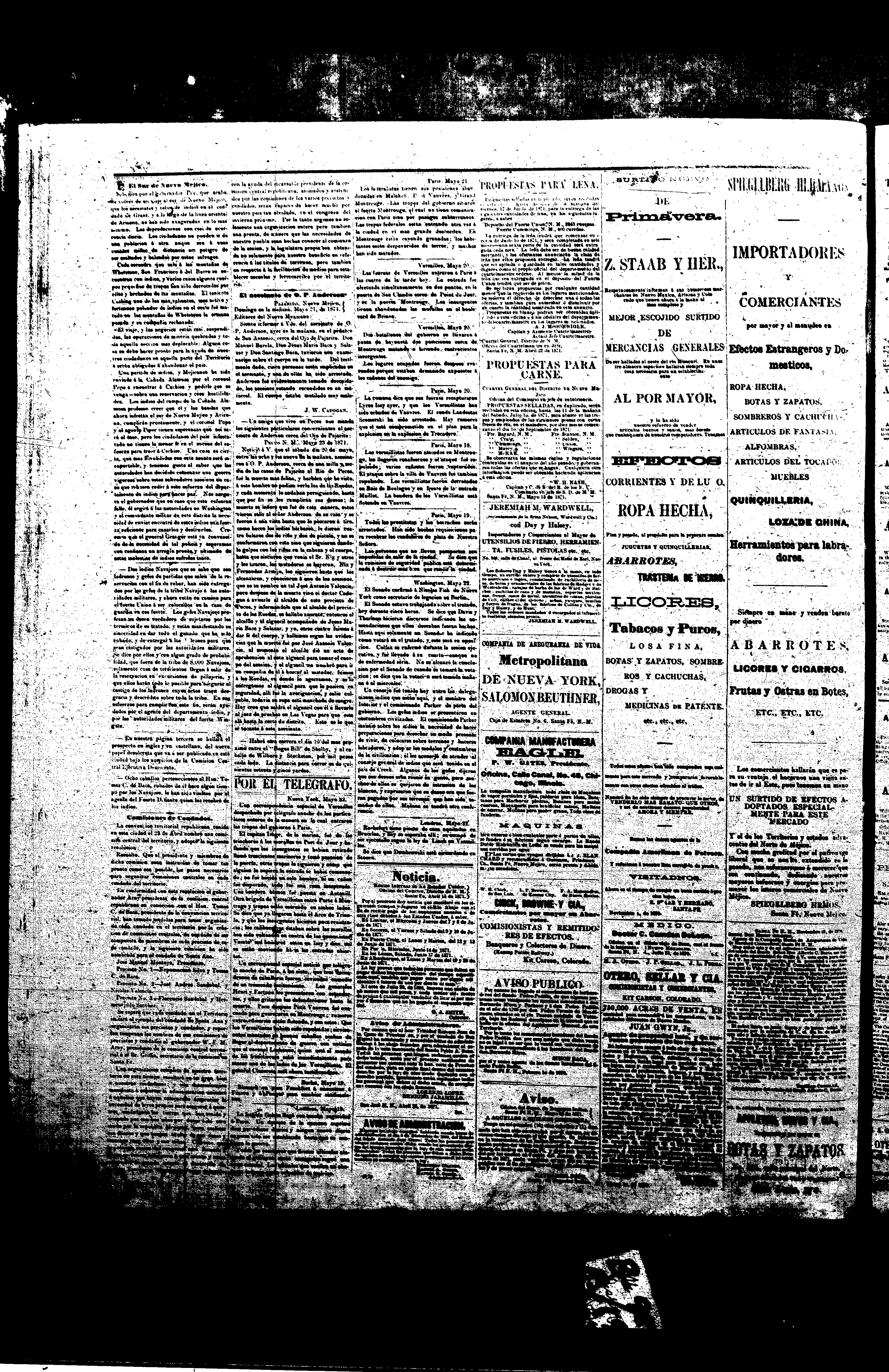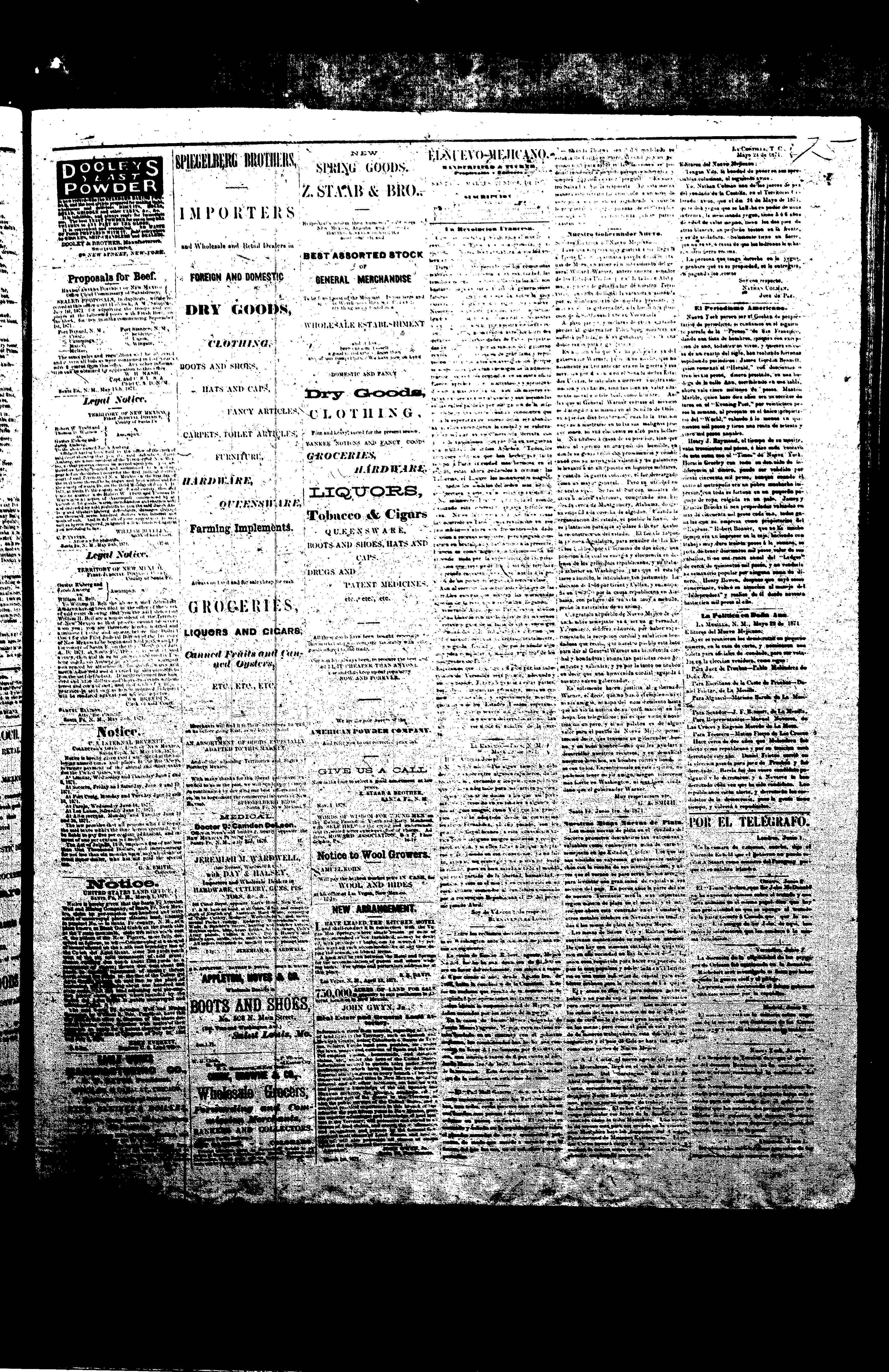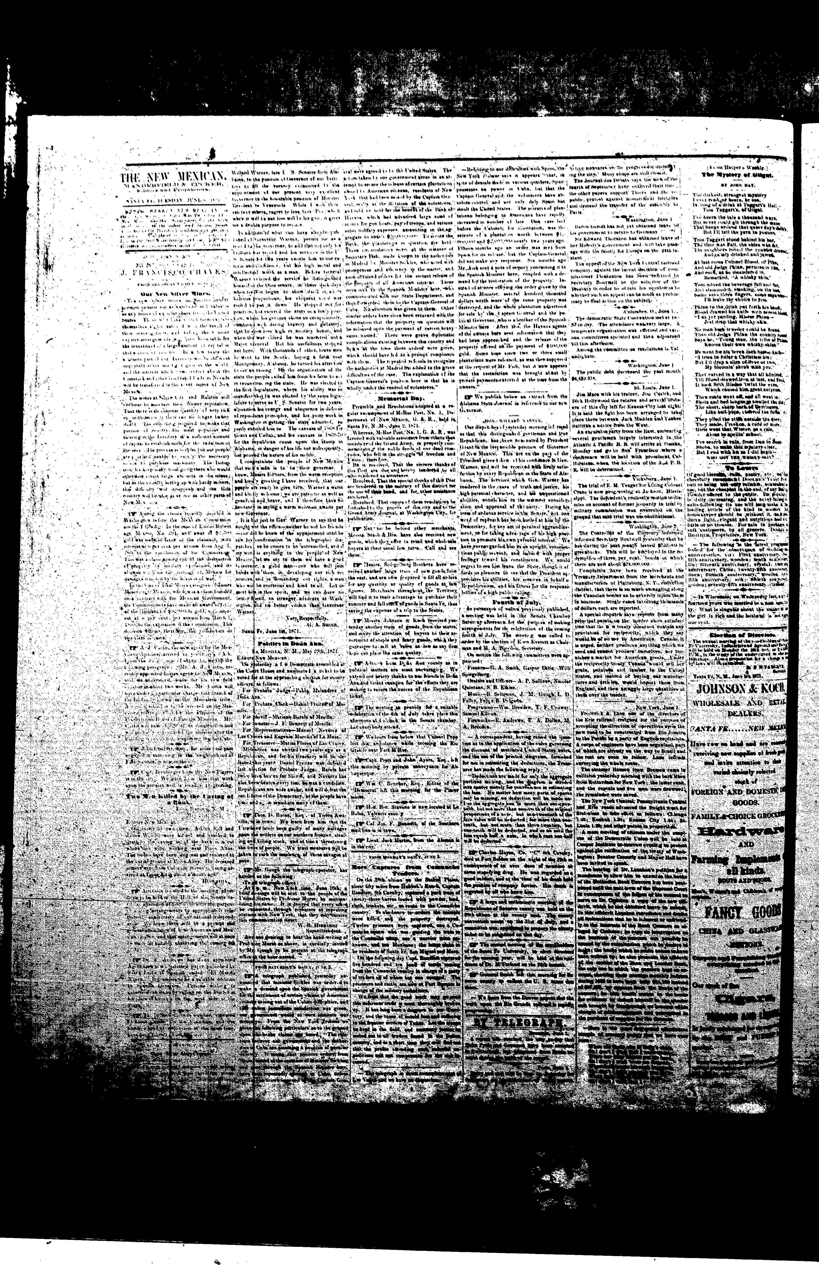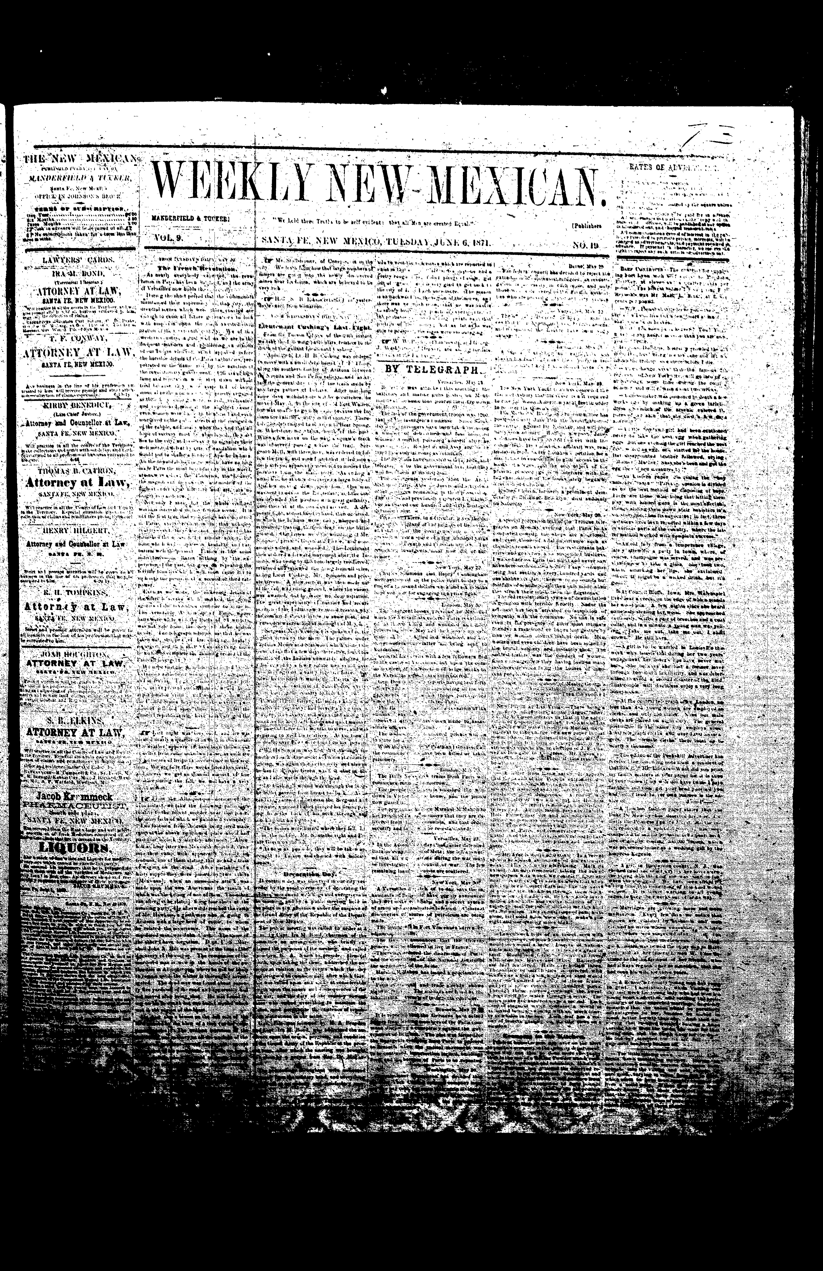 Weekly New Mexican (Santa Fe, New Mexico, United States), 1871, June 6. Periodicals in the US-Mexico Border Region. https://latinonewspapers.com/s/eng/item/7371.