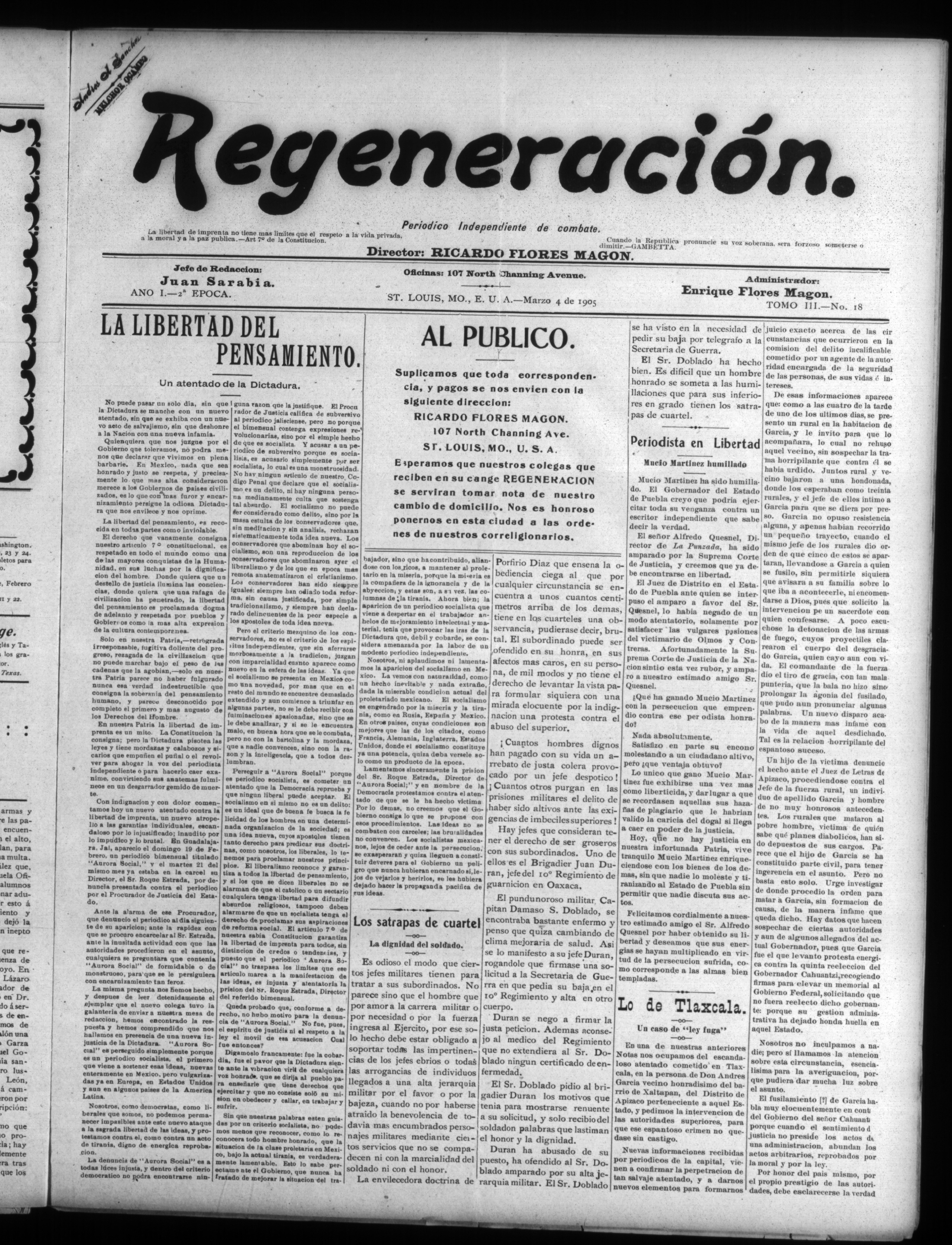 Regeneración (St. Louis, Missouri, United States), 1905, March 4. Periodicals in the US-Mexico Border Region. https://latinonewspapers.com/s/eng/item/76398.