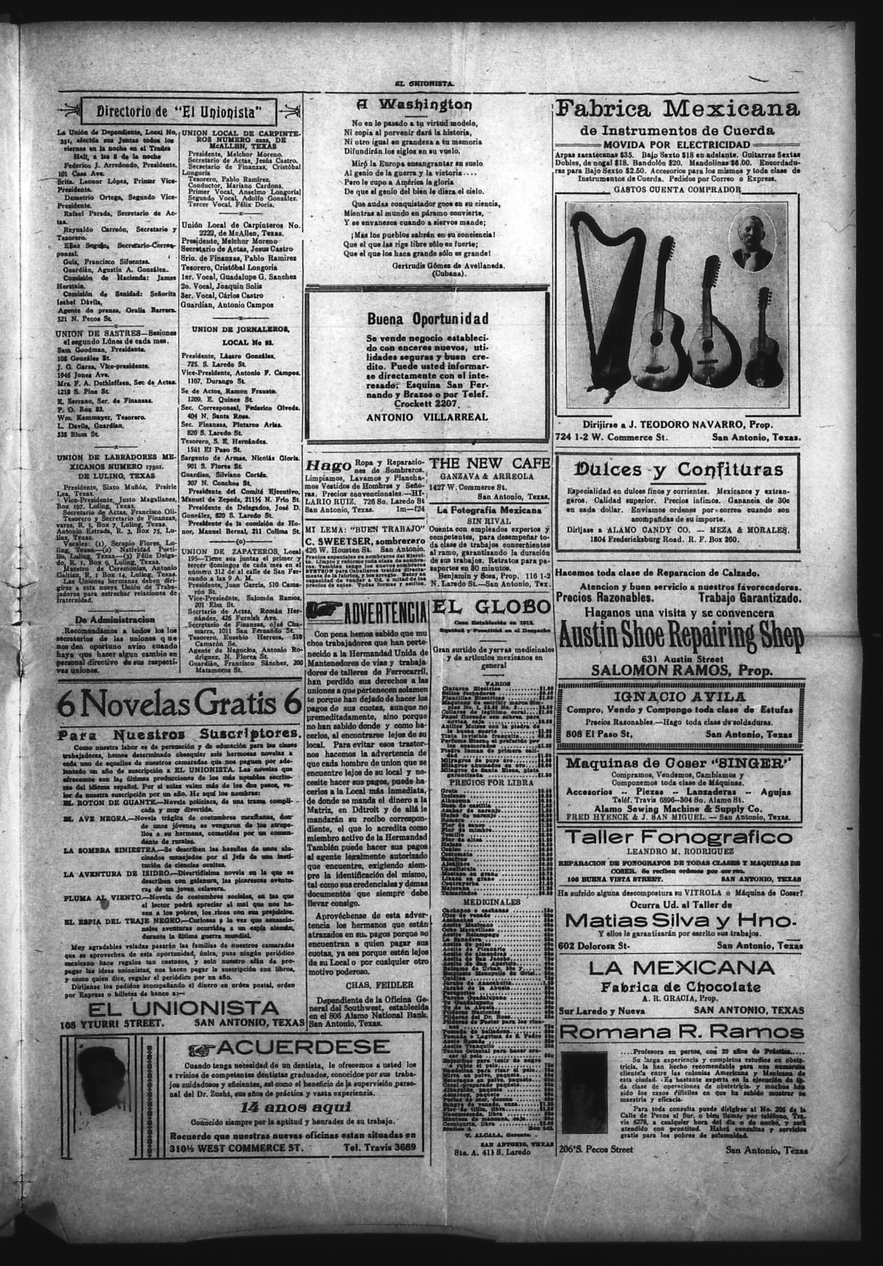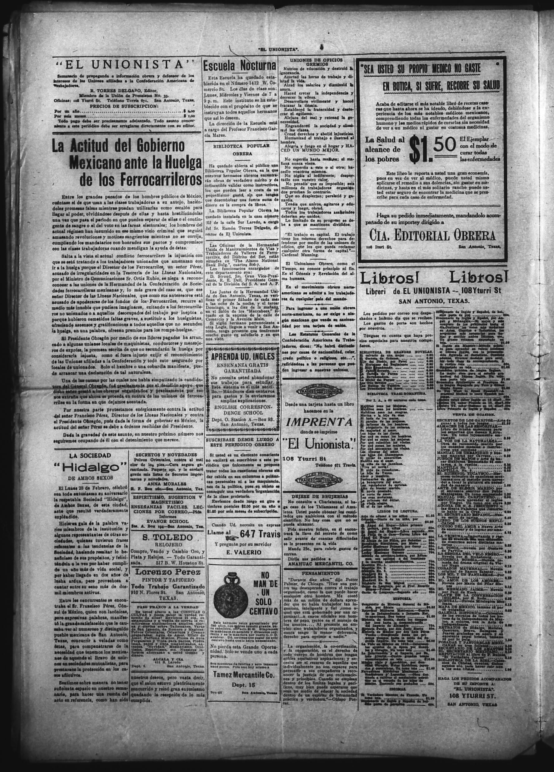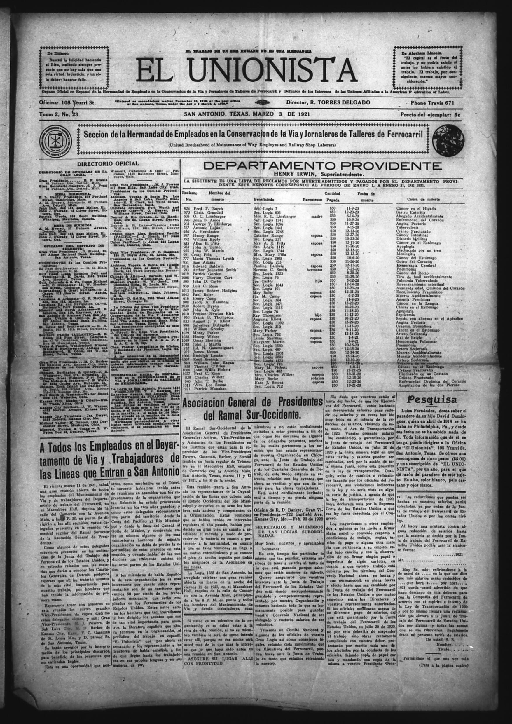 El Unionista (San Antonio, Texas, United States), 1921, March 3. Periodicals in the US-Mexico Border Region. https://latinonewspapers.com/s/eng/item/83429.