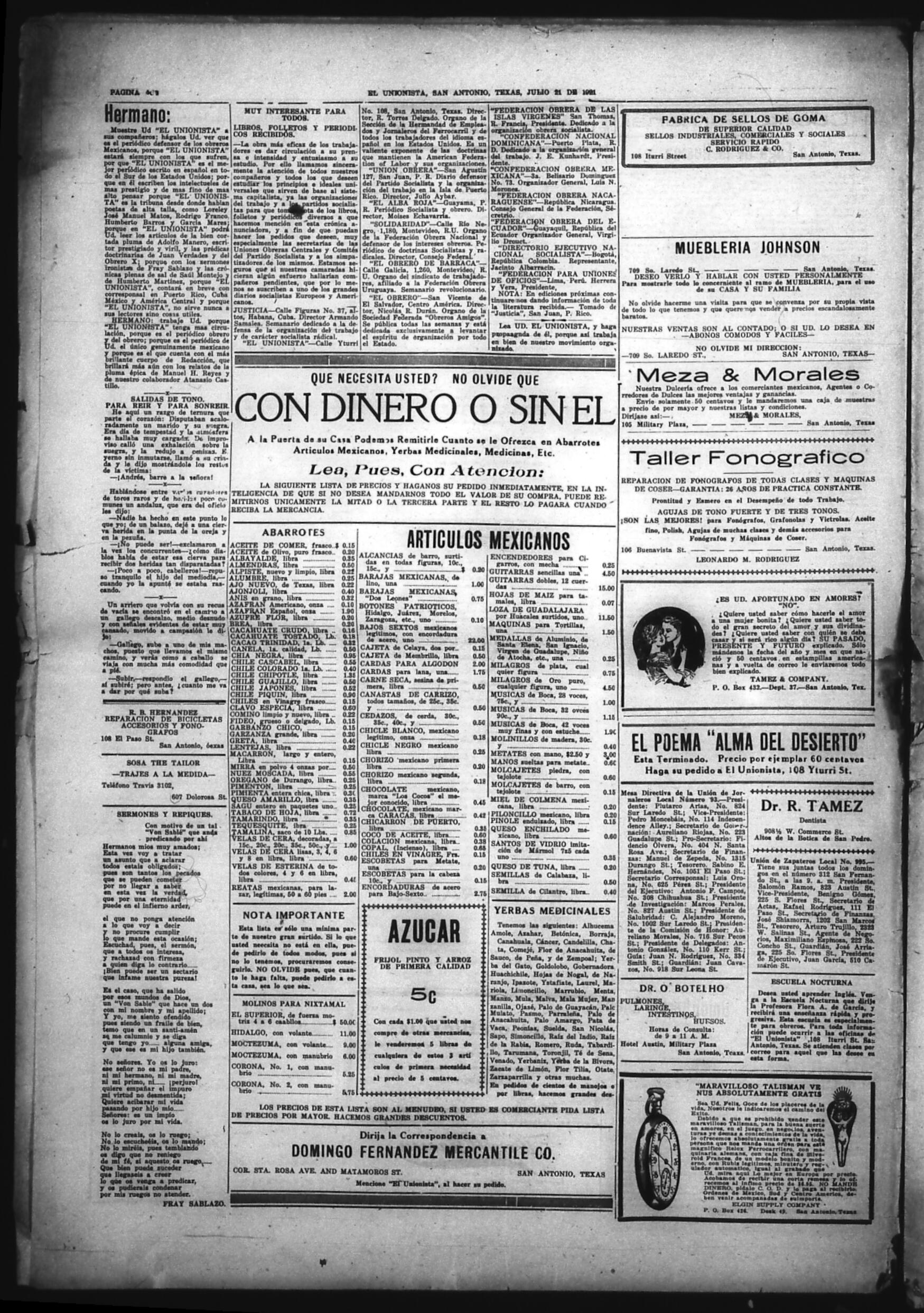 El Unionista (San Antonio, Texas, United States), 1921, July 21. Periodicals in the US-Mexico Border Region. https://latinonewspapers.com/s/eng/item/83442.