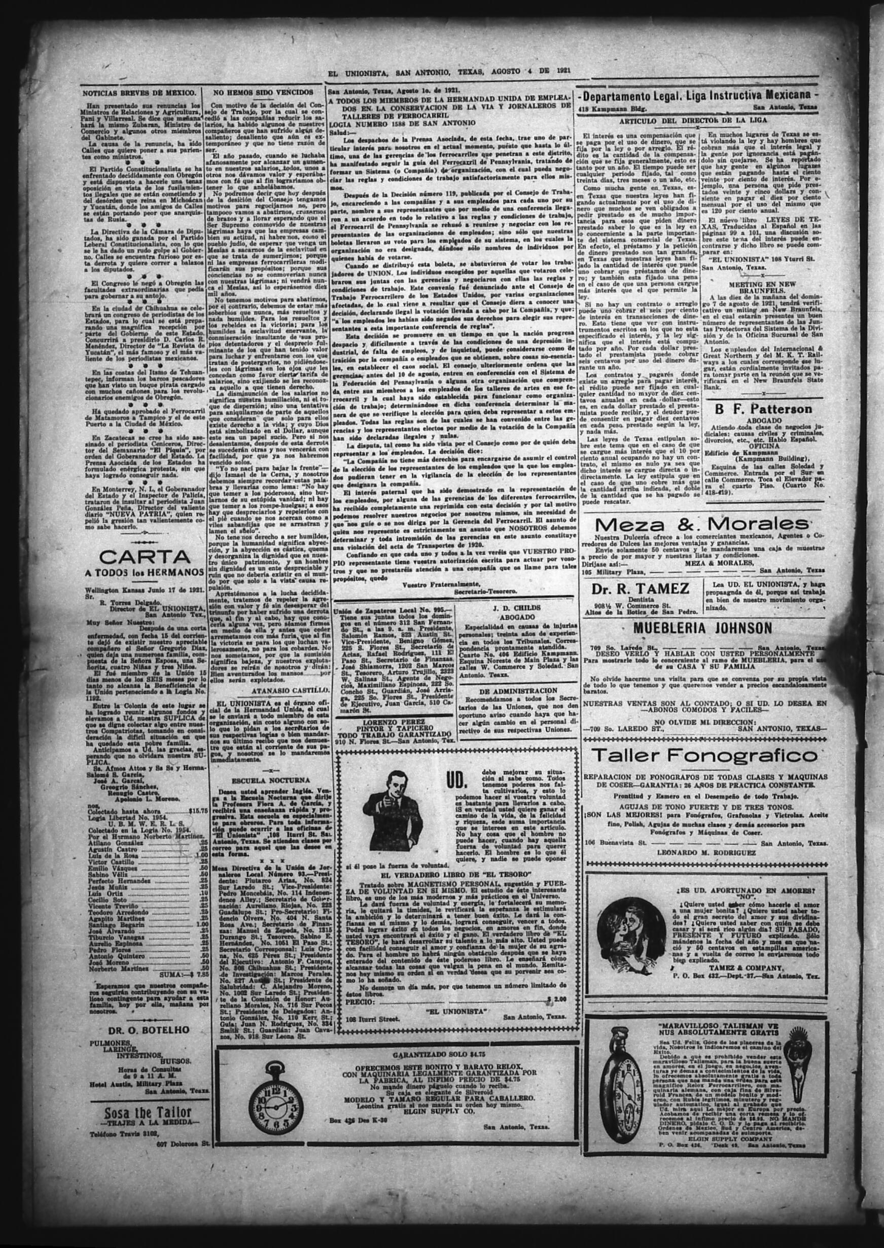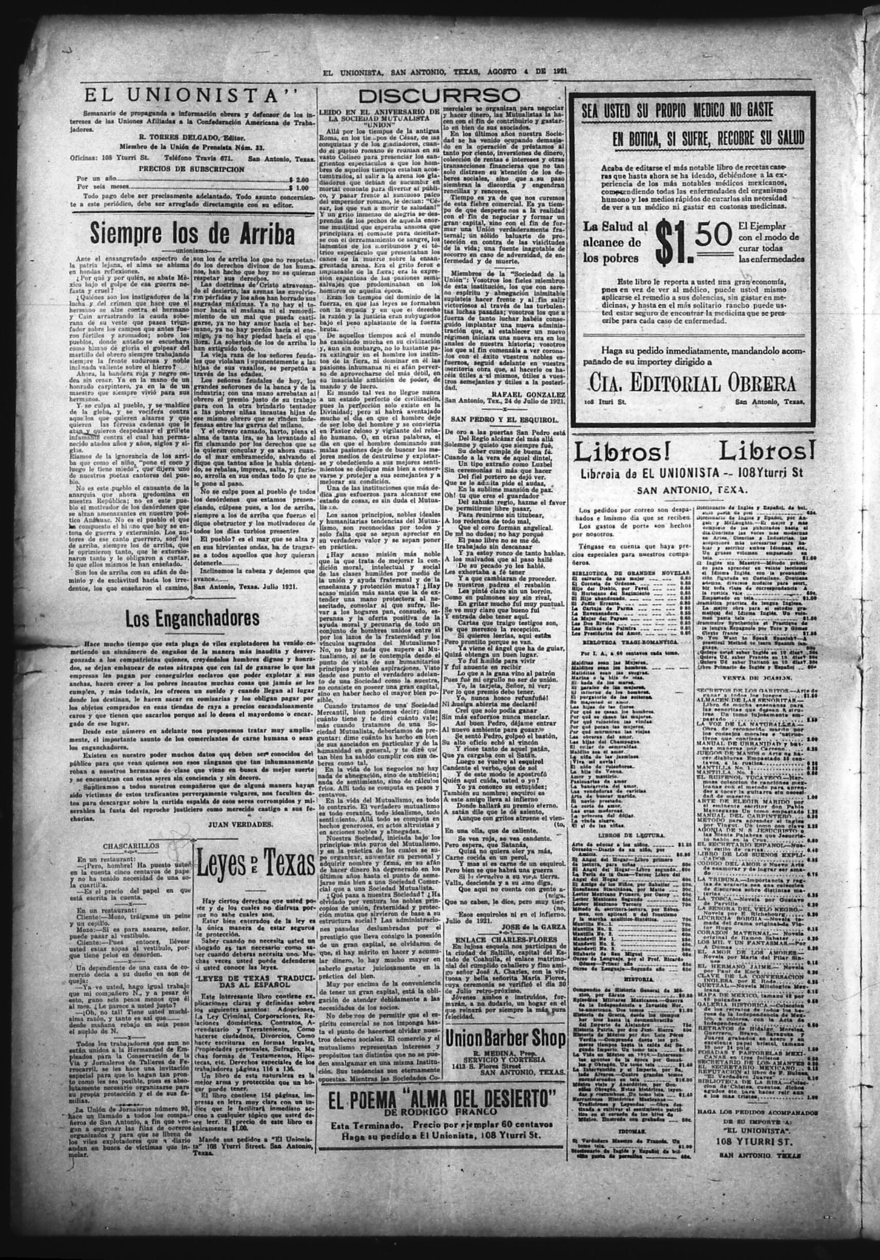 El Unionista (San Antonio, Texas, United States), 1921, August 4. Periodicals in the US-Mexico Border Region. https://latinonewspapers.com/s/eng/item/83444.