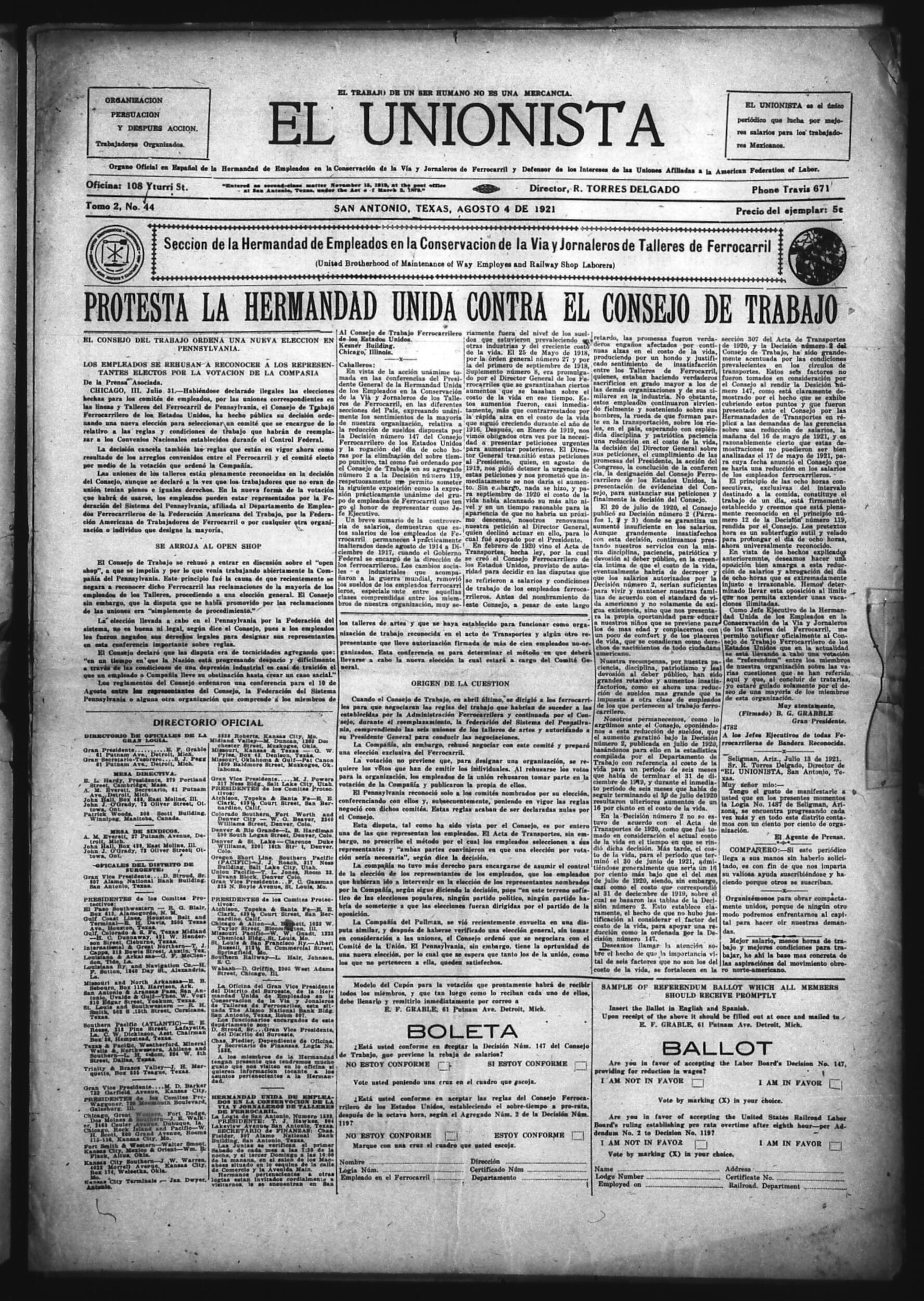 El Unionista, 1921, August 4. Periodicals in the US-Mexico Border Region, https://latinonewspapers.com/s/eng/item/83444. Accessed 25 January 2026.