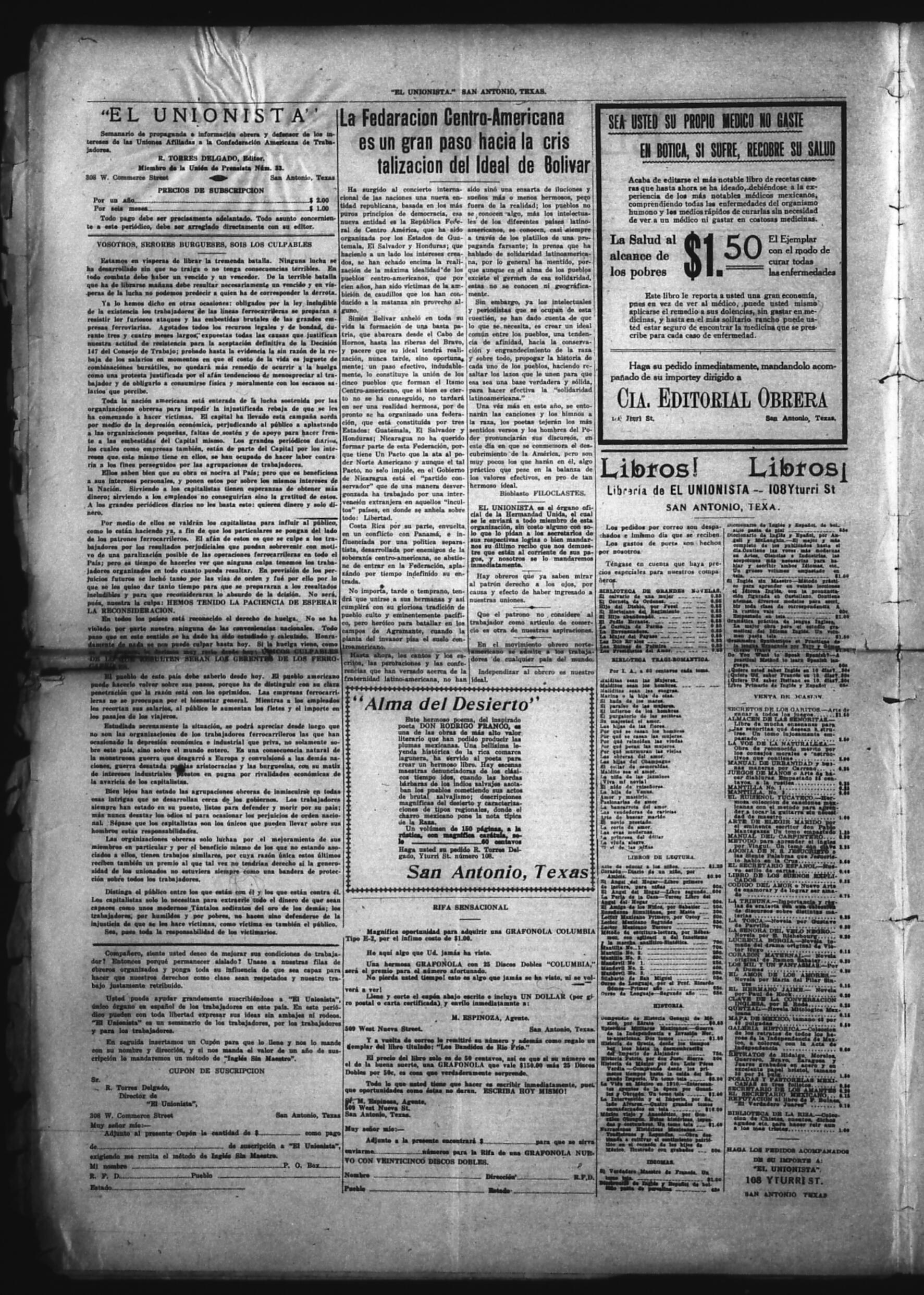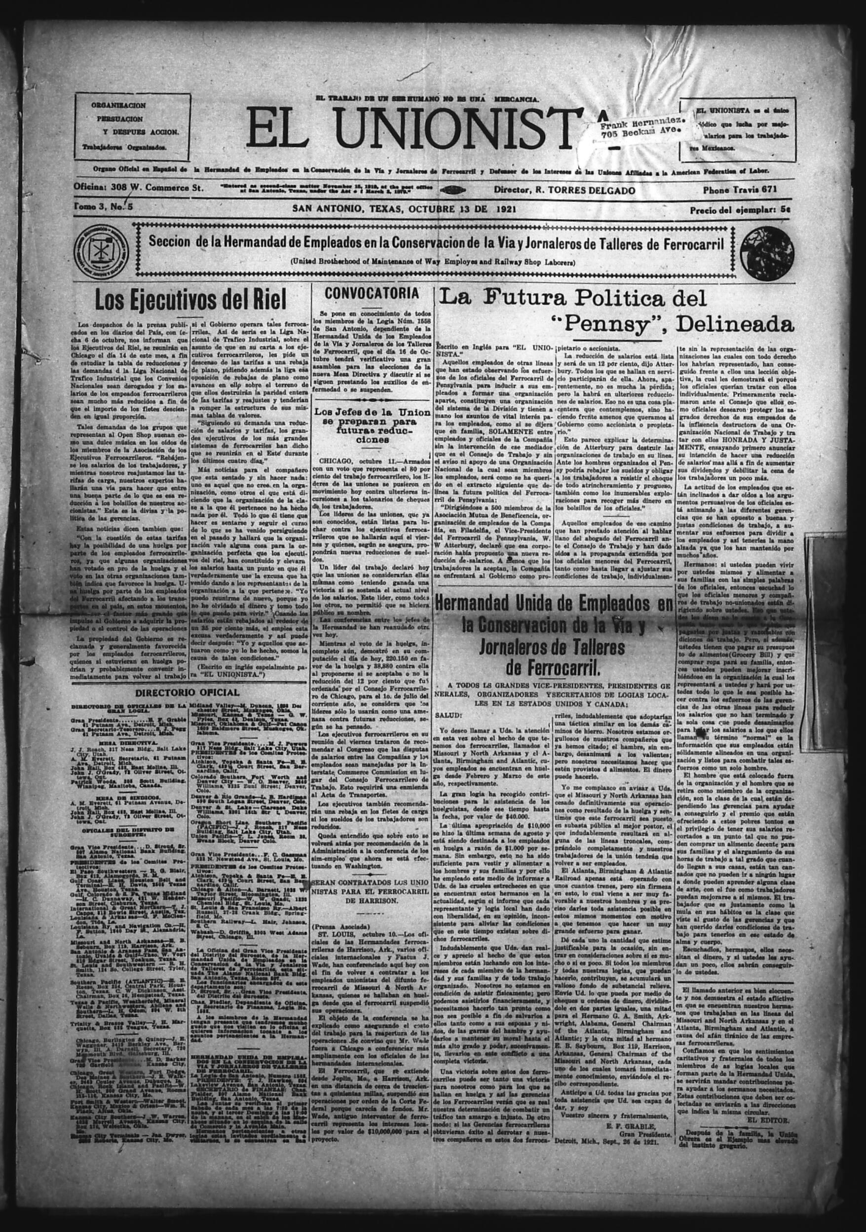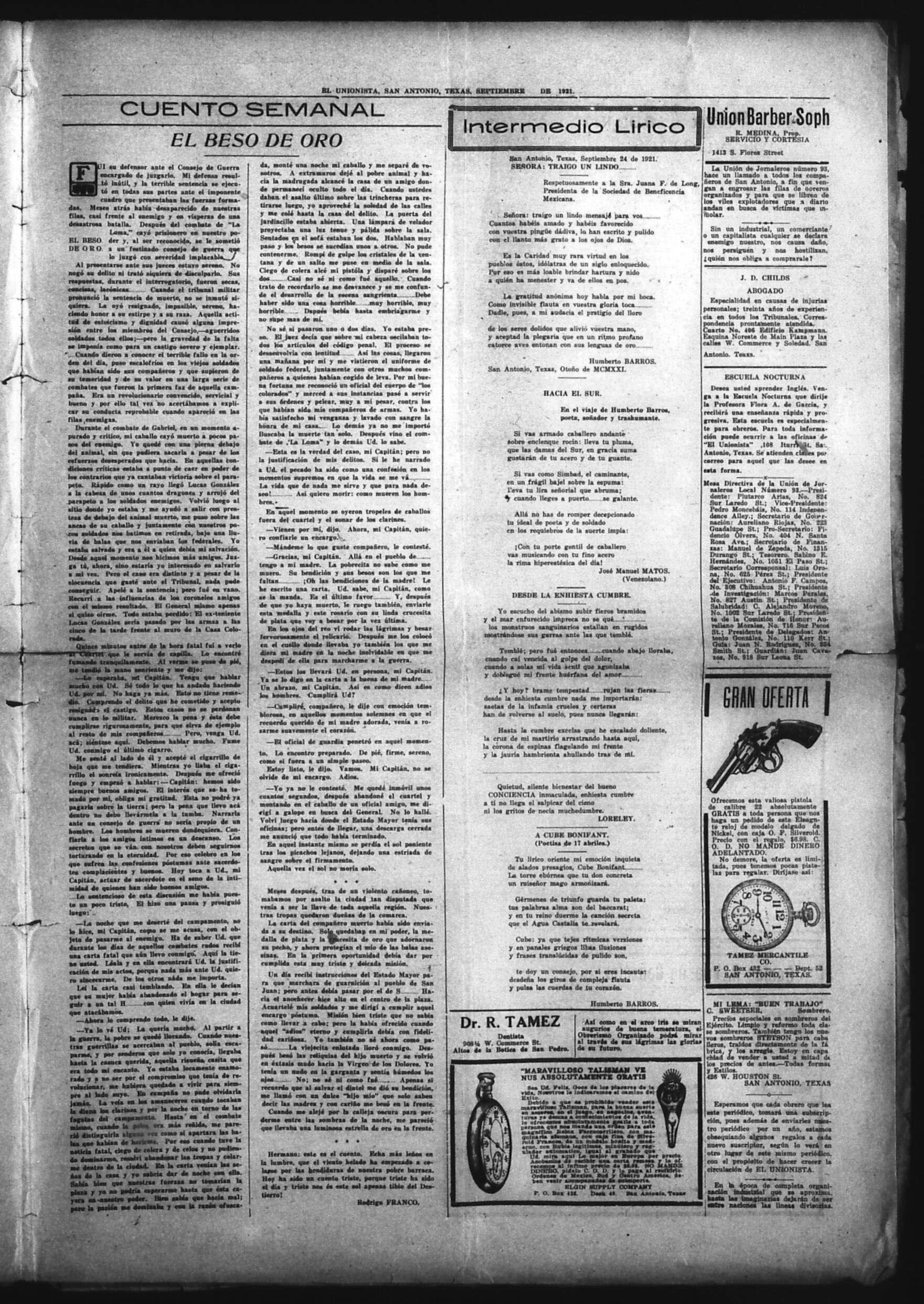 El Unionista (San Antonio, Texas, United States), 1921, October 13. Periodicals in the US-Mexico Border Region. https://latinonewspapers.com/s/eng/item/83449.