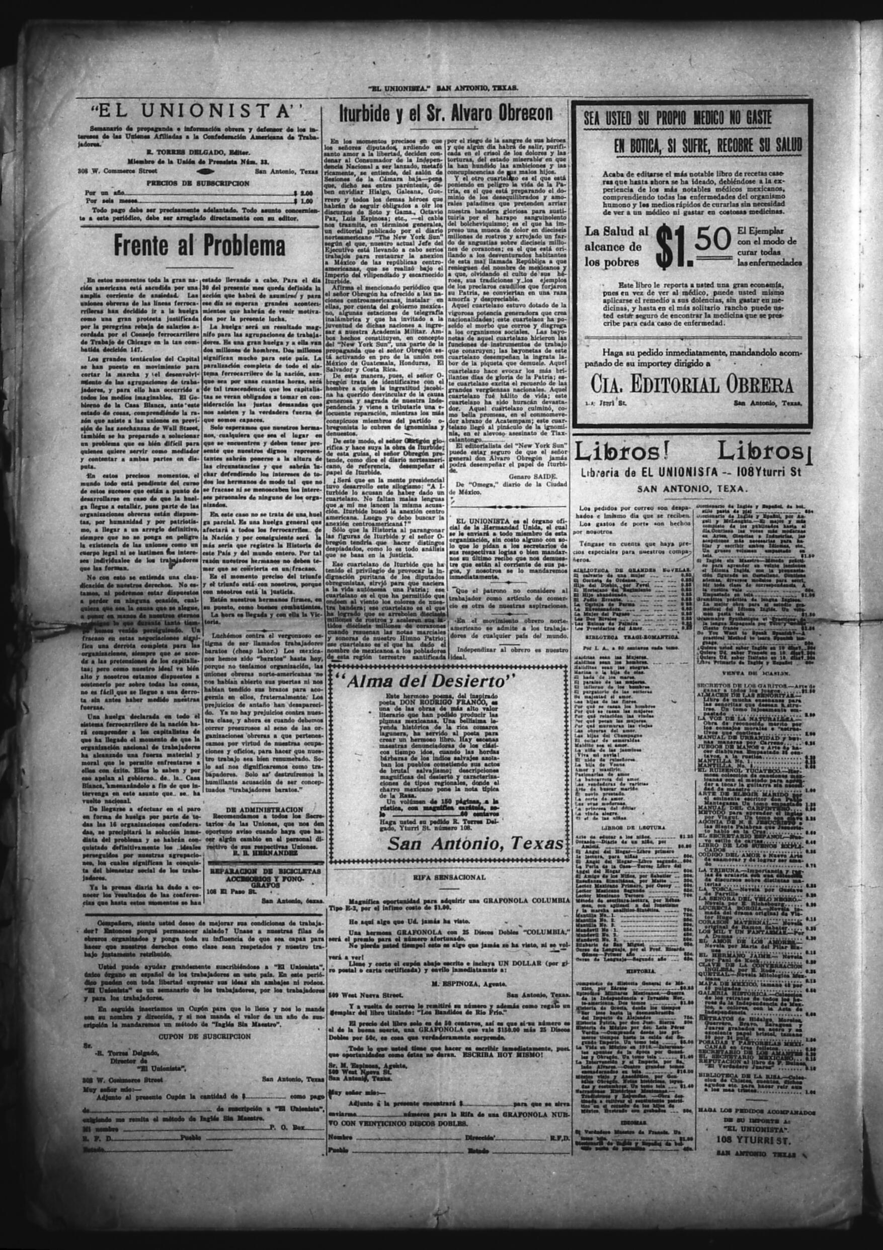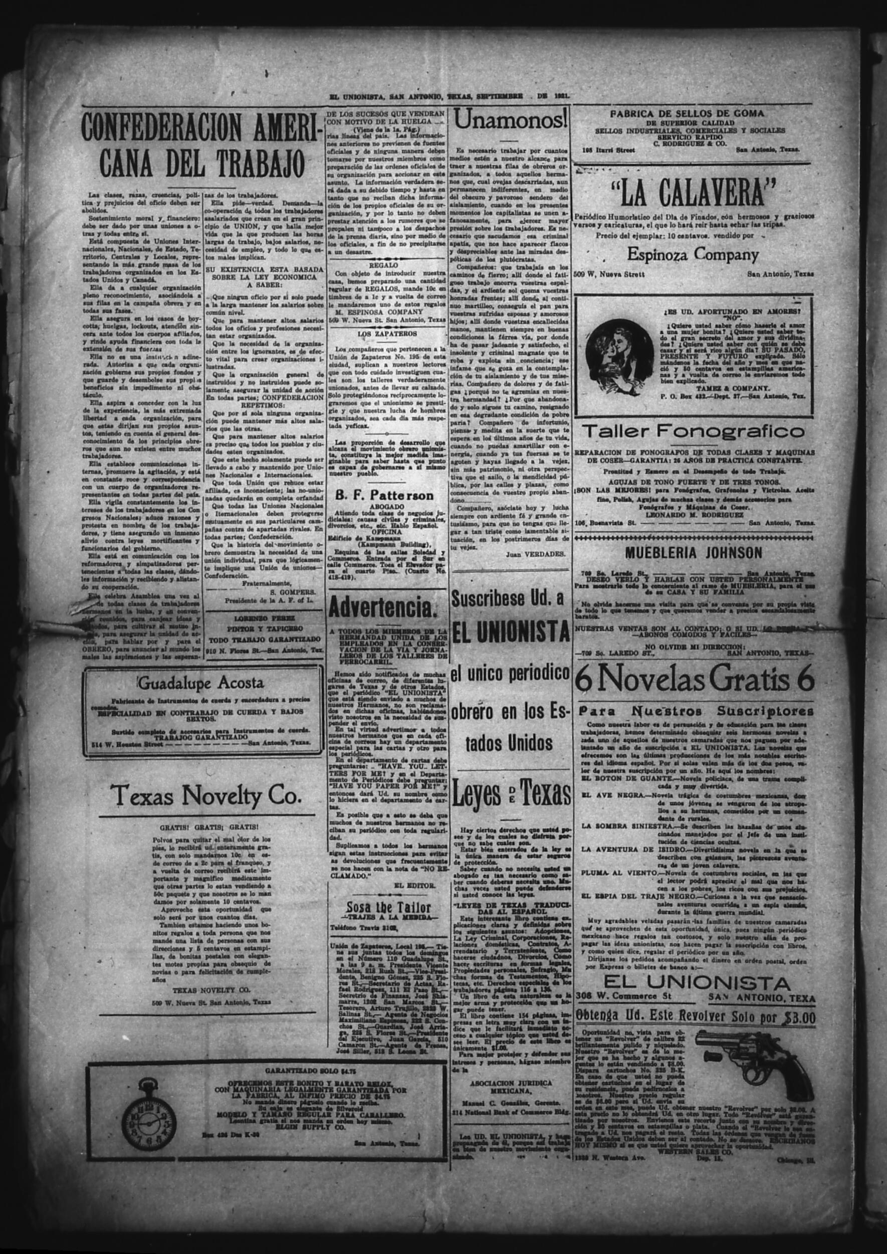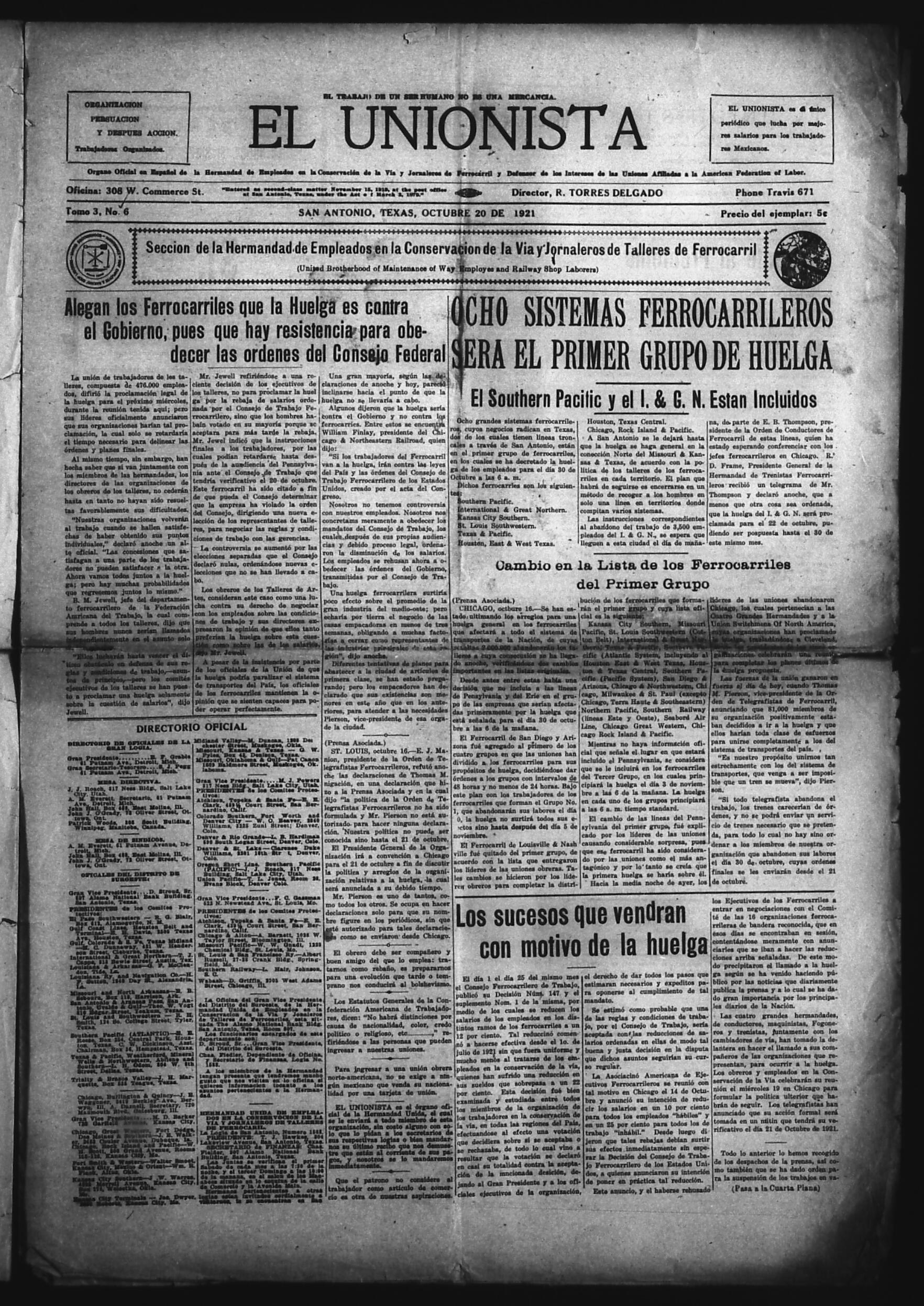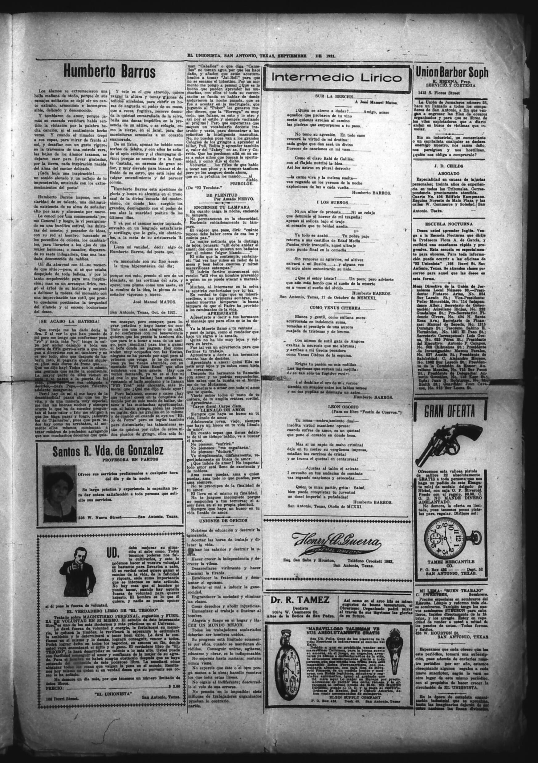 El Unionista (San Antonio, Texas, United States), 1921, October 20. Periodicals in the US-Mexico Border Region. https://latinonewspapers.com/s/eng/item/83450.