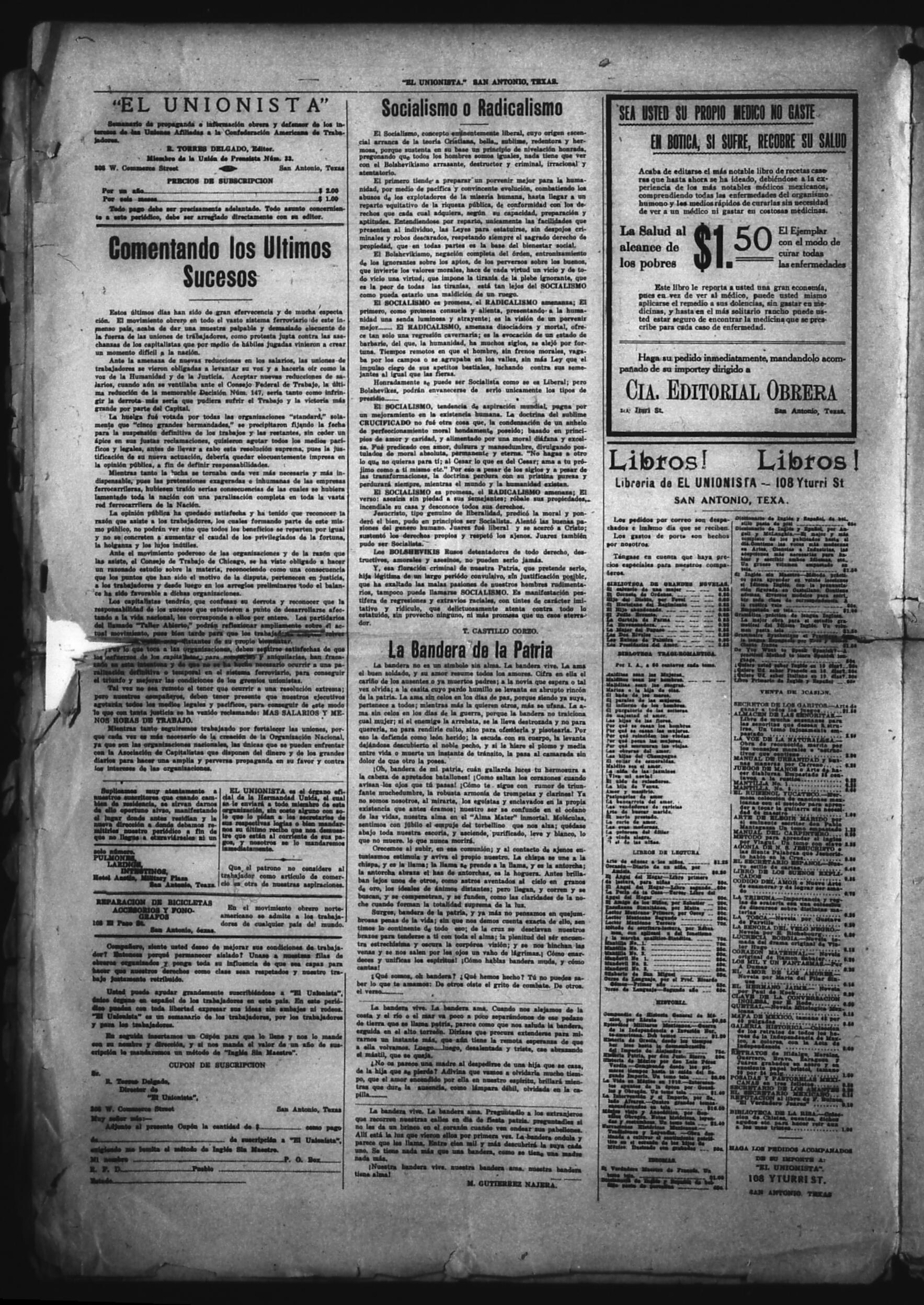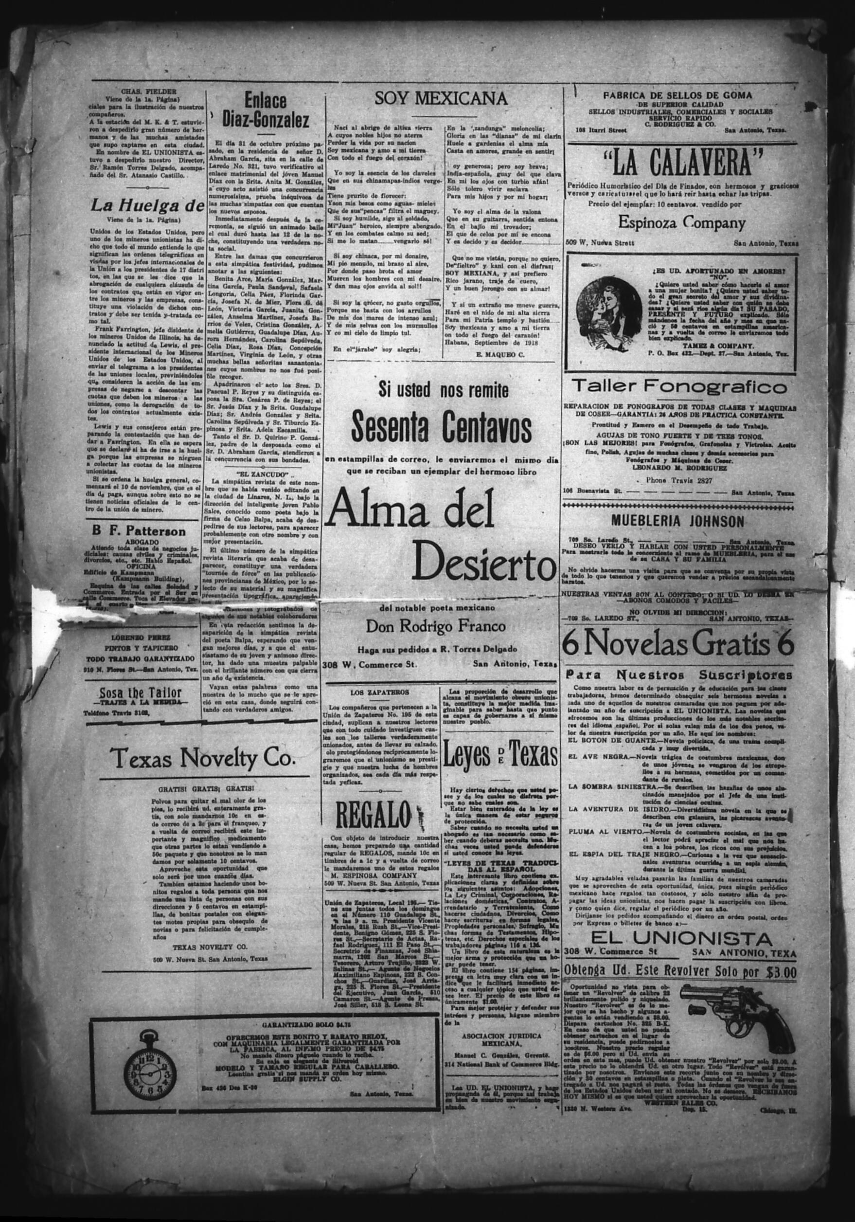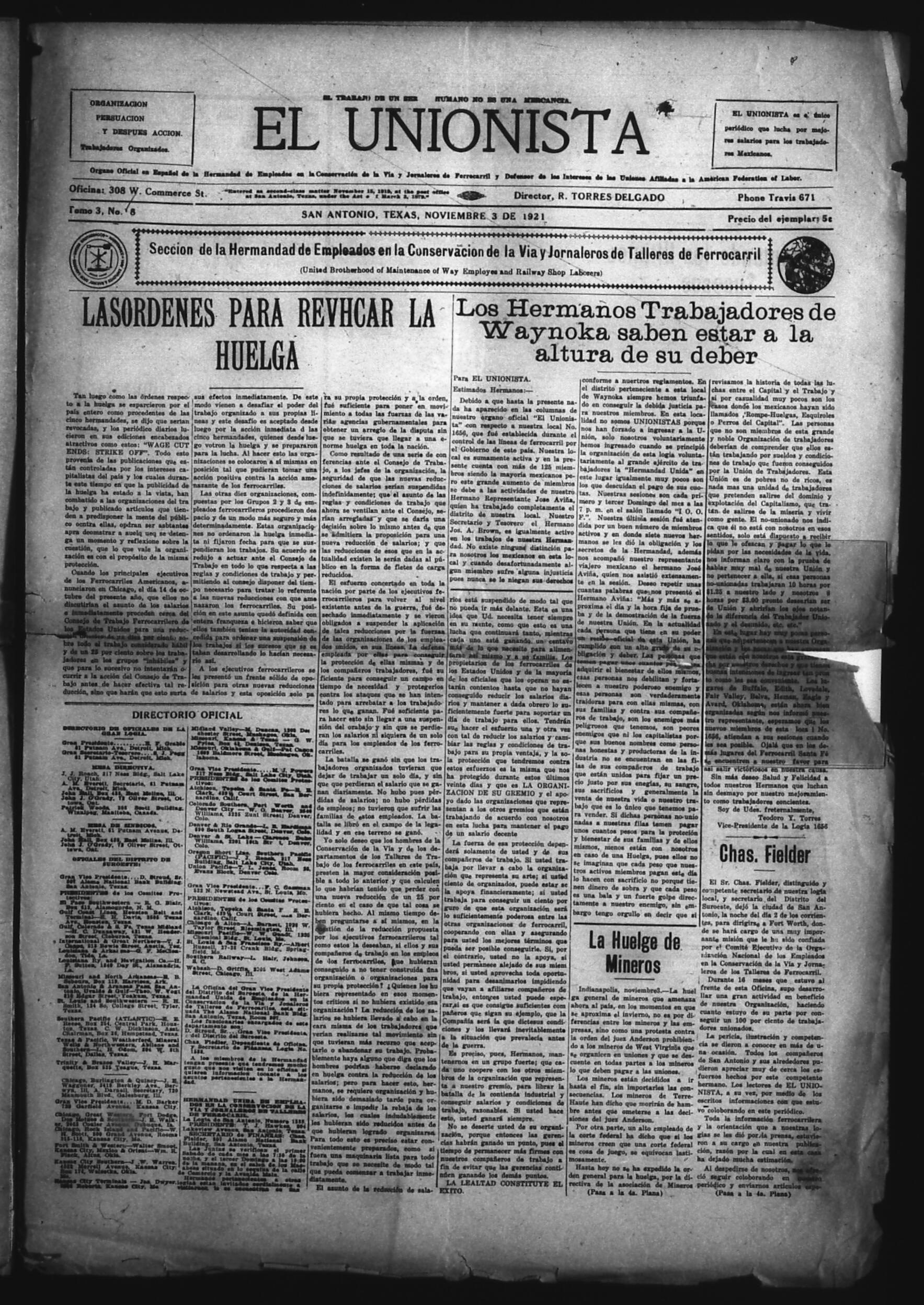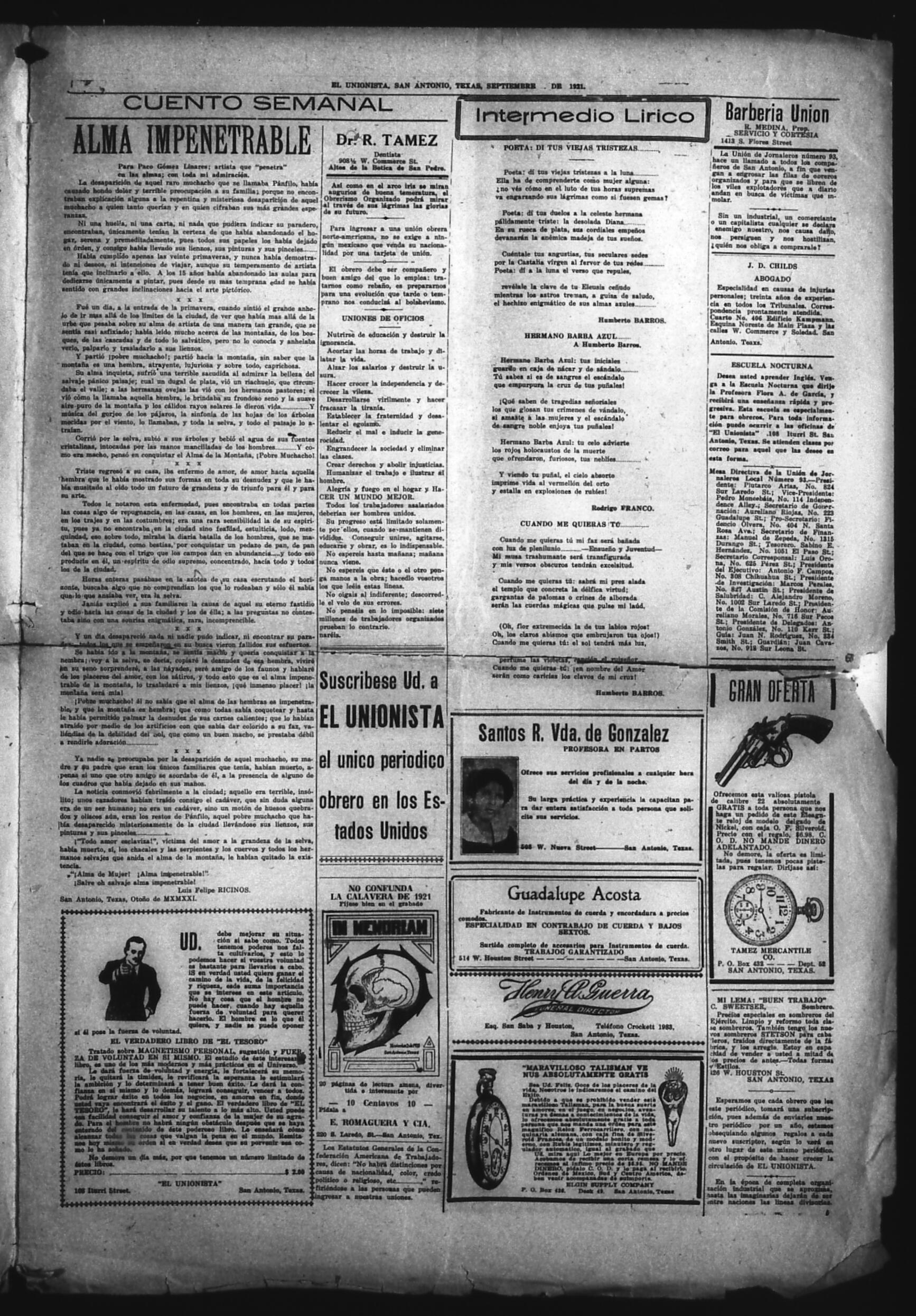 El Unionista (San Antonio, Texas, United States), 1921, November 3. Periodicals in the US-Mexico Border Region. https://latinonewspapers.com/s/eng/item/83451.