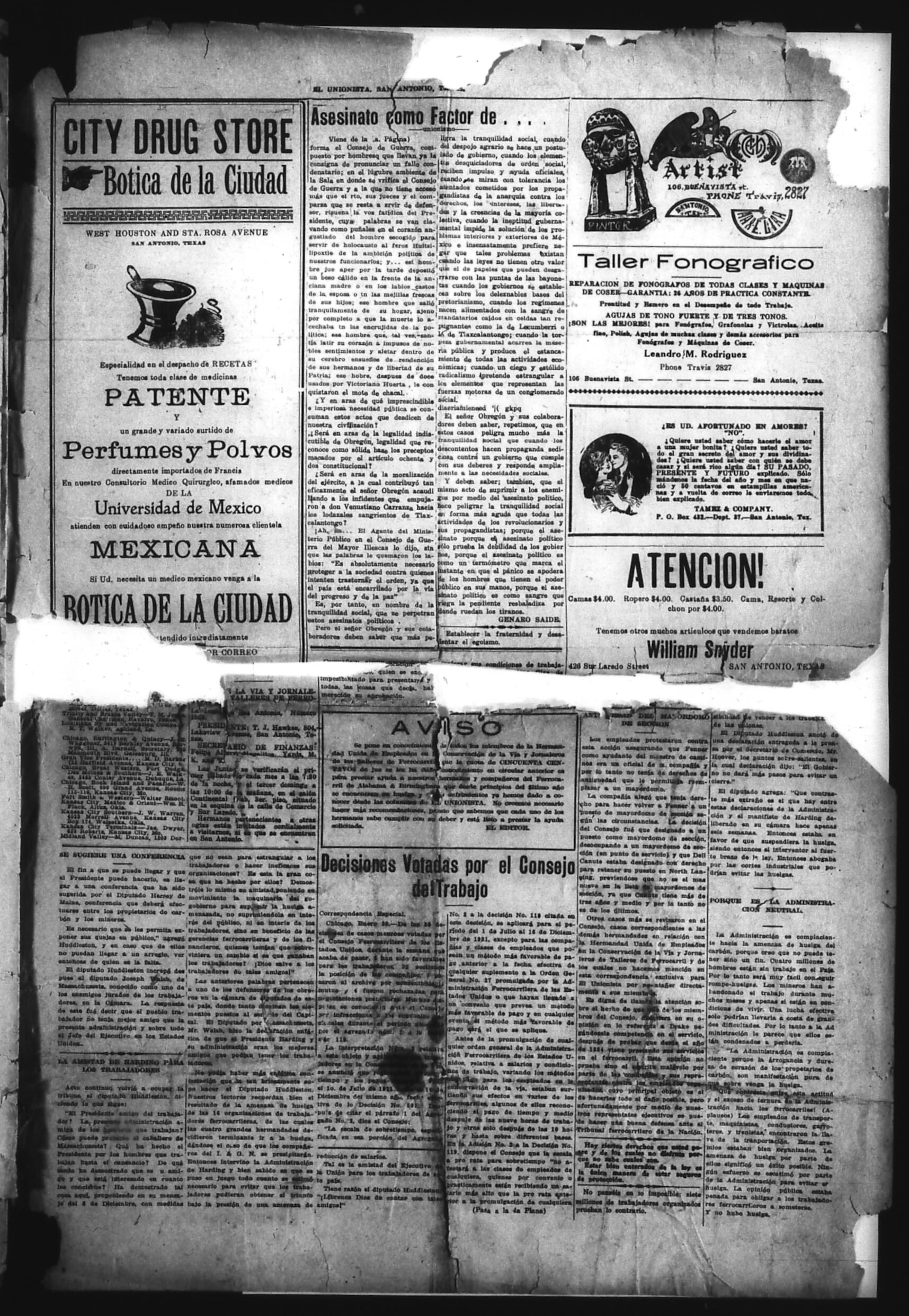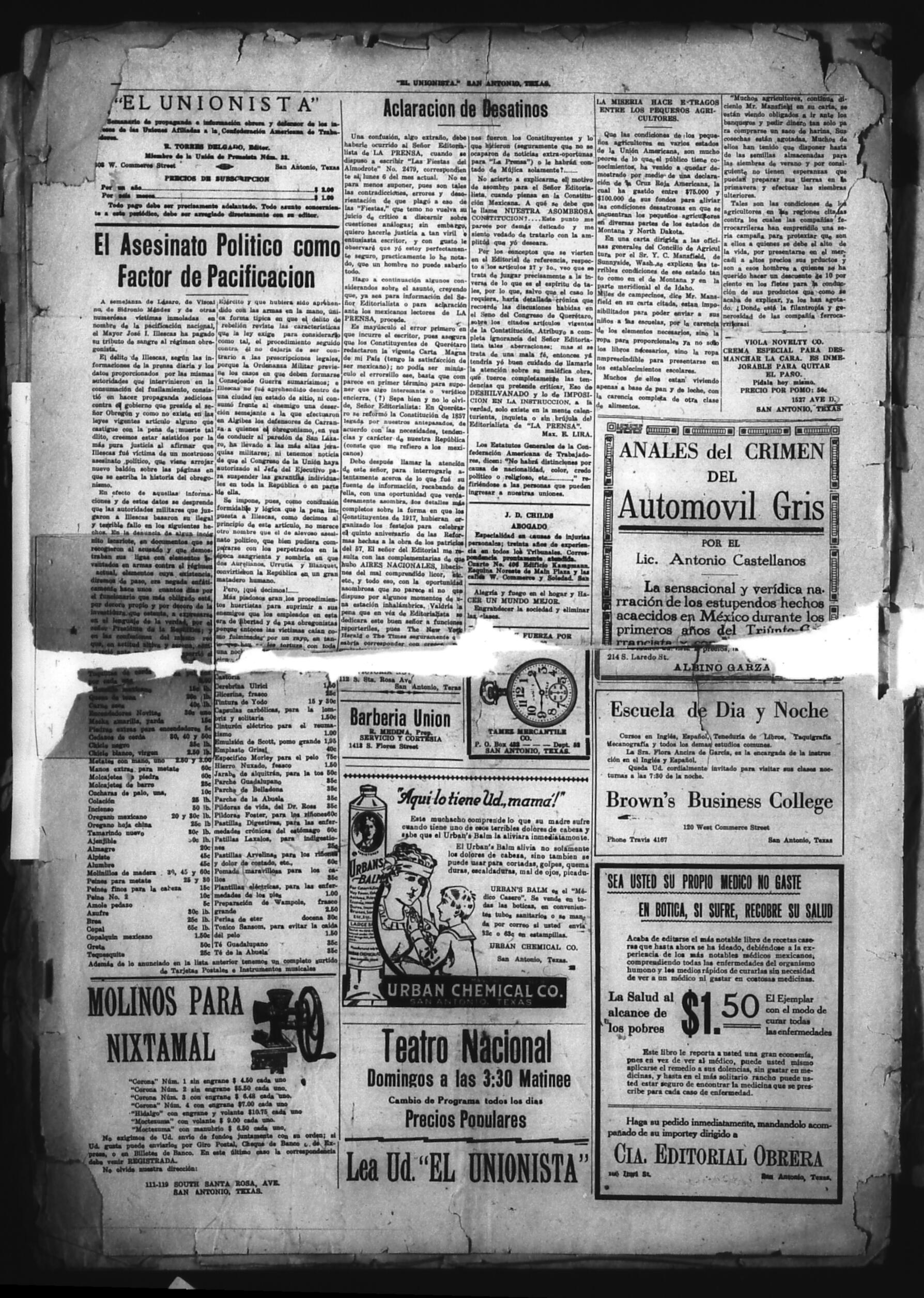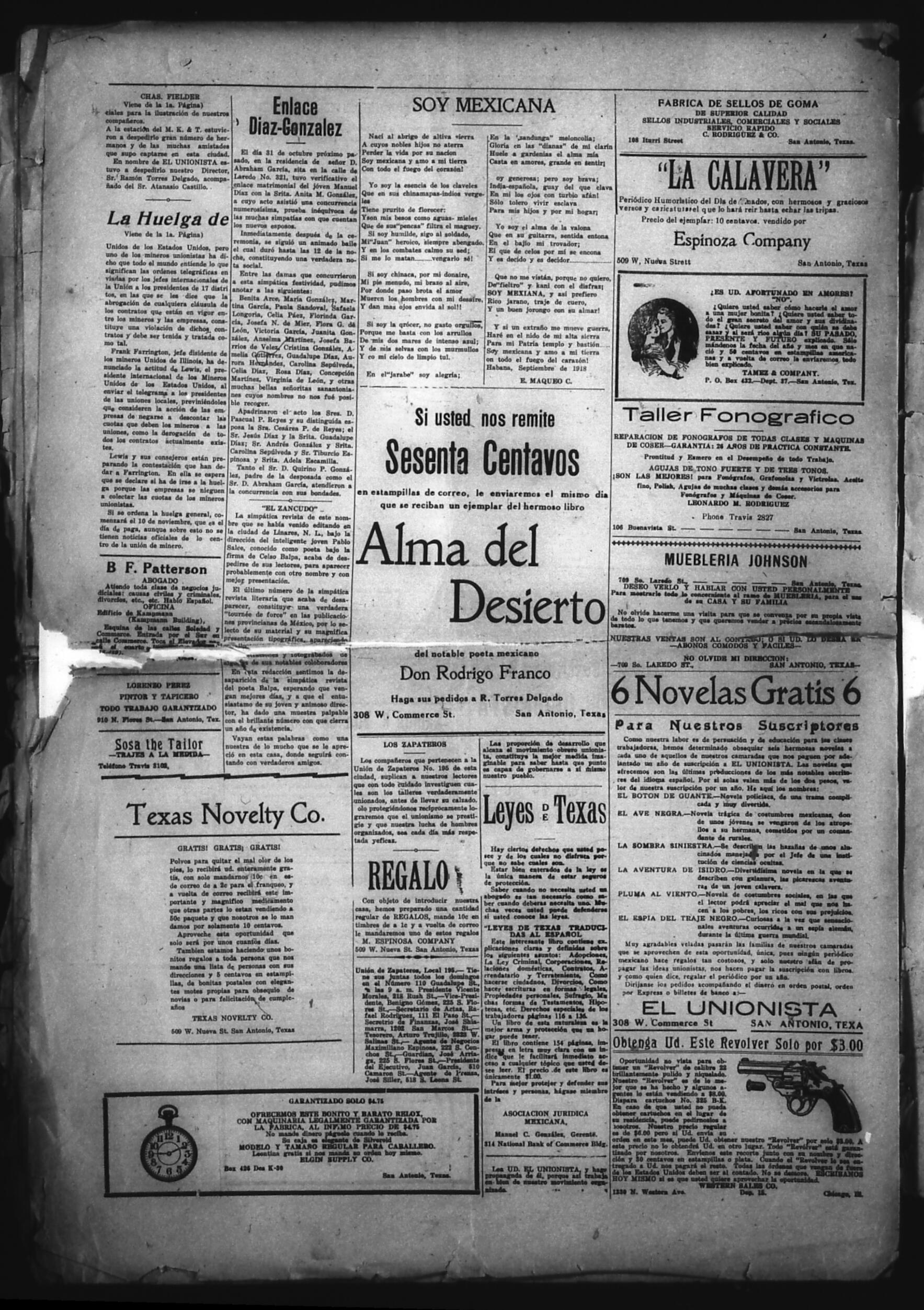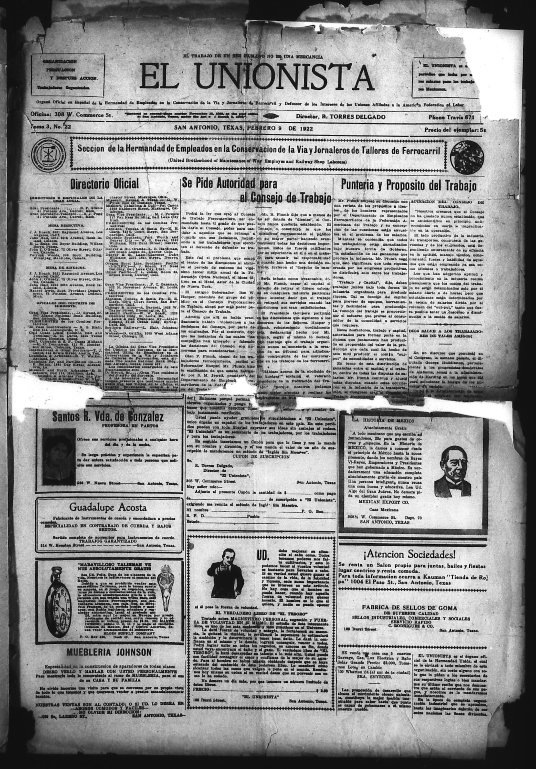 El Unionista (San Antonio, Texas, United States), 1922, February 9. Periodicals in the US-Mexico Border Region. https://latinonewspapers.com/s/eng/item/83452.
