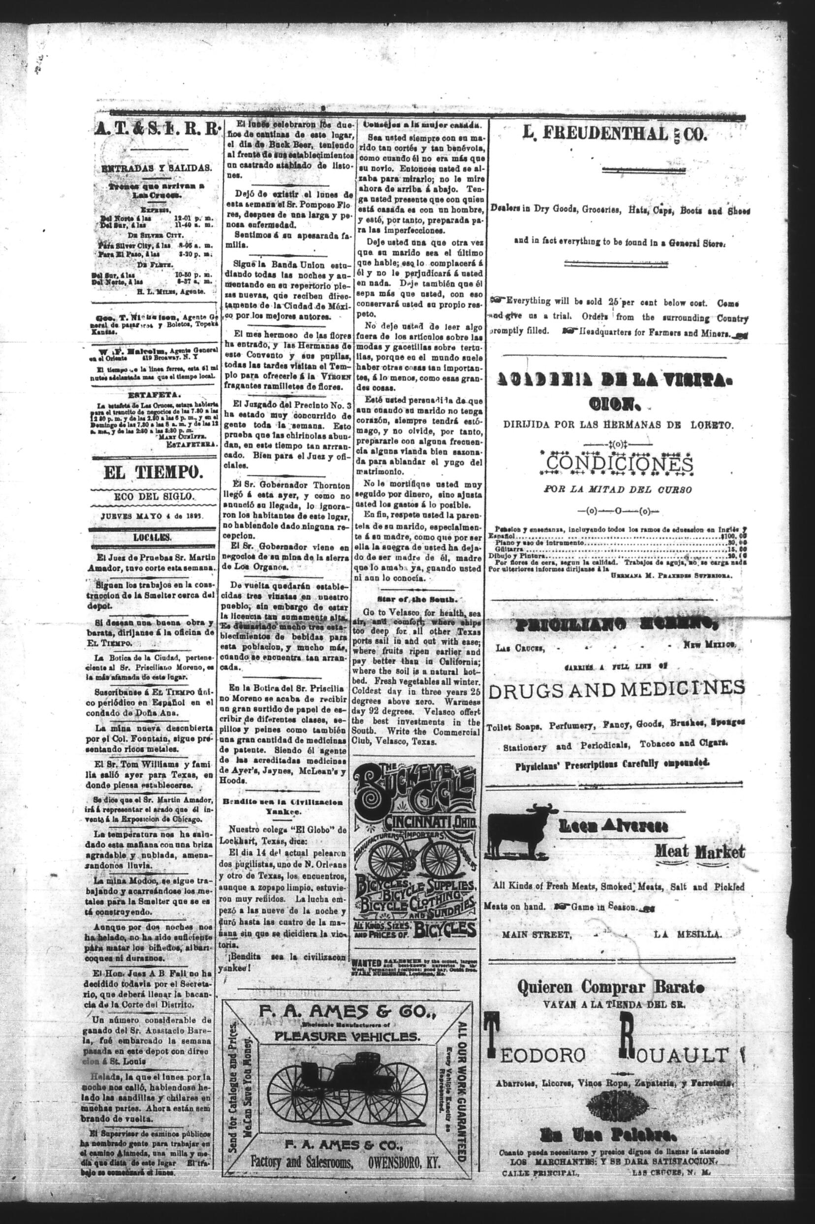 El Tiempo (Las Cruces, New Mexico, United States), 1893, May 4. Periodicals in the US-Mexico Border Region. https://latinonewspapers.com/s/eng/item/86368.