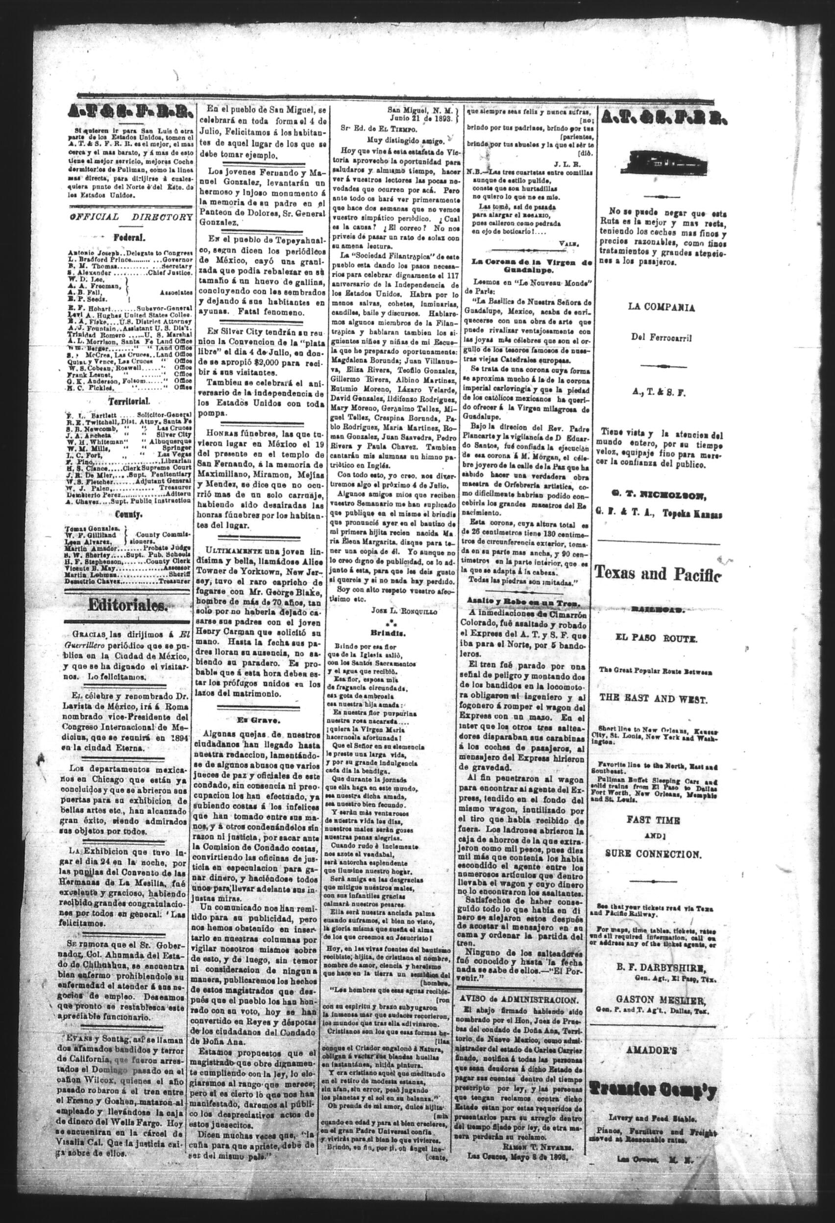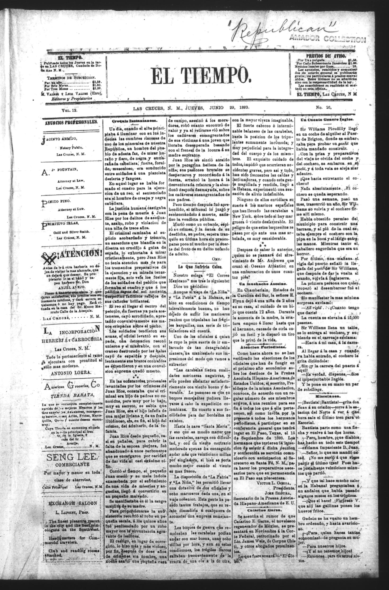 El Tiempo (Las Cruces, New Mexico, United States), 1893, June 29. Periodicals in the US-Mexico Border Region. https://latinonewspapers.com/s/eng/item/86370.