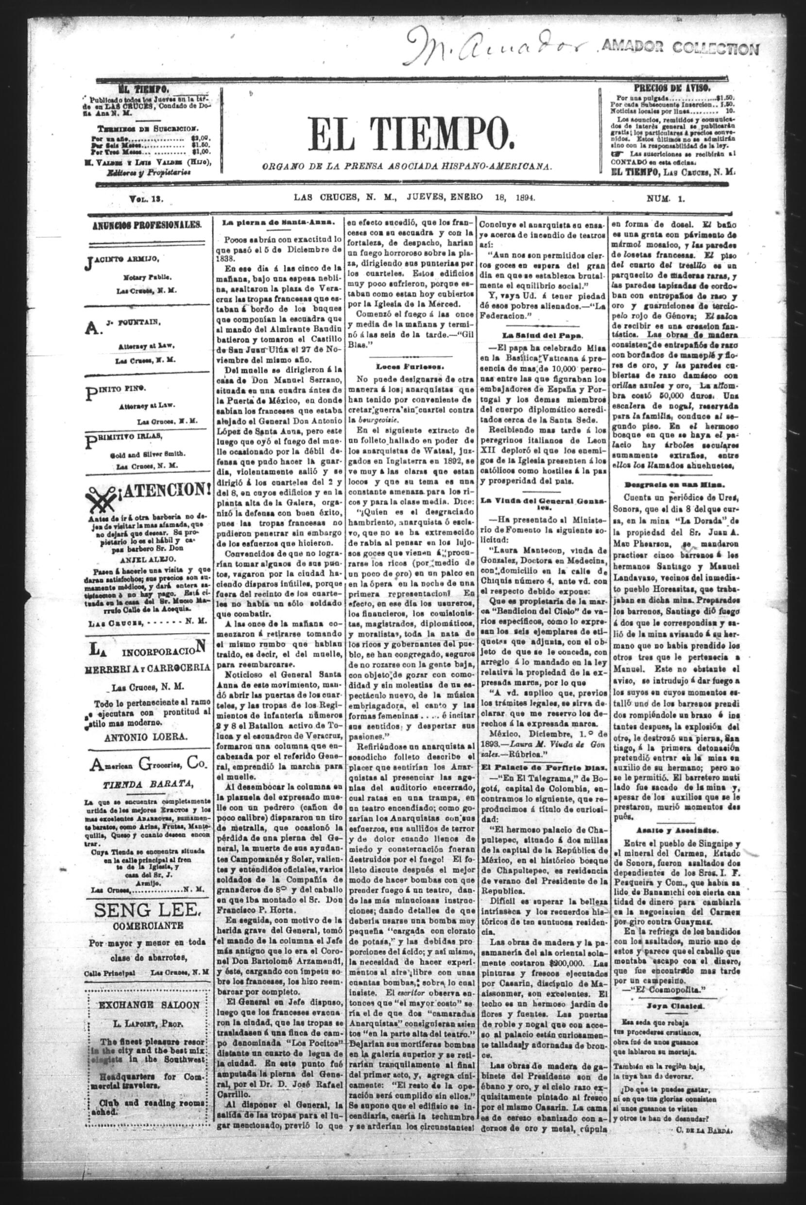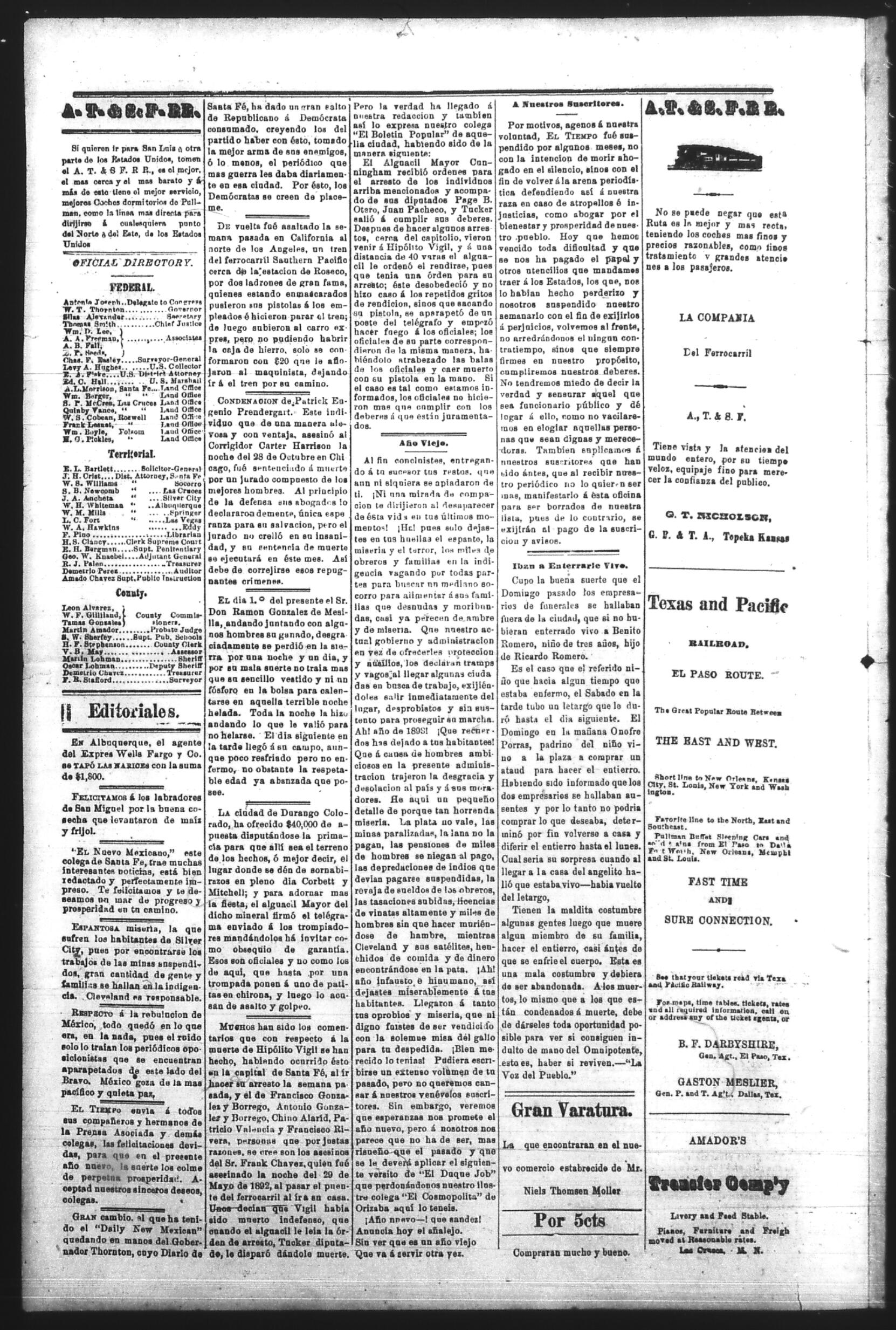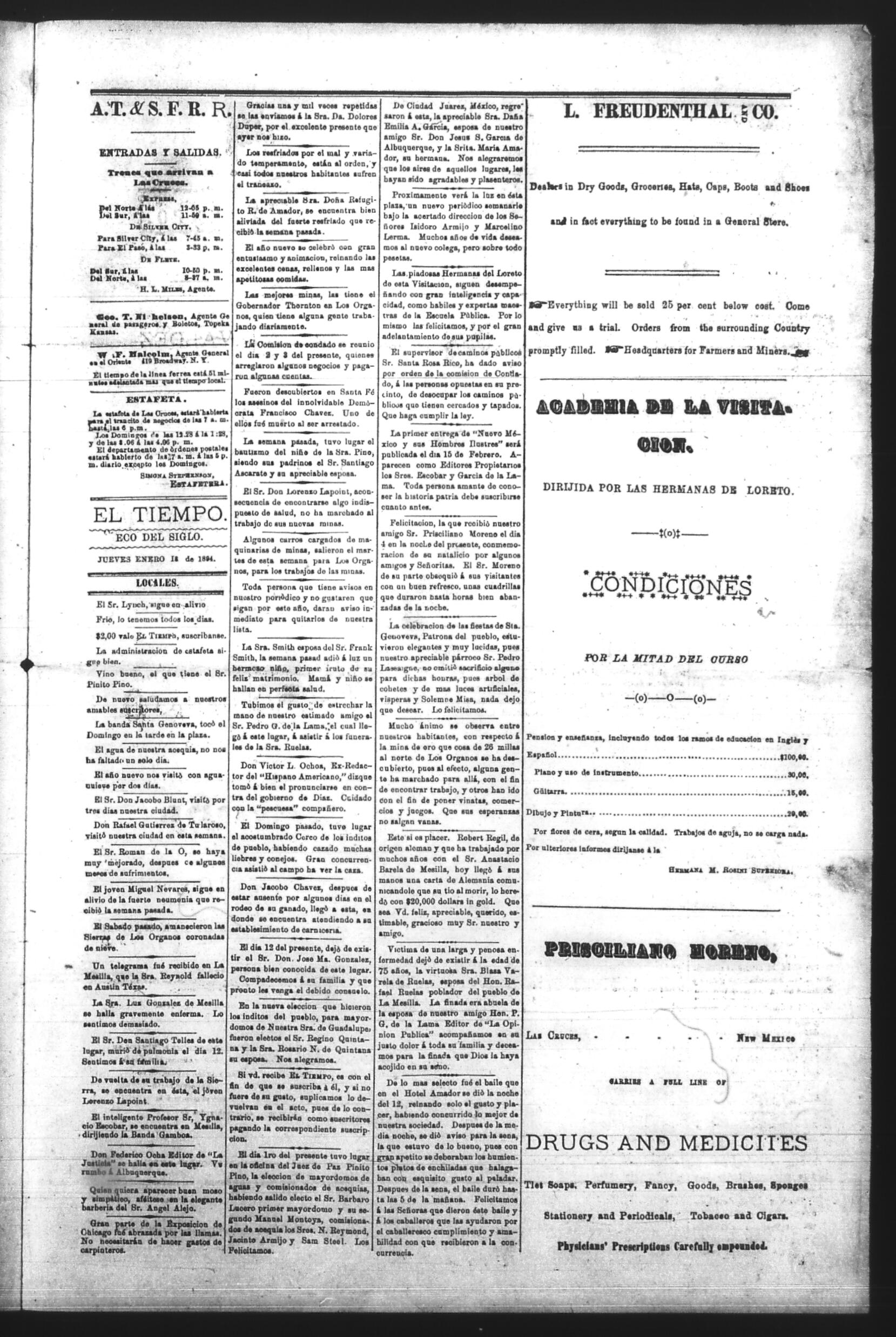 El Tiempo (Las Cruces, New Mexico, United States), 1894, January 18. Periodicals in the US-Mexico Border Region. https://latinonewspapers.com/s/eng/item/86372.