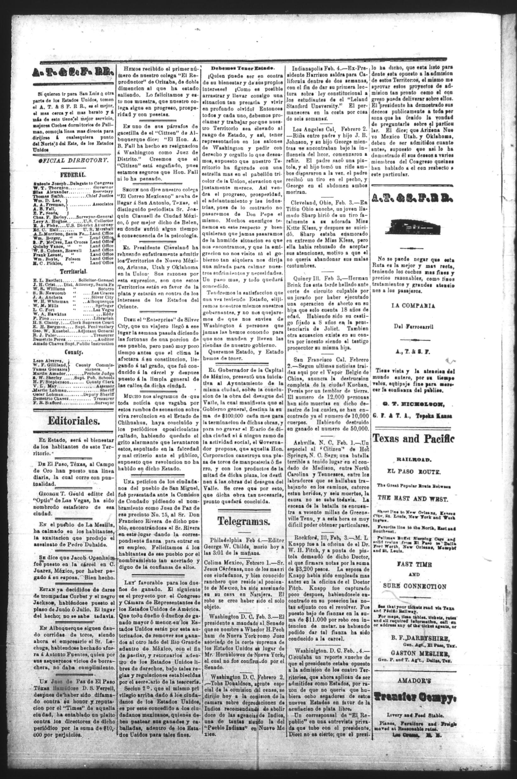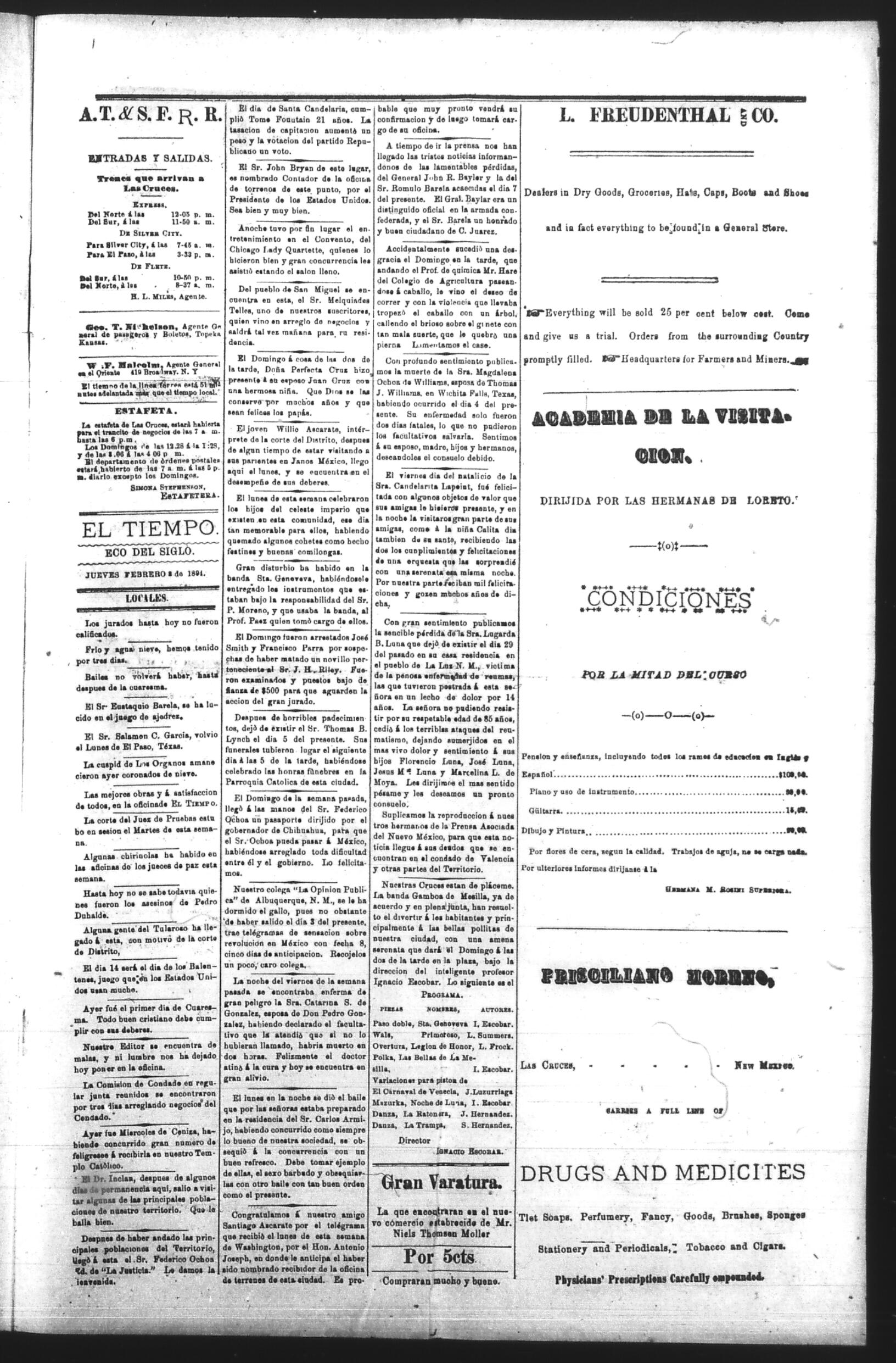 El Tiempo (Las Cruces, New Mexico, United States), 1894, February 8. Periodicals in the US-Mexico Border Region. https://latinonewspapers.com/s/eng/item/86374.