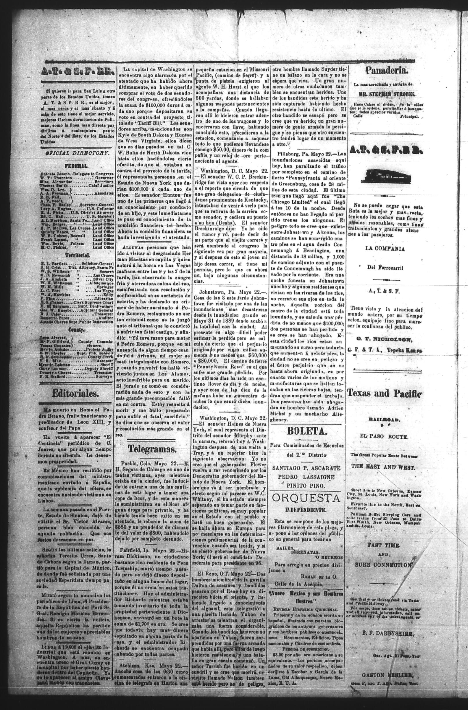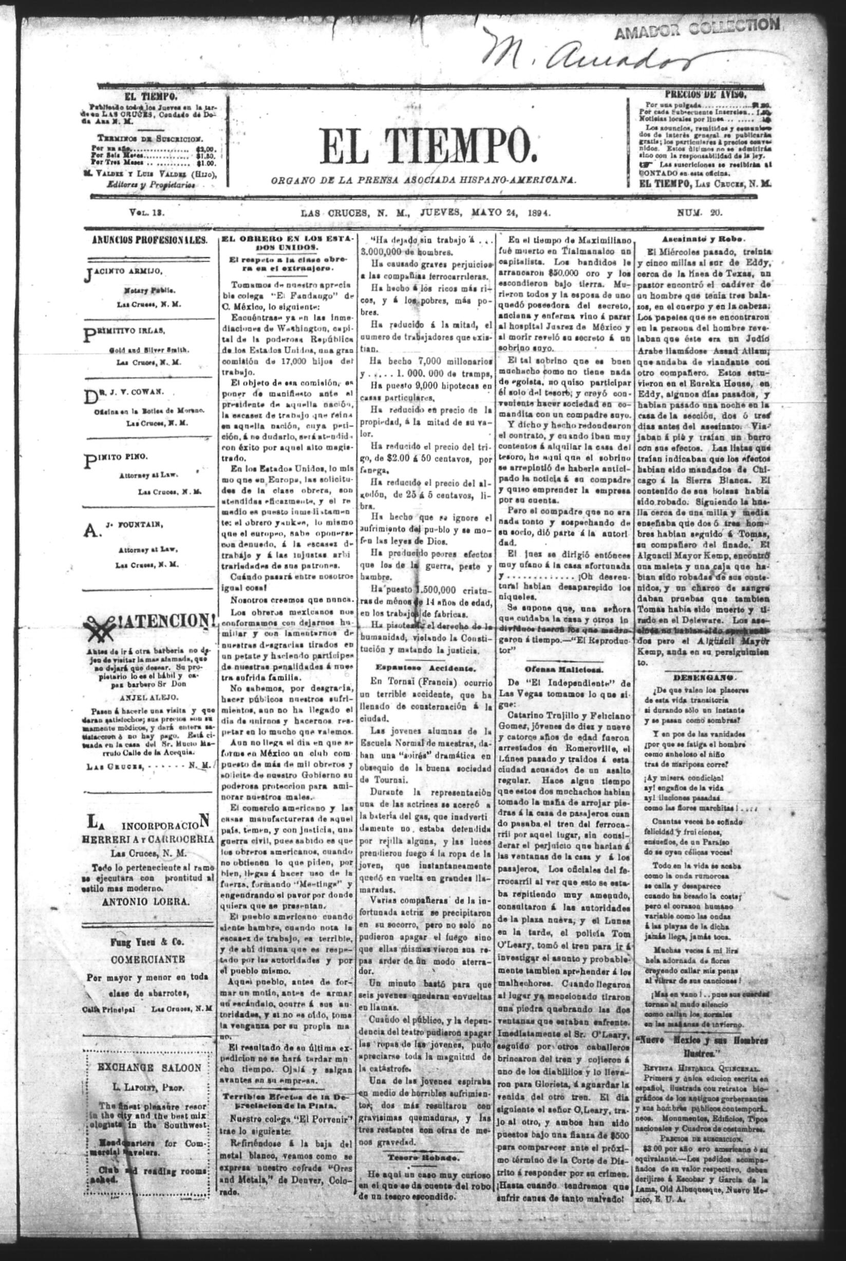 El Tiempo (Las Cruces, New Mexico, United States), 1894, May 24. Periodicals in the US-Mexico Border Region. https://latinonewspapers.com/s/eng/item/86381.