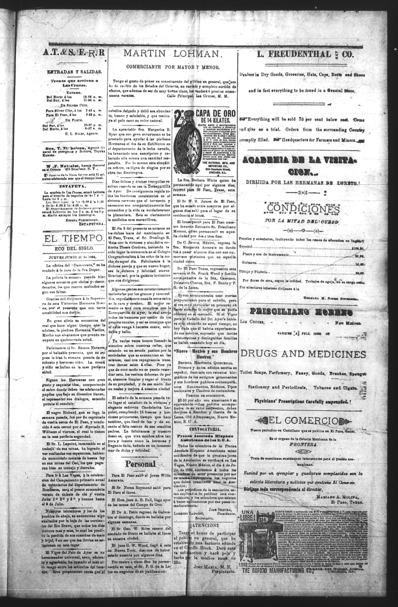 El Tiempo (Las Cruces, New Mexico, United States), 1894, June 21. Periodicals in the US-Mexico Border Region. https://latinonewspapers.com/s/eng/item/86382.