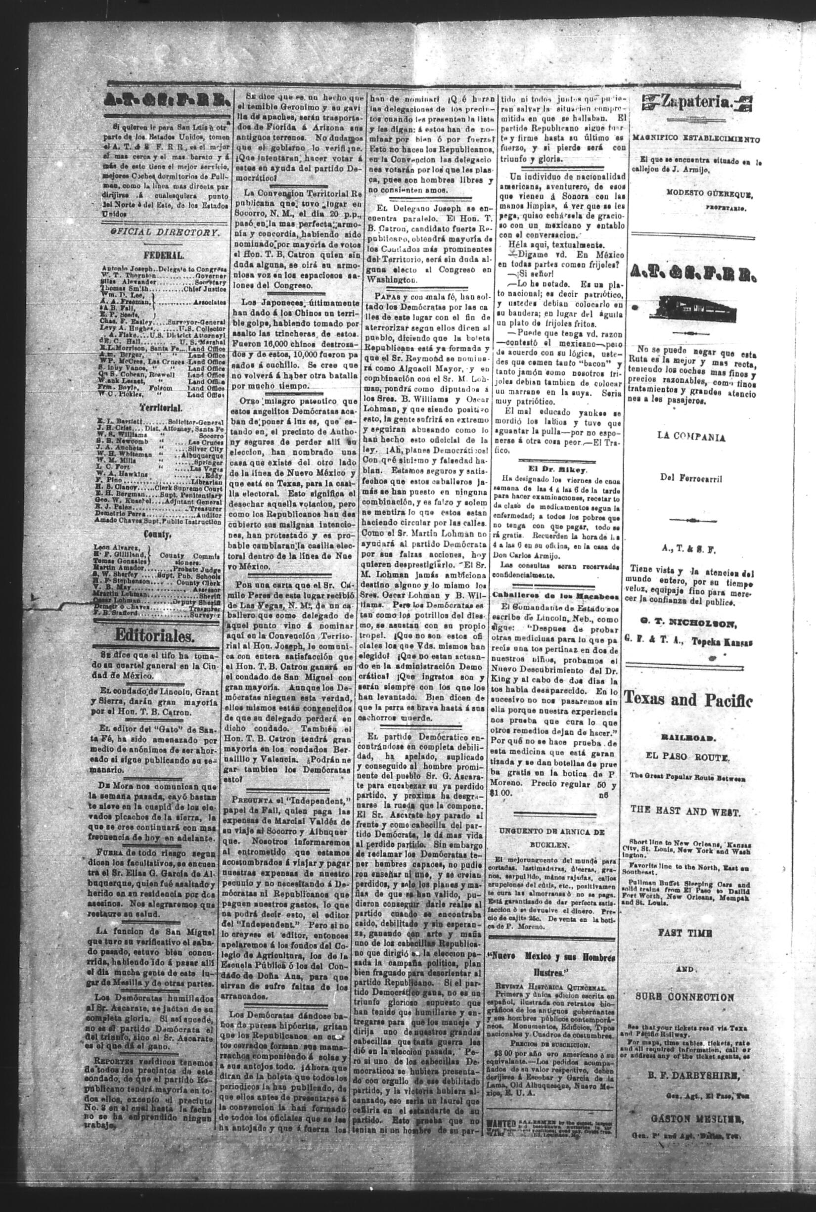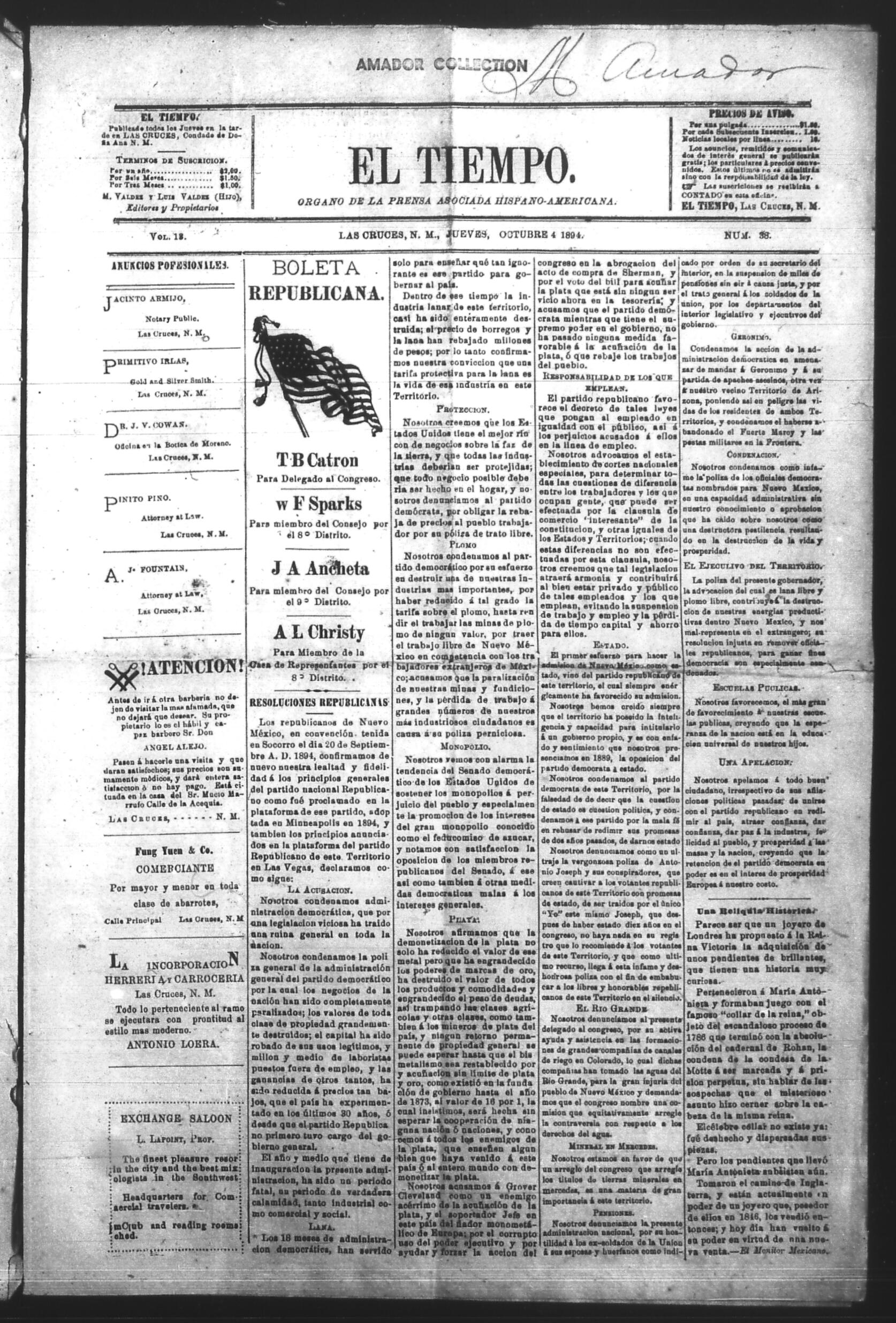 El Tiempo (Las Cruces, New Mexico, United States), 1894, October 4. Periodicals in the US-Mexico Border Region. https://latinonewspapers.com/s/eng/item/86387.