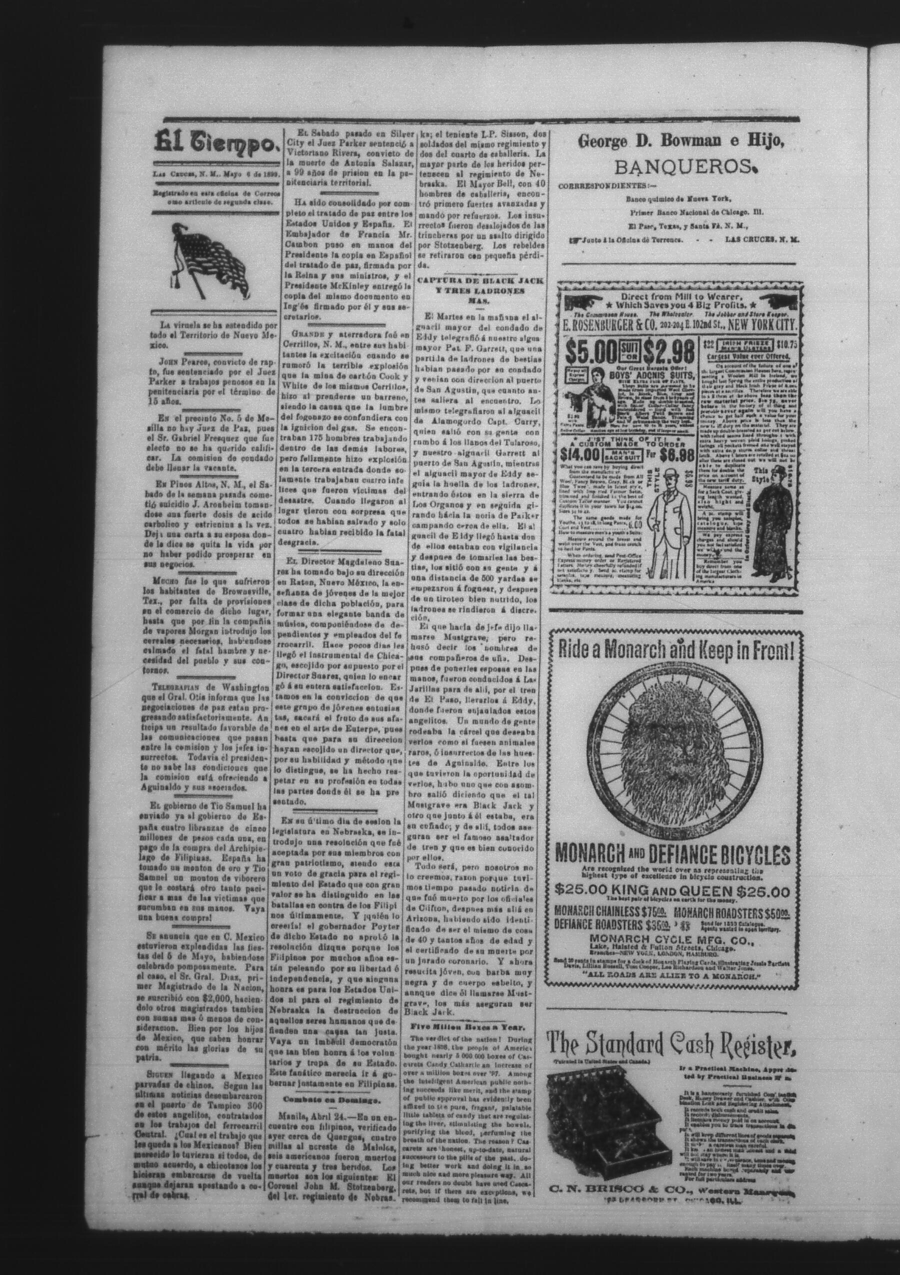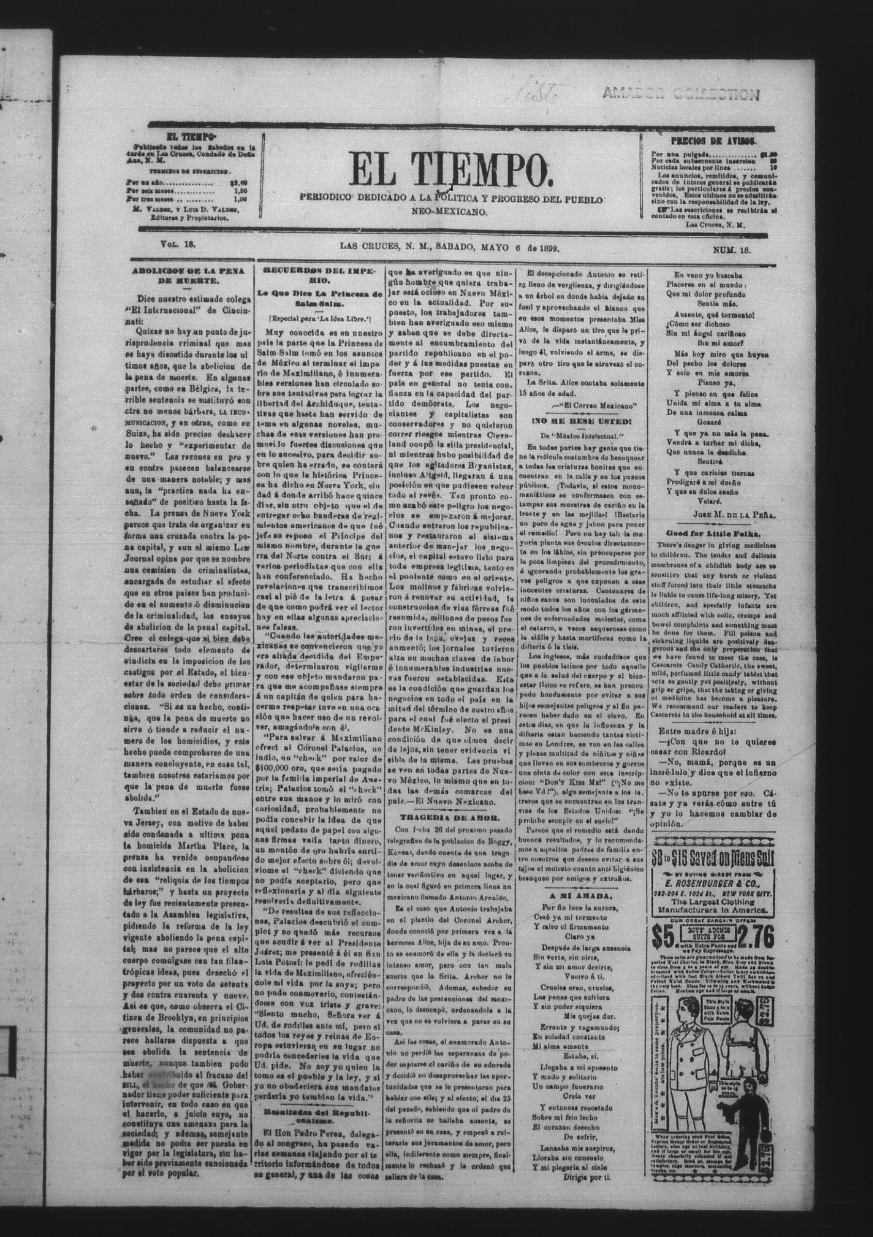 El Tiempo (Las Cruces, New Mexico, United States), 1899, May 6. Periodicals in the US-Mexico Border Region. https://latinonewspapers.com/s/eng/item/86439.