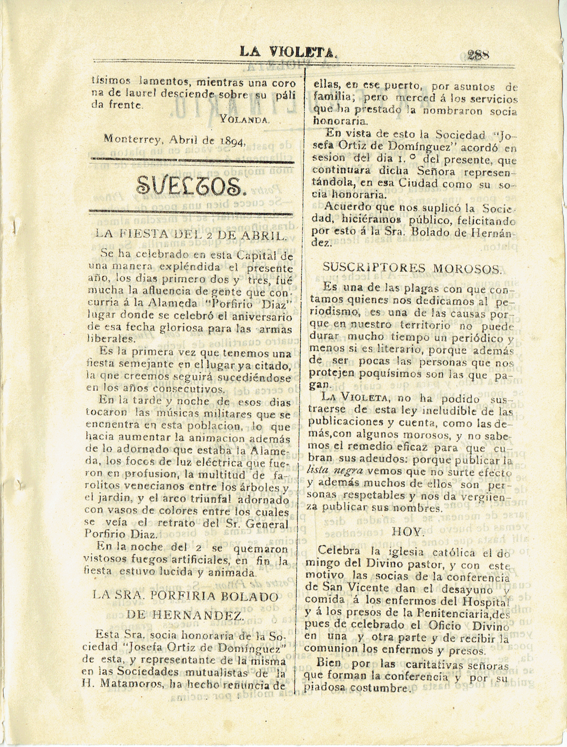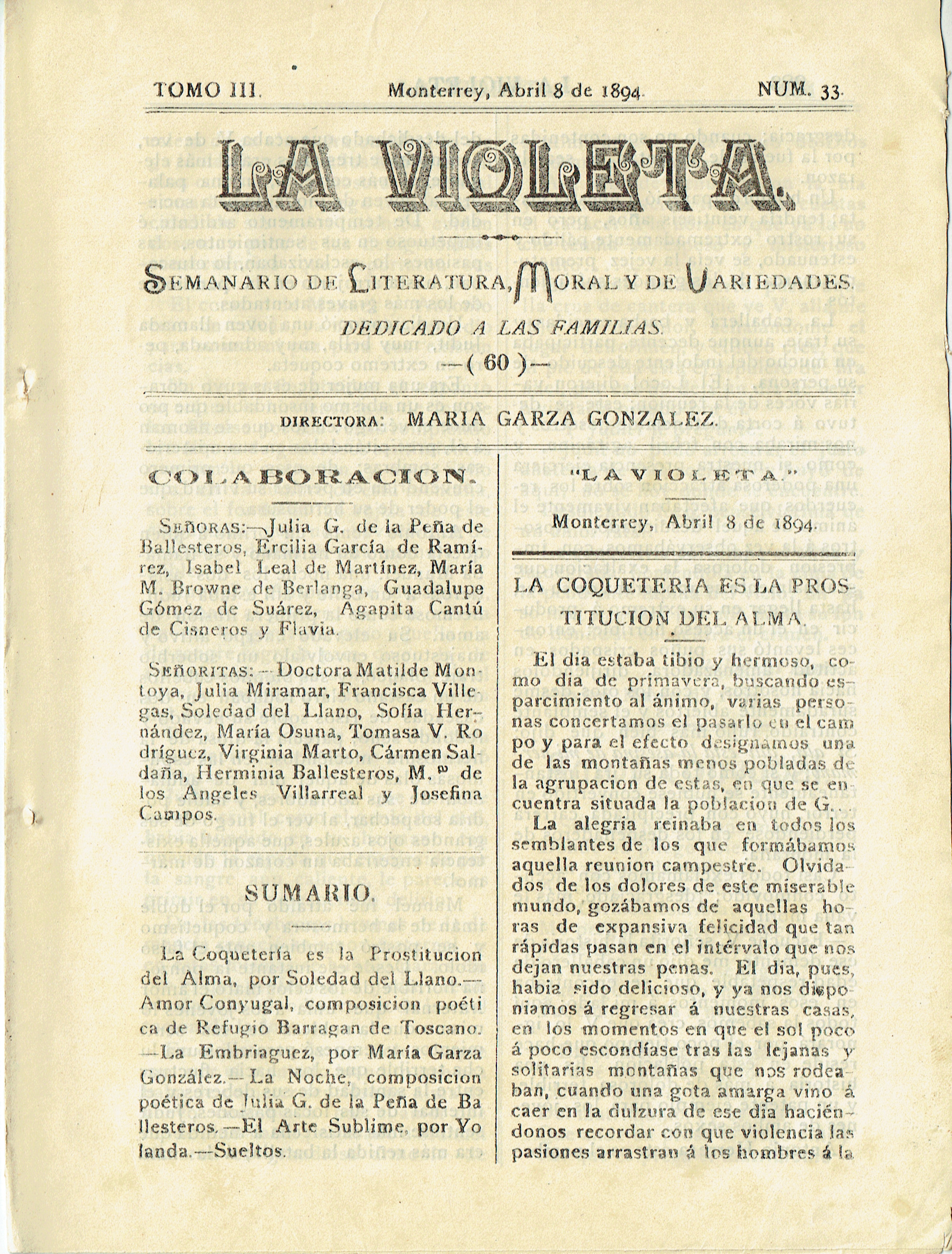 La Violeta (Monterrey, Nuevo León, México), 1894, April 8. Periódicos de la frontera México-Estados Unidos. https://latinonewspapers.com/s/es/item/3469.