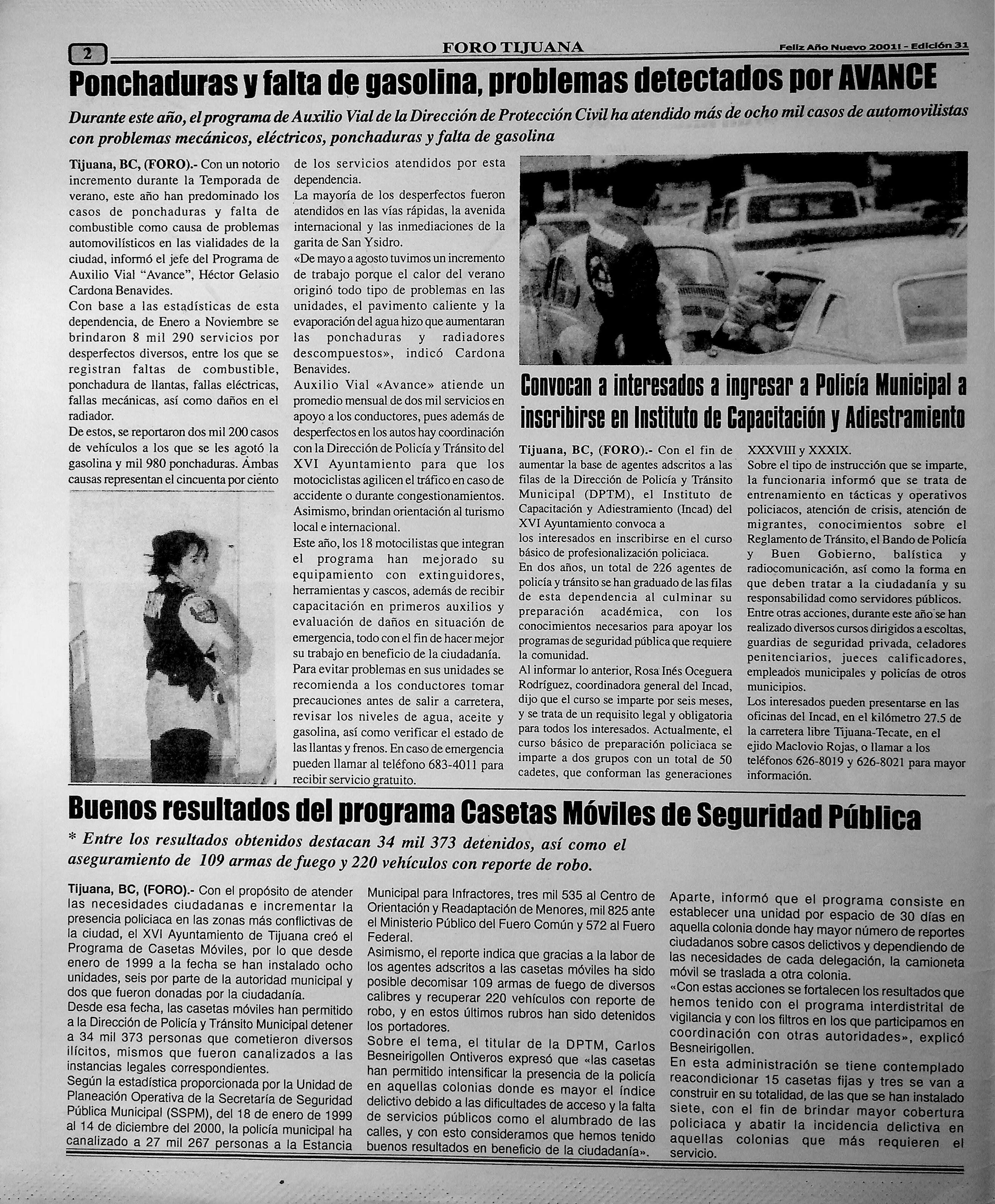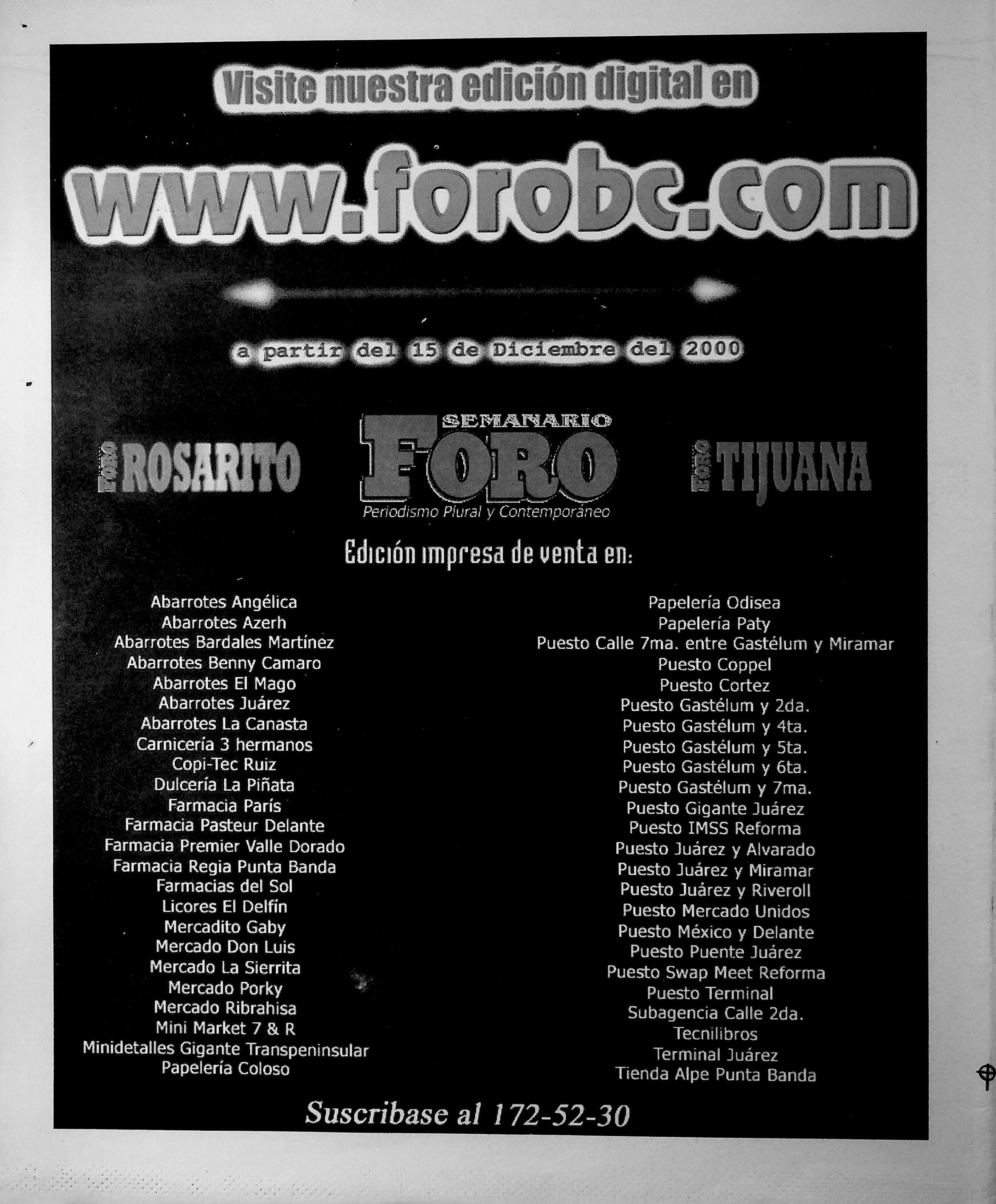 Foro-Semanario (Tijuana, Baja California, México), 2001, January 1. Periódicos de la frontera México-Estados Unidos. https://latinonewspapers.com/s/es/item/36067.