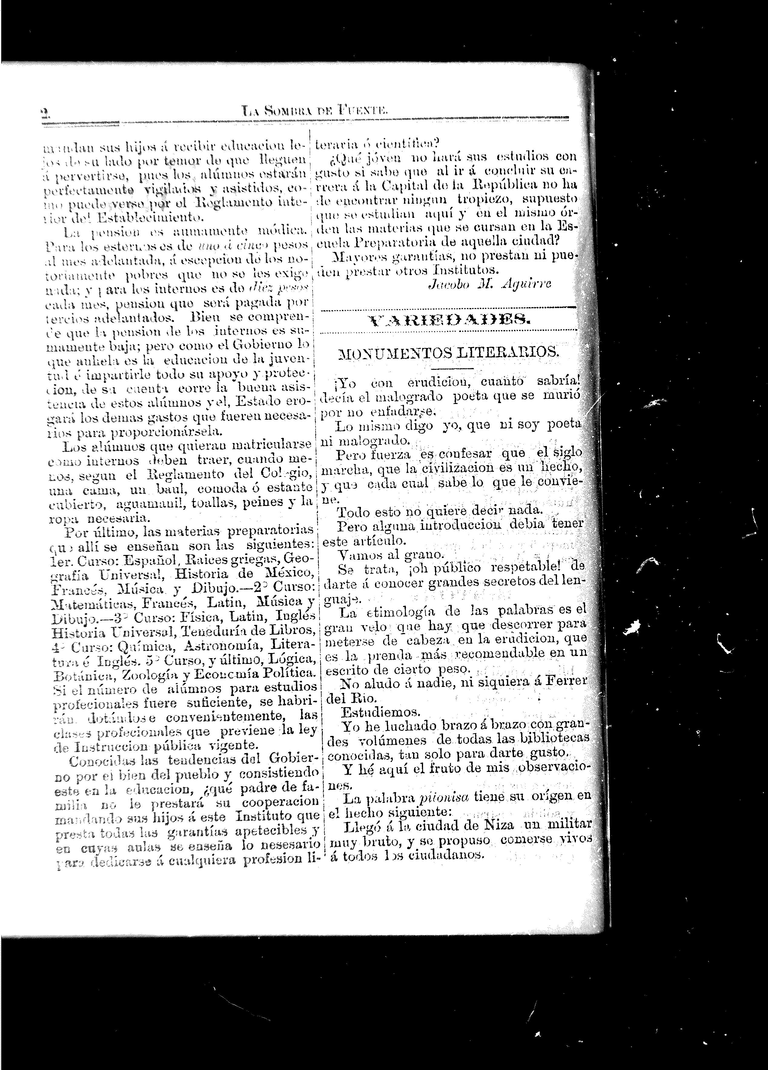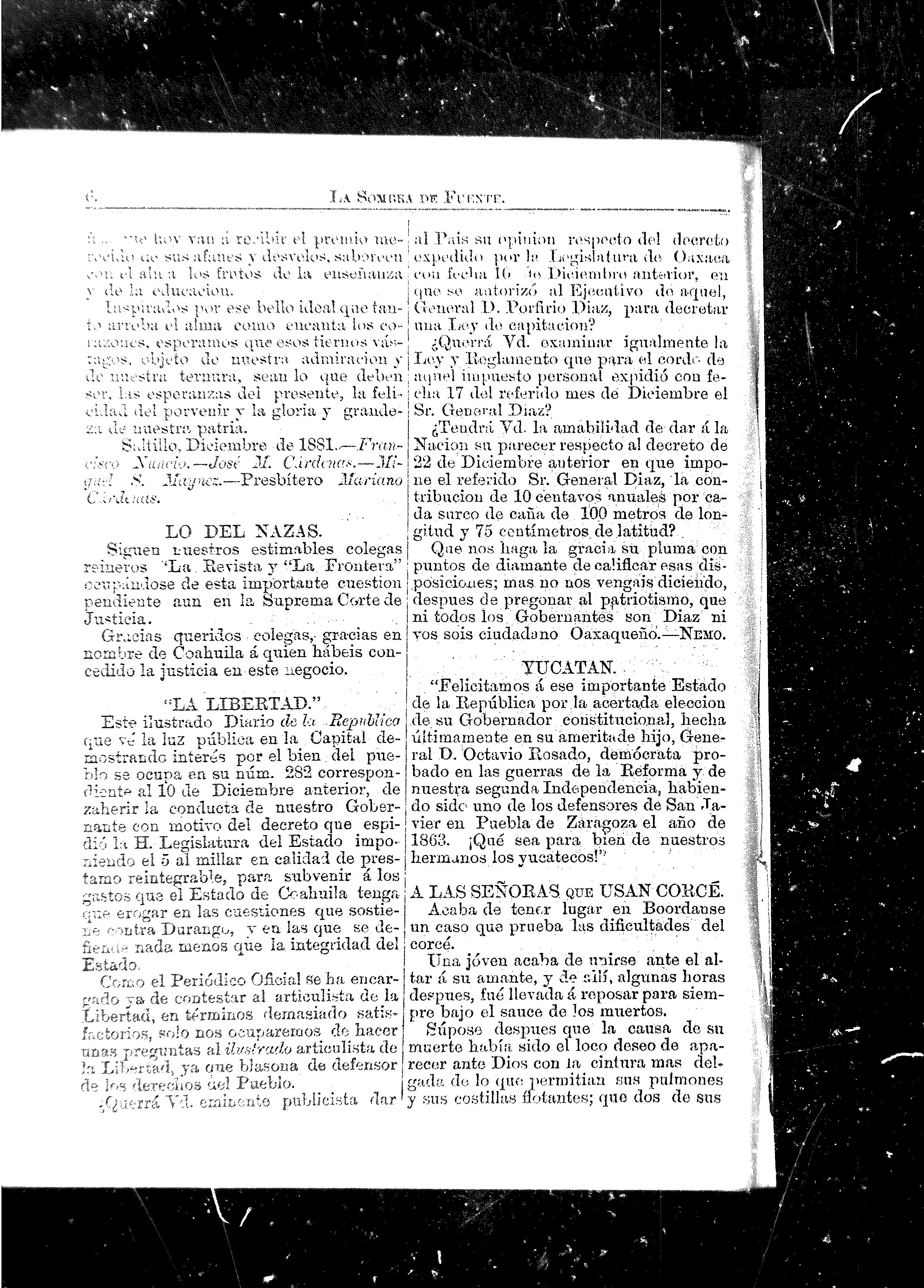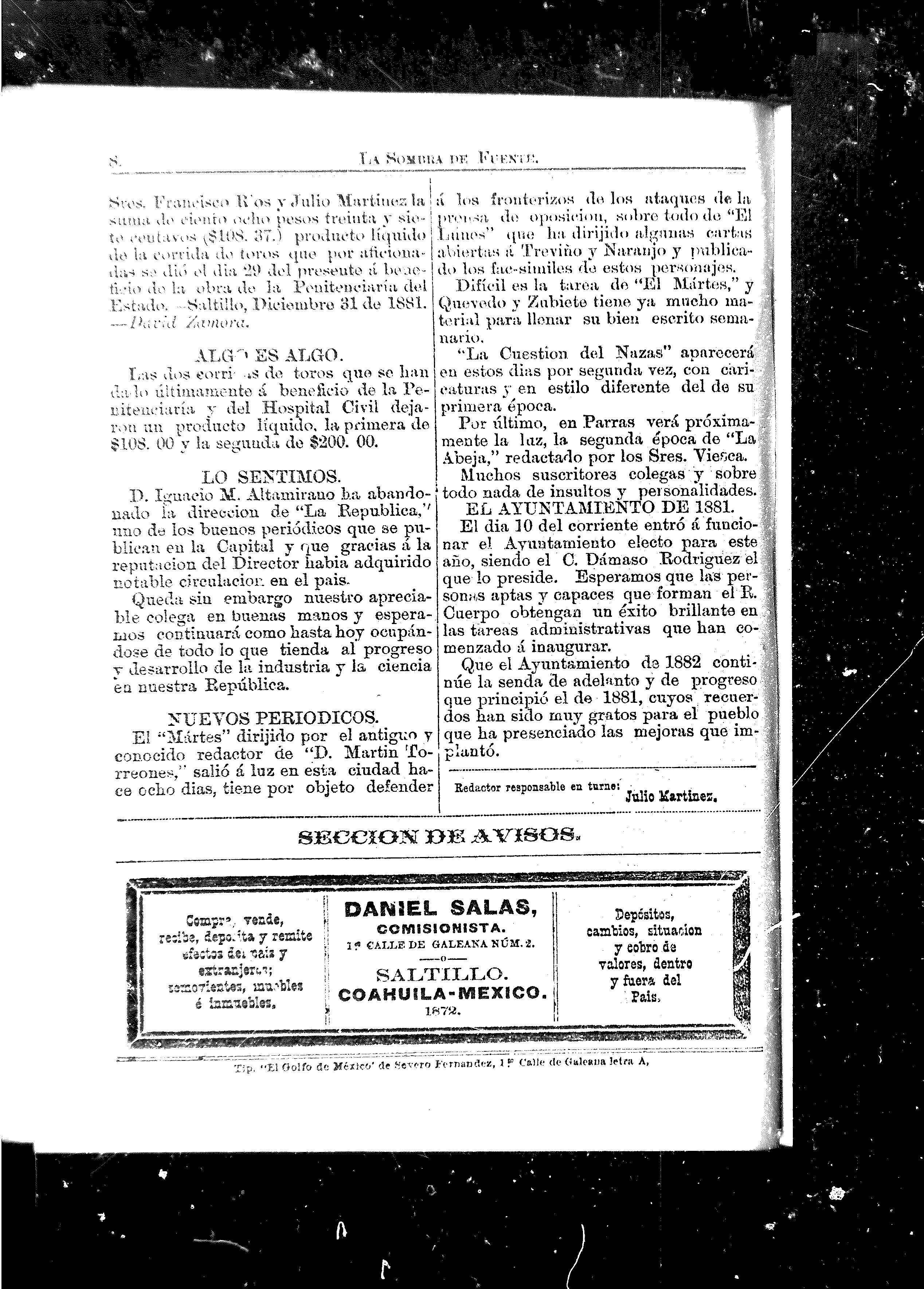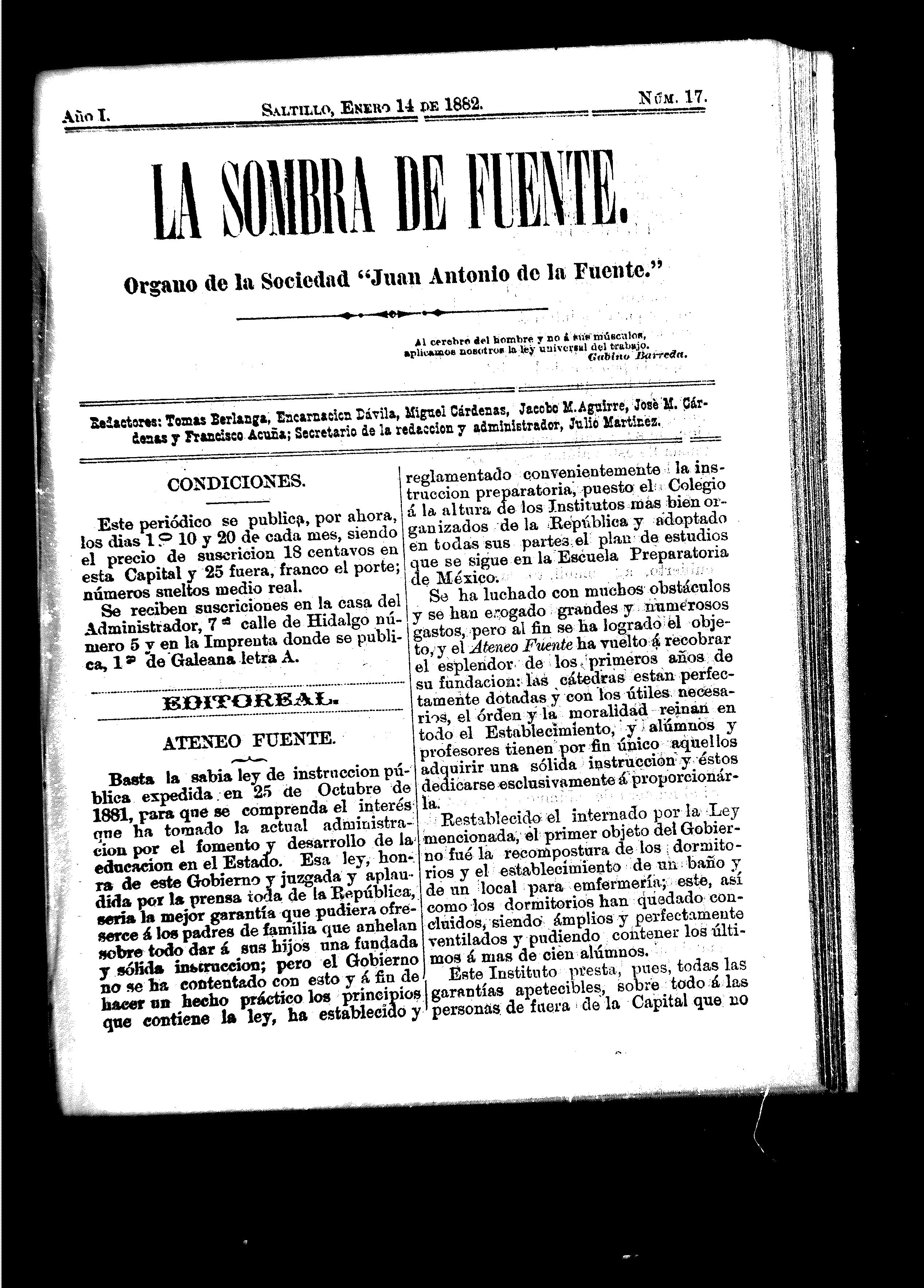 La Sombra de Fuente (Saltillo, Coahuila, México), 1882, January 14. Periódicos de la frontera México-Estados Unidos. https://latinonewspapers.com/s/es/item/49102.