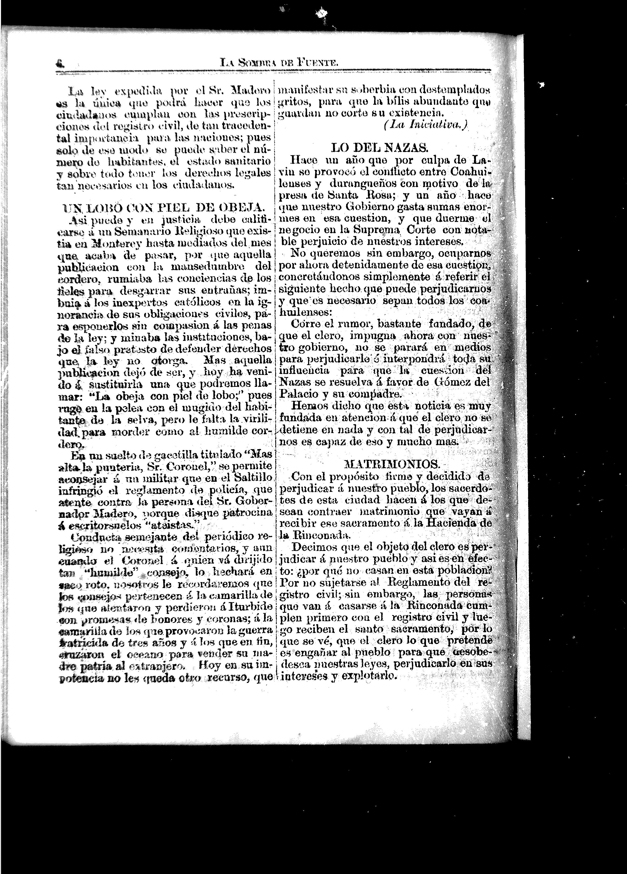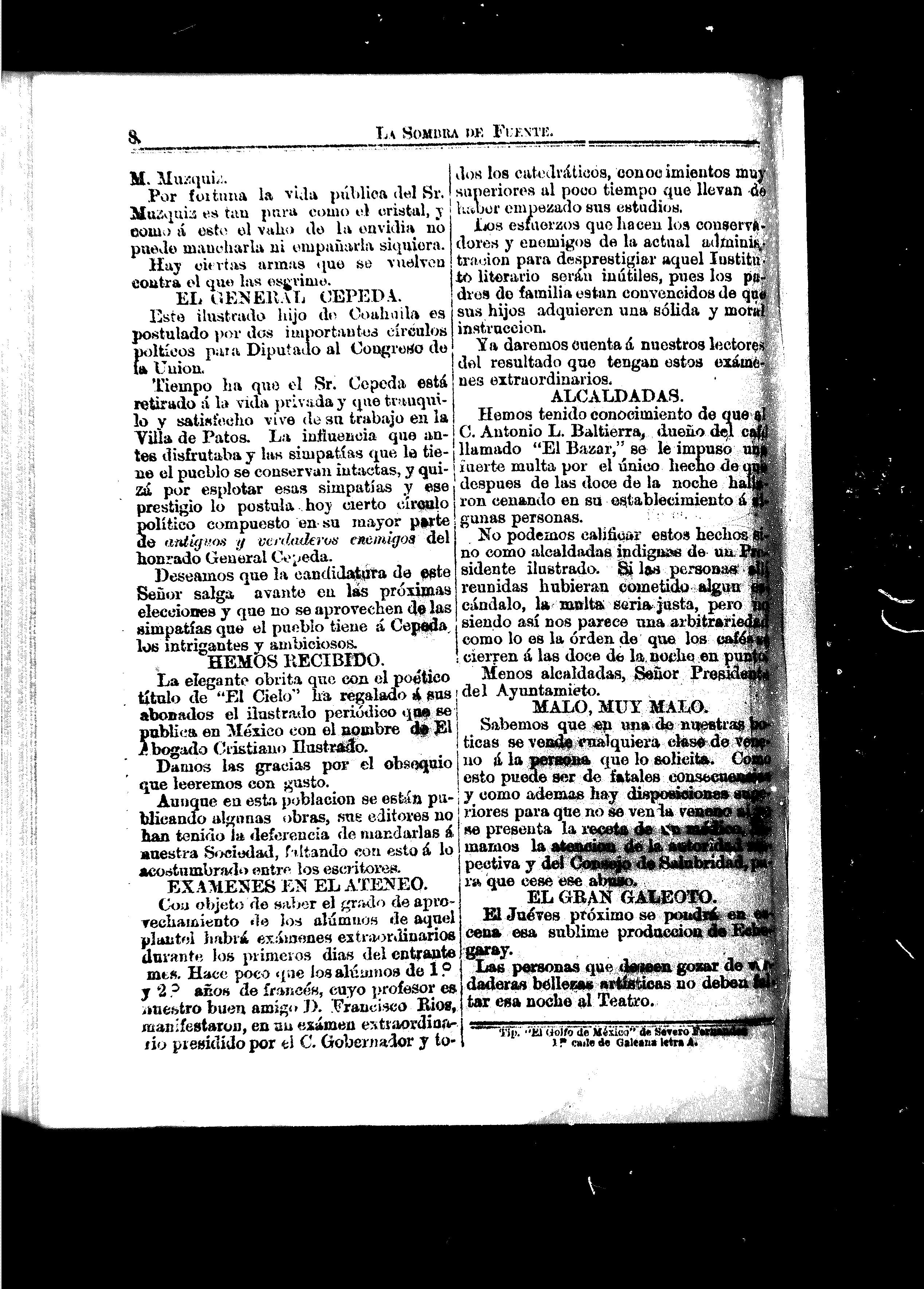 La Sombra de Fuente (Saltillo, Coahuila, México), 1882, May 22. Periódicos de la frontera México-Estados Unidos. https://latinonewspapers.com/s/es/item/49110.