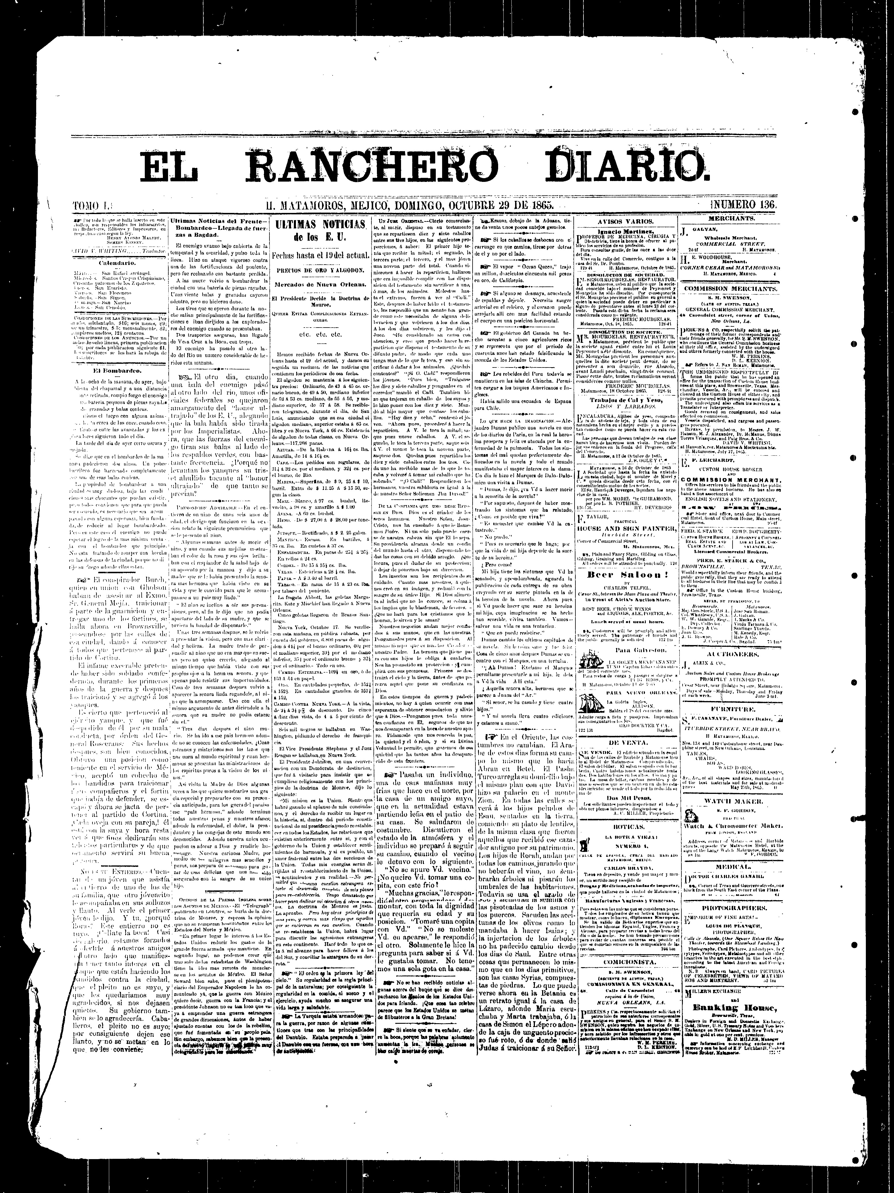 El Diario Ranchero (Matamoros, Tamaulipas, México), 1865, October 29. Periódicos de la frontera México-Estados Unidos. https://latinonewspapers.com/s/es/item/7036.