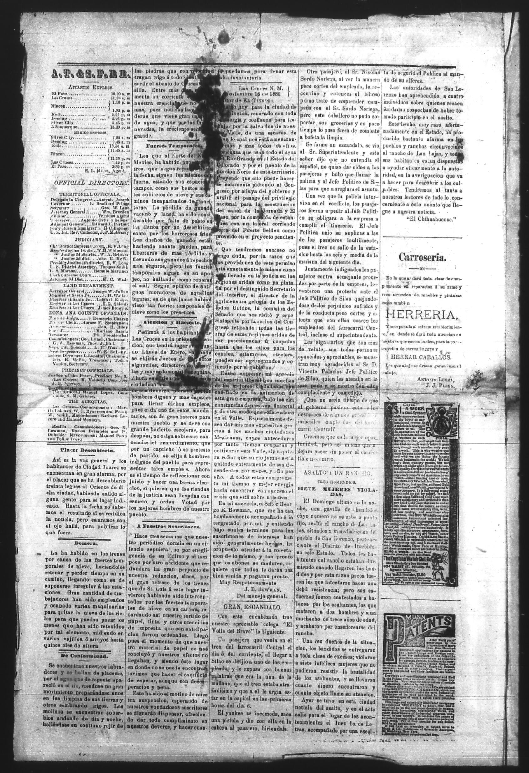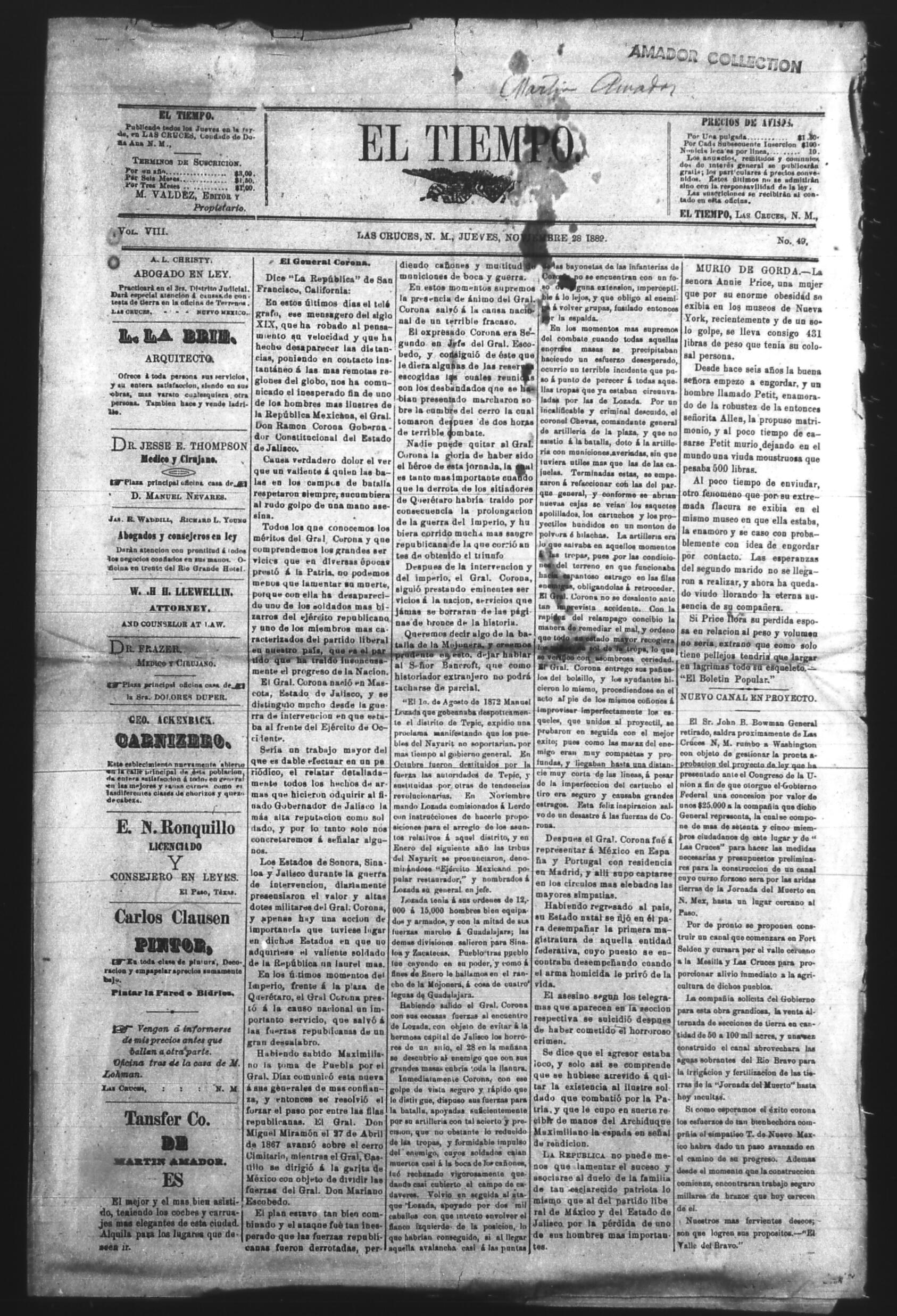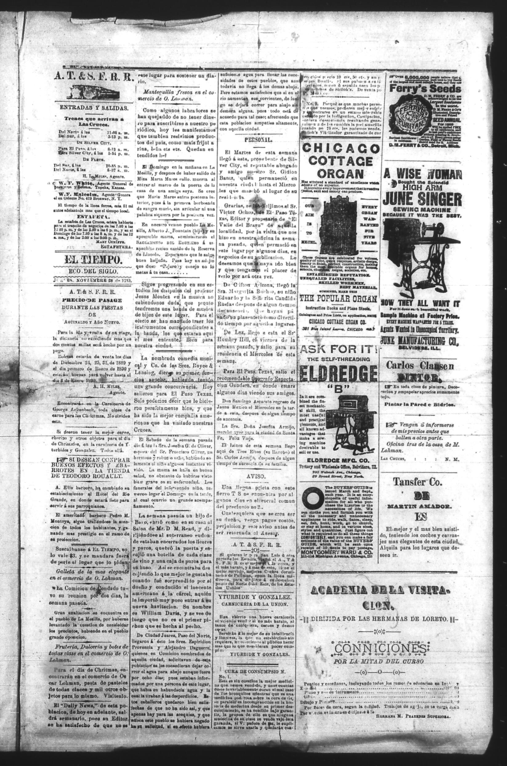 El Tiempo (Las Cruces, New Mexico, United States), 1889, November 28. Periódicos de la frontera México-Estados Unidos. https://latinonewspapers.com/s/es/item/86298.
