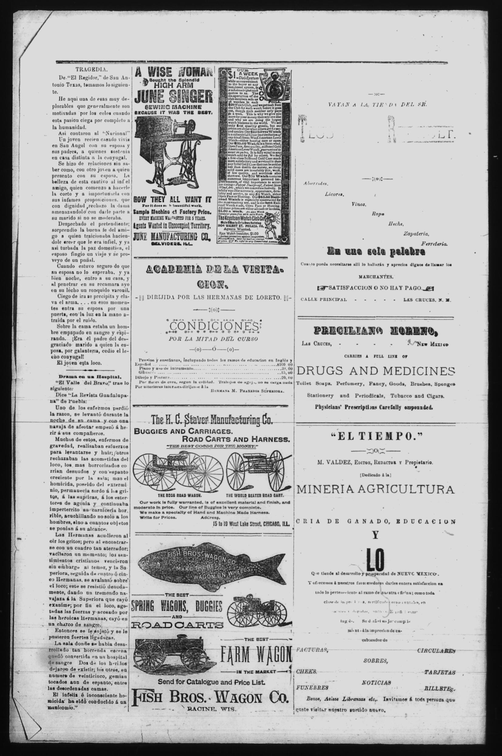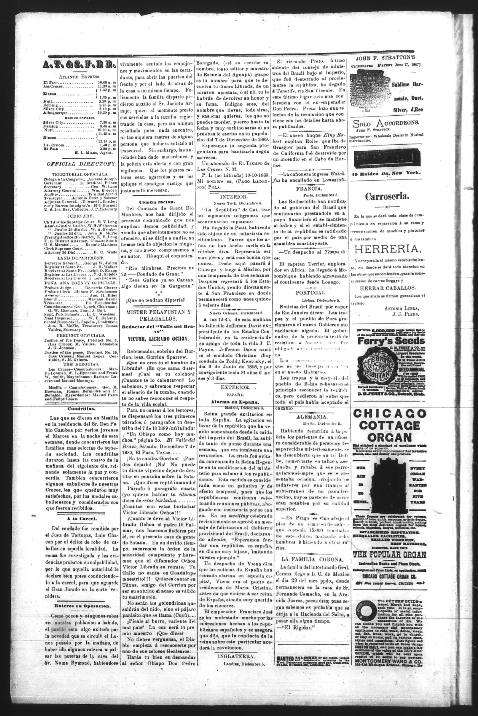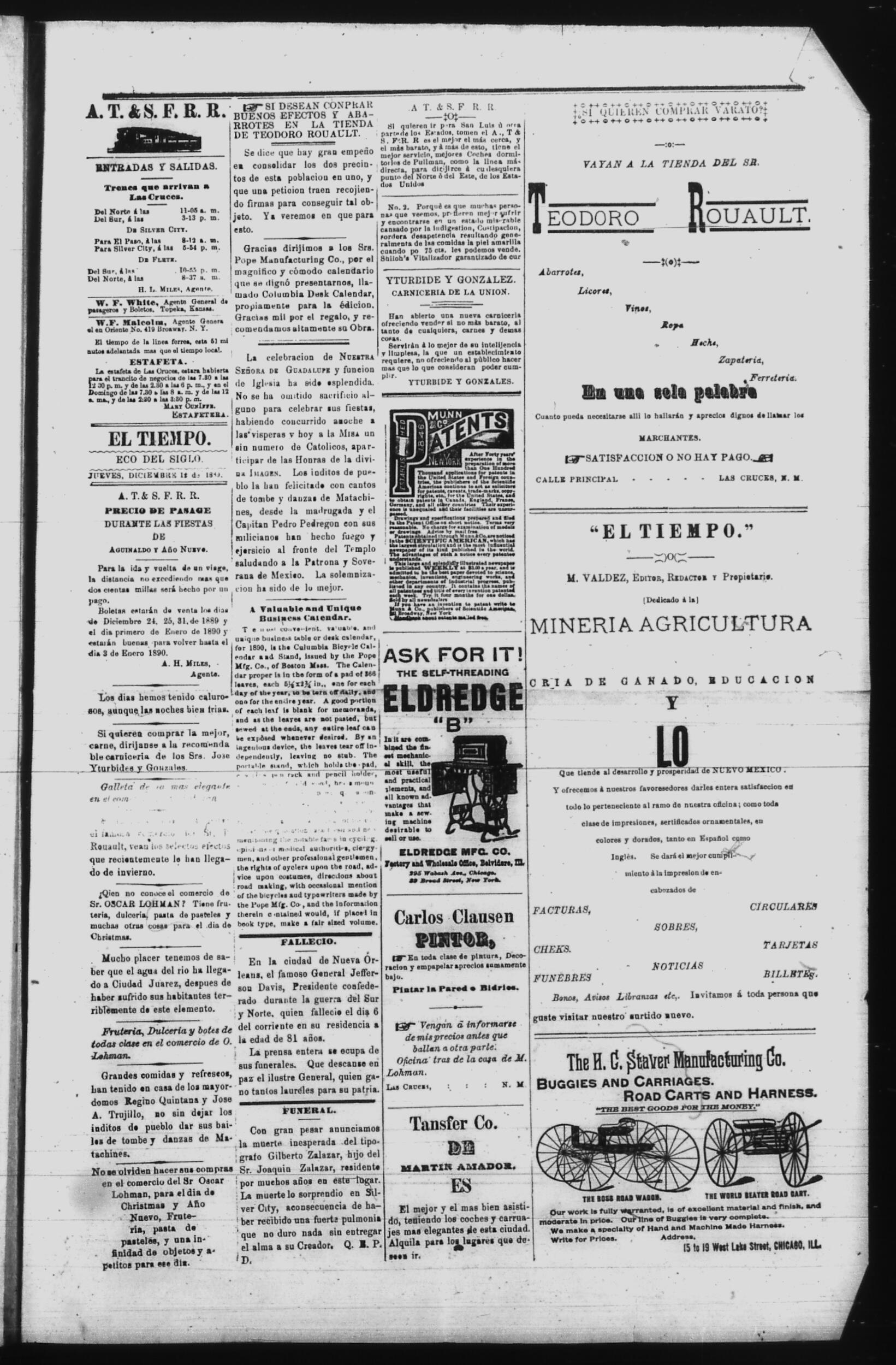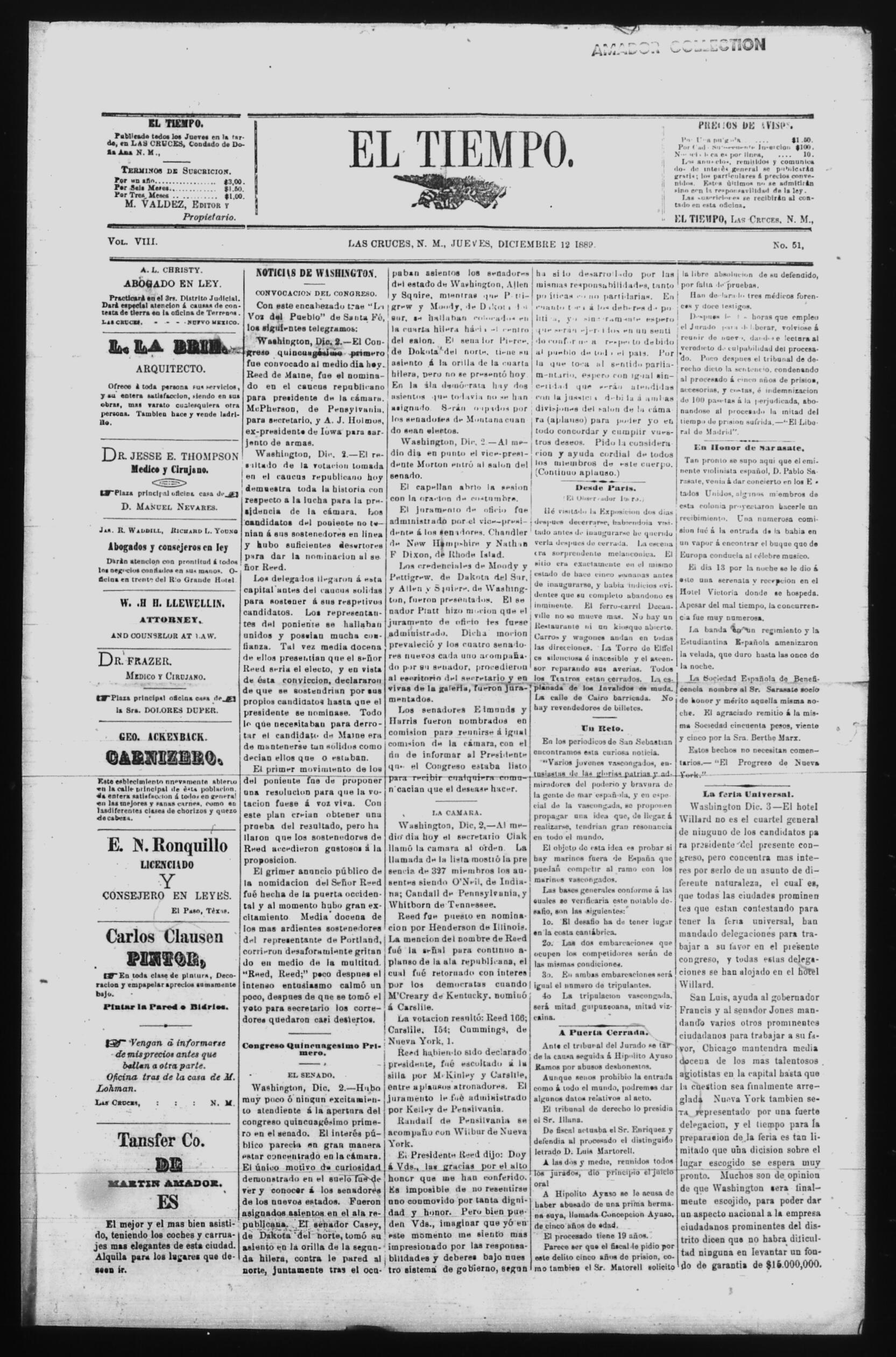 El Tiempo (Las Cruces, New Mexico, United States), 1889, December 12. Periódicos de la frontera México-Estados Unidos. https://latinonewspapers.com/s/es/item/86299.