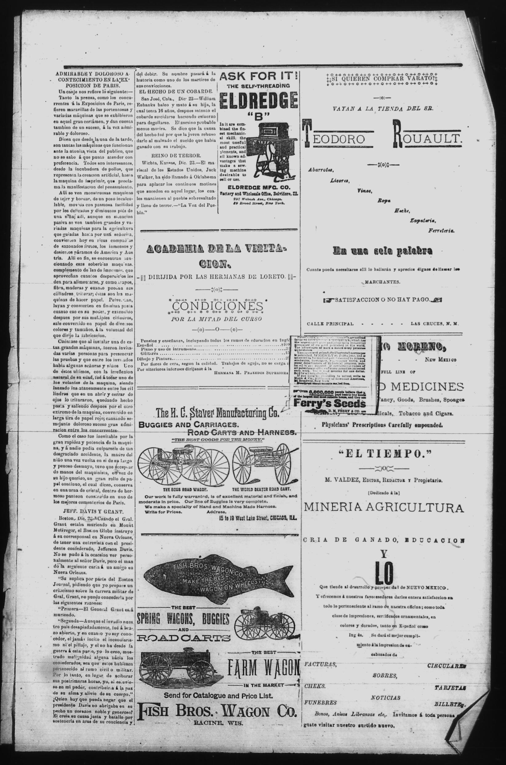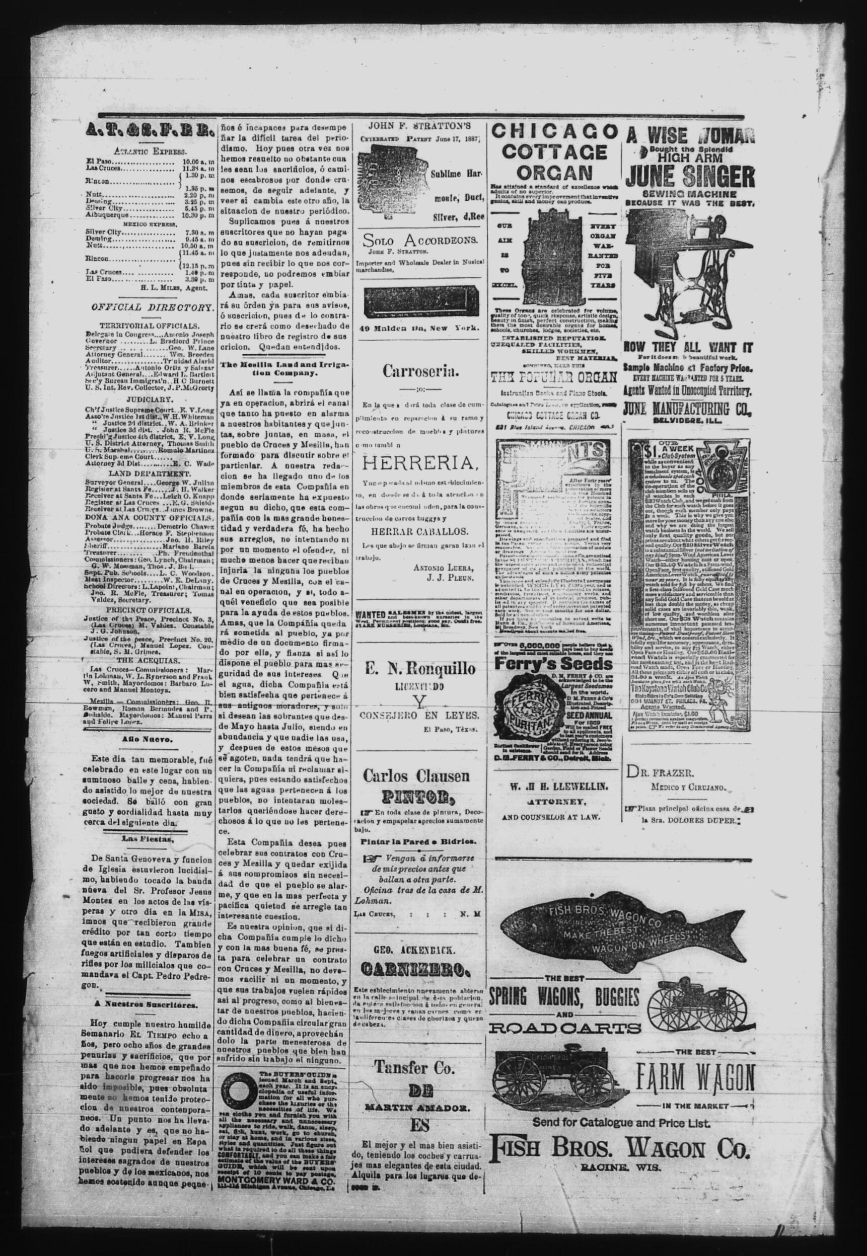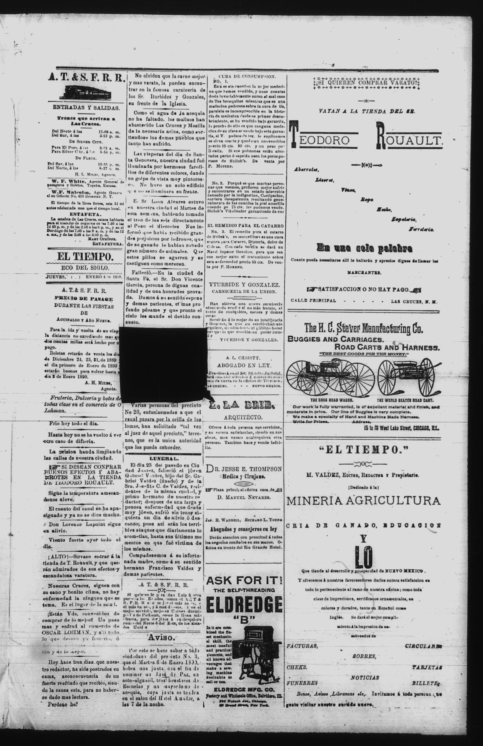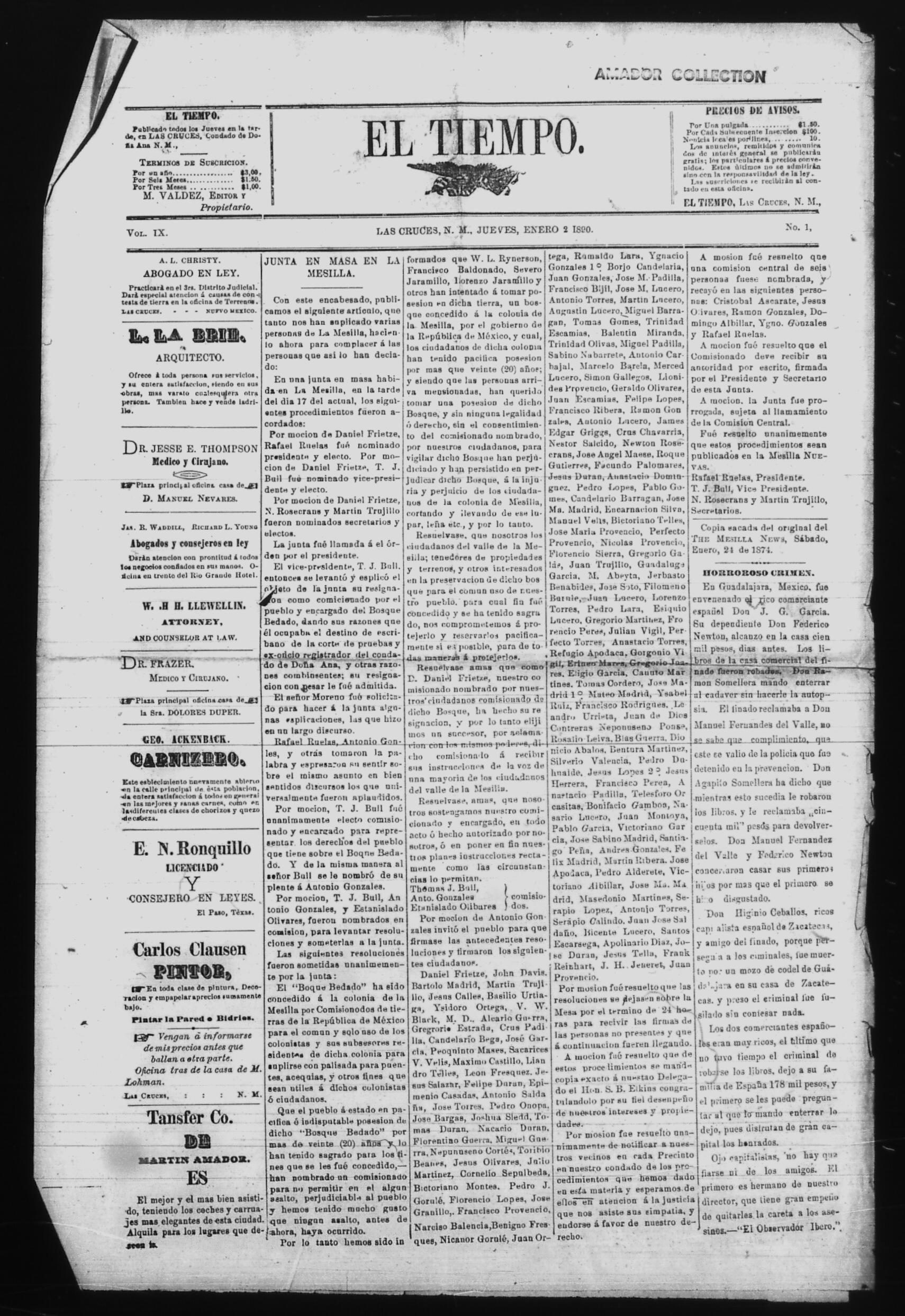 El Tiempo (Las Cruces, New Mexico, United States), 1890, January 2. Periódicos de la frontera México-Estados Unidos. https://latinonewspapers.com/s/es/item/86300.