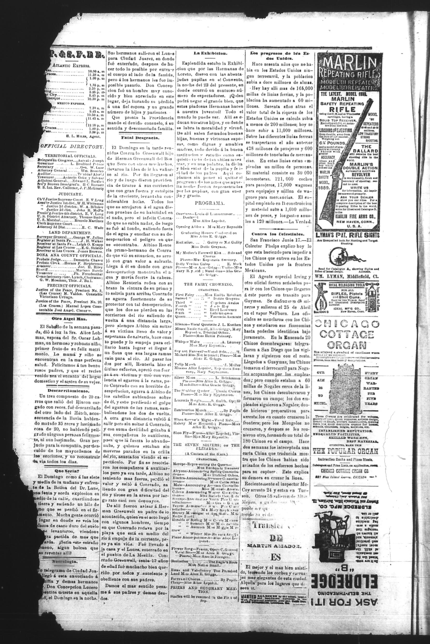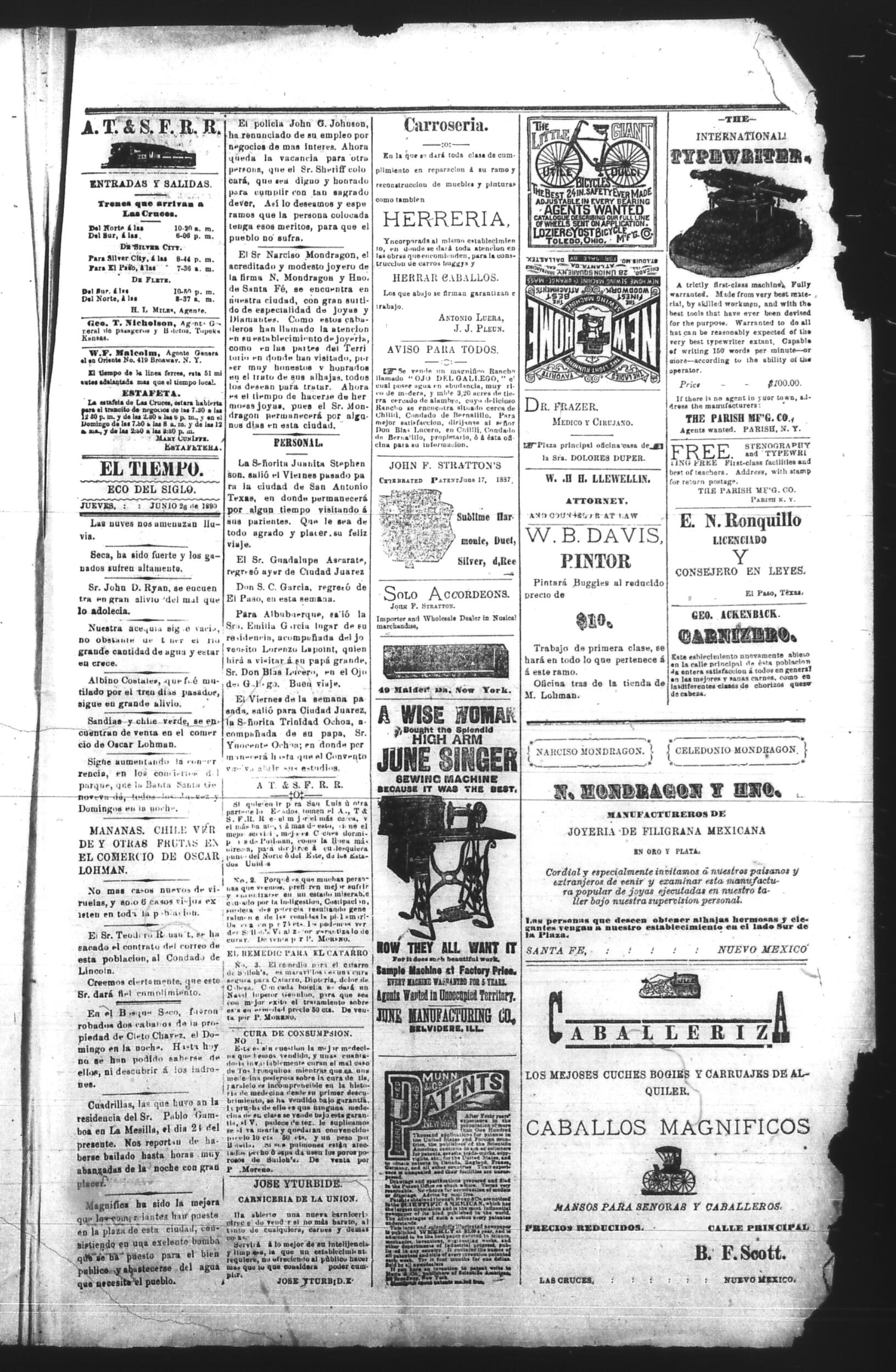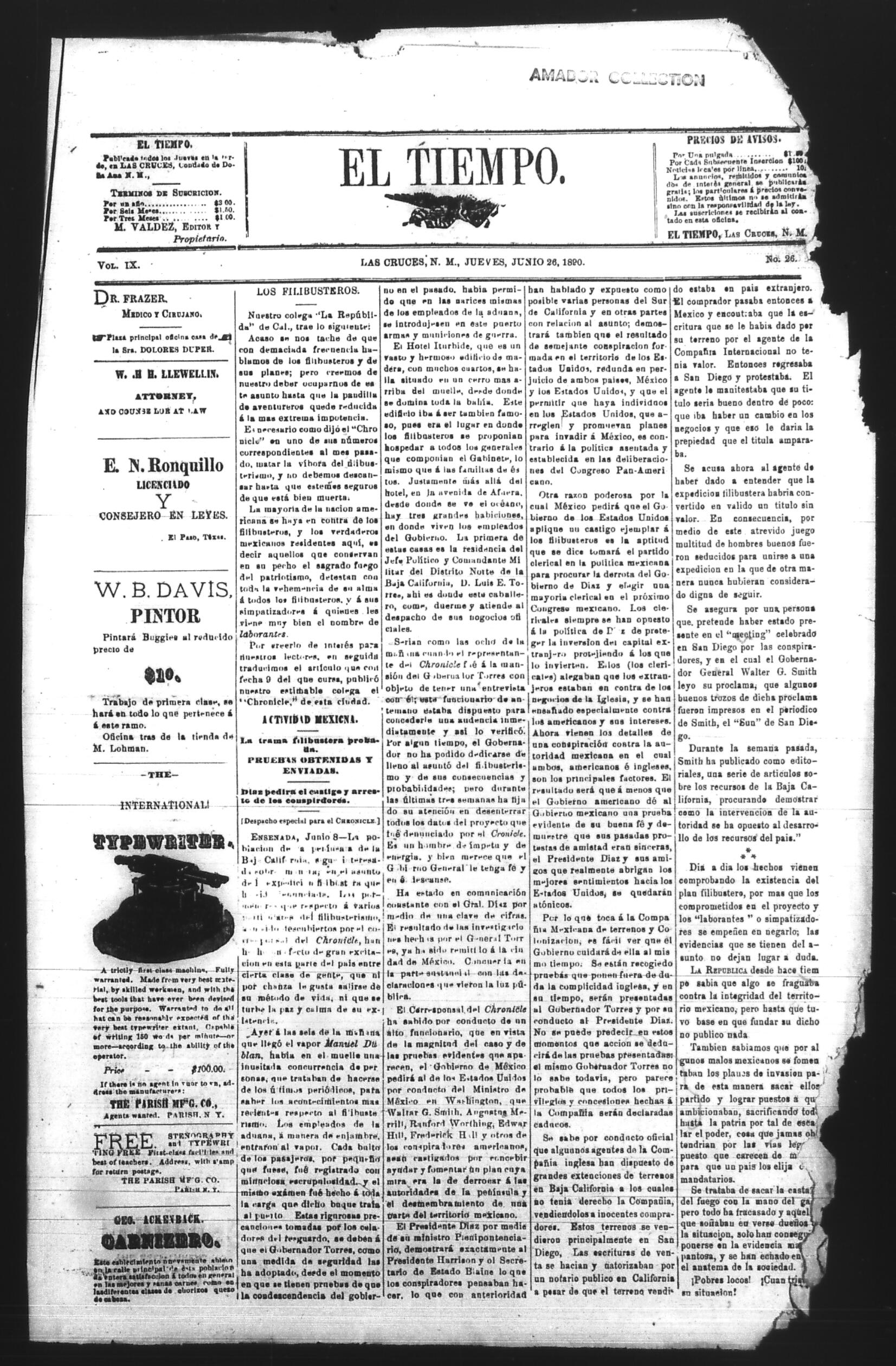 El Tiempo (Las Cruces, New Mexico, United States), 1890, June 26. Periódicos de la frontera México-Estados Unidos. https://latinonewspapers.com/s/es/item/86313.