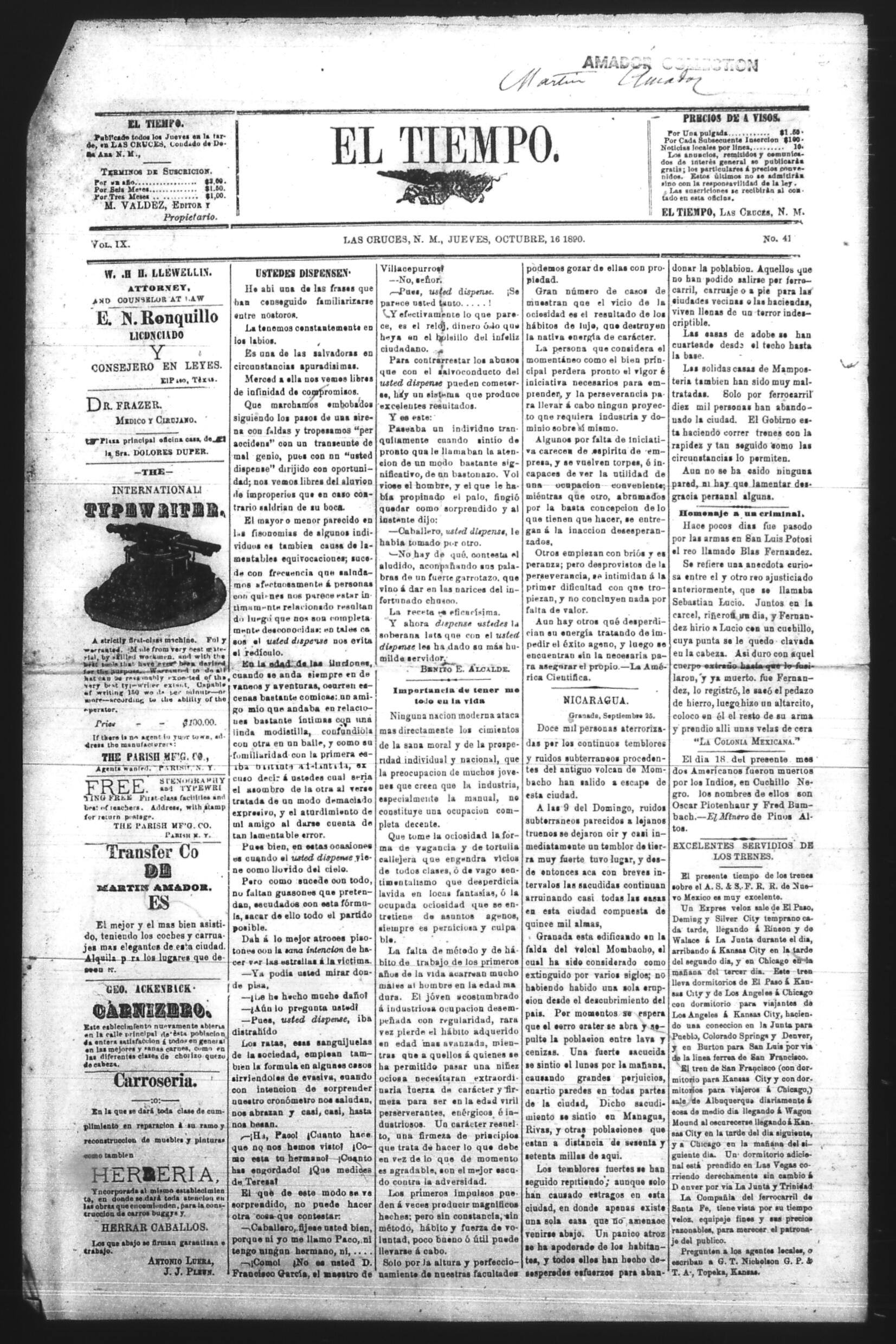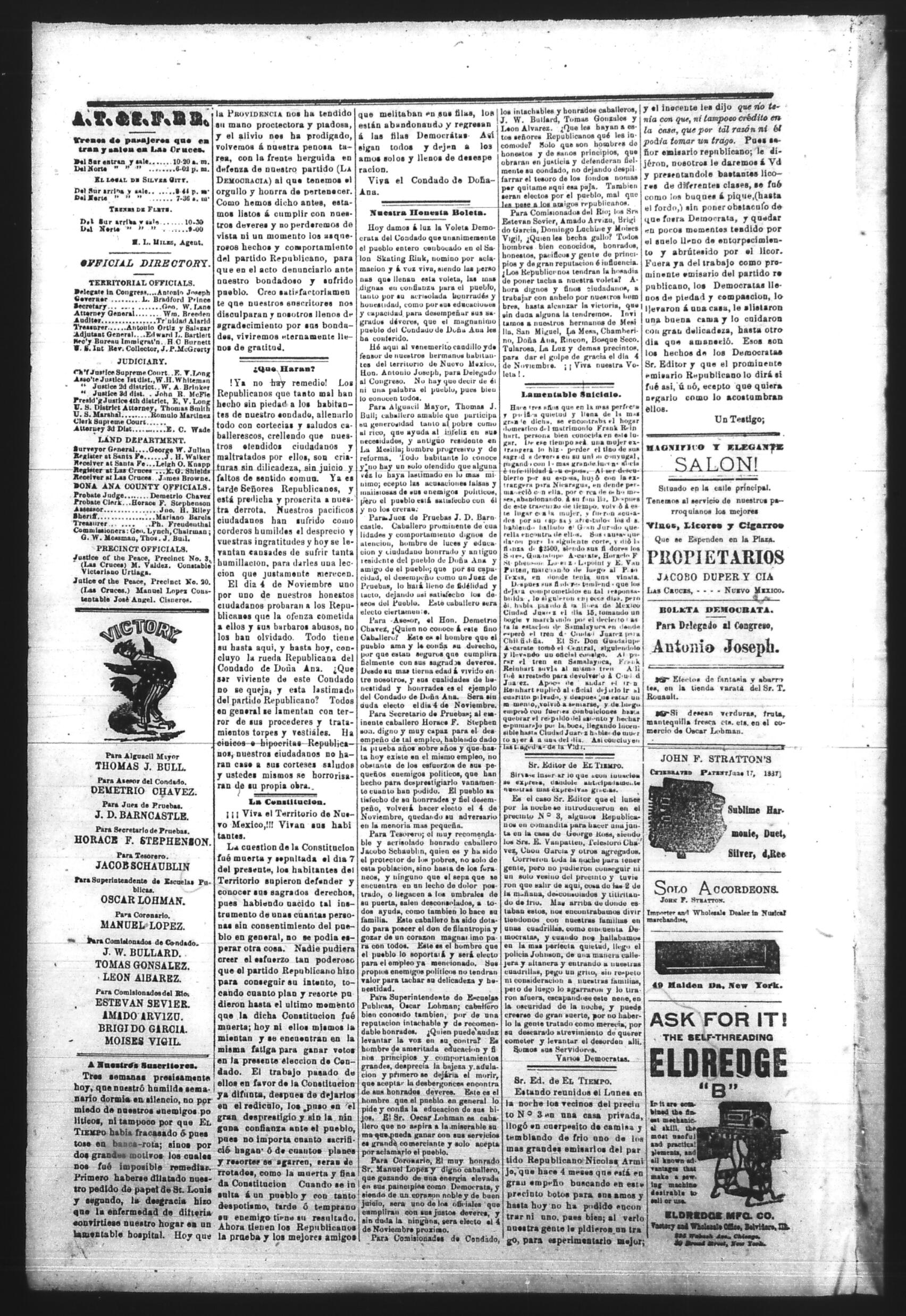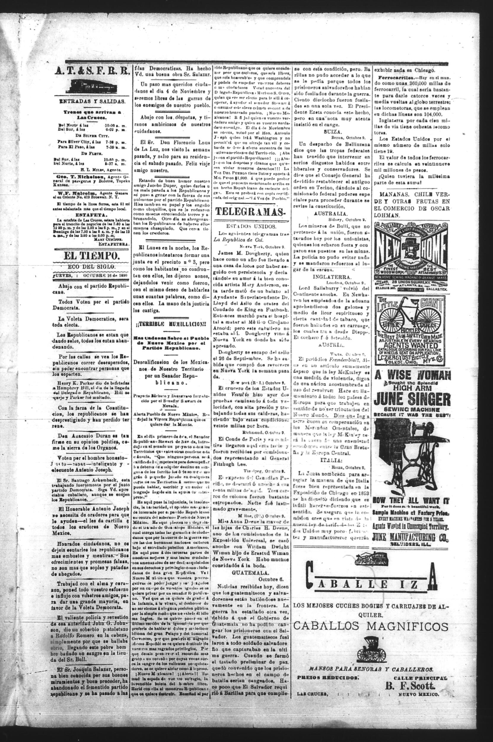 El Tiempo (Las Cruces, New Mexico, United States), 1890, October 16. Periódicos de la frontera México-Estados Unidos. https://latinonewspapers.com/s/es/item/86317.