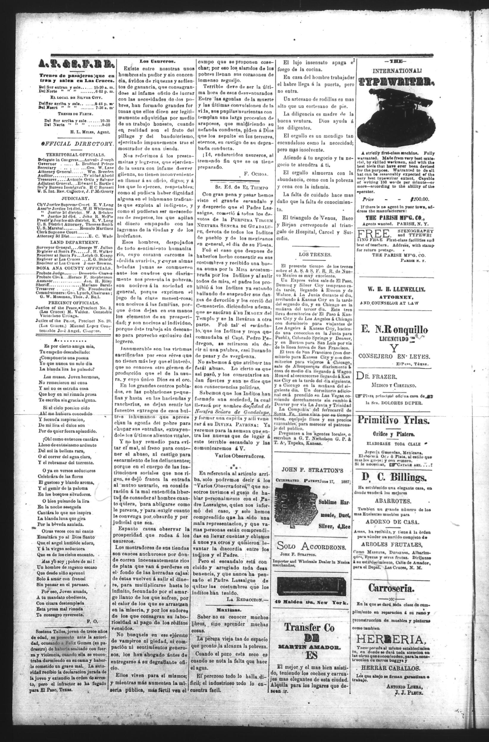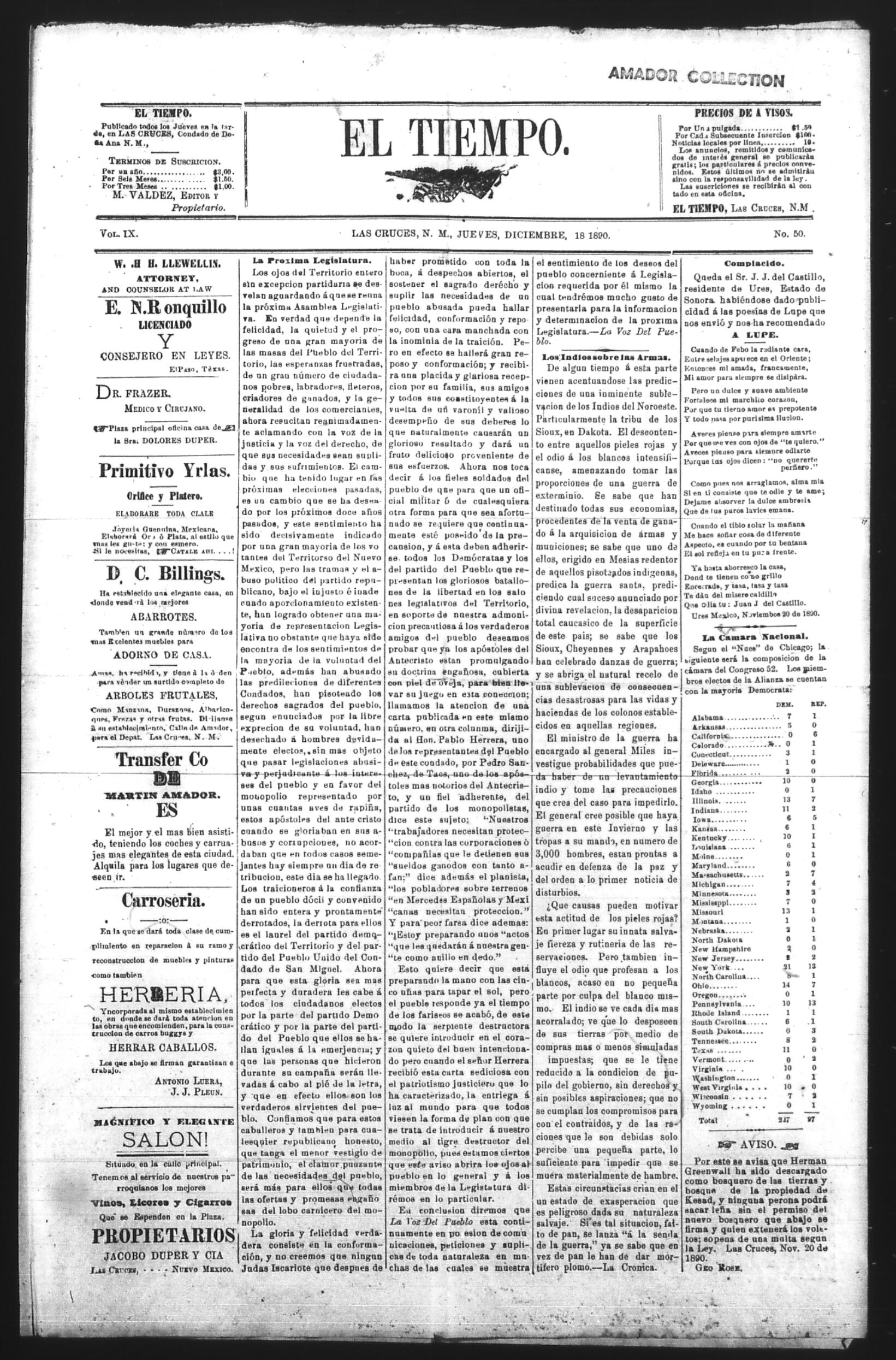 El Tiempo (Las Cruces, New Mexico, United States), 1890, December 18. Periódicos de la frontera México-Estados Unidos. https://latinonewspapers.com/s/es/item/86319.