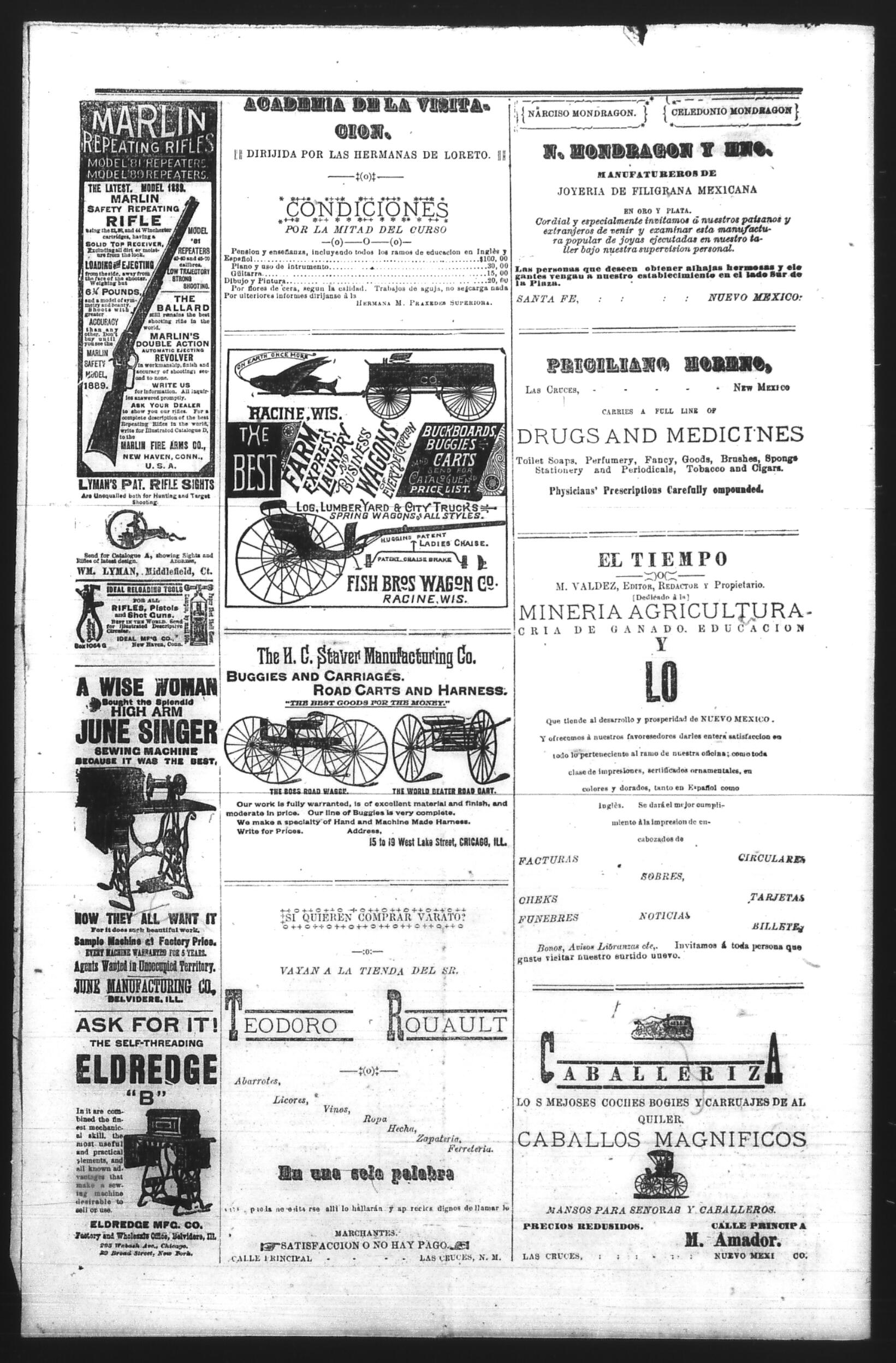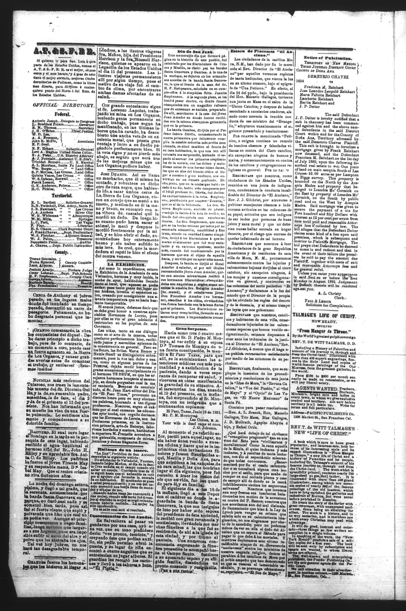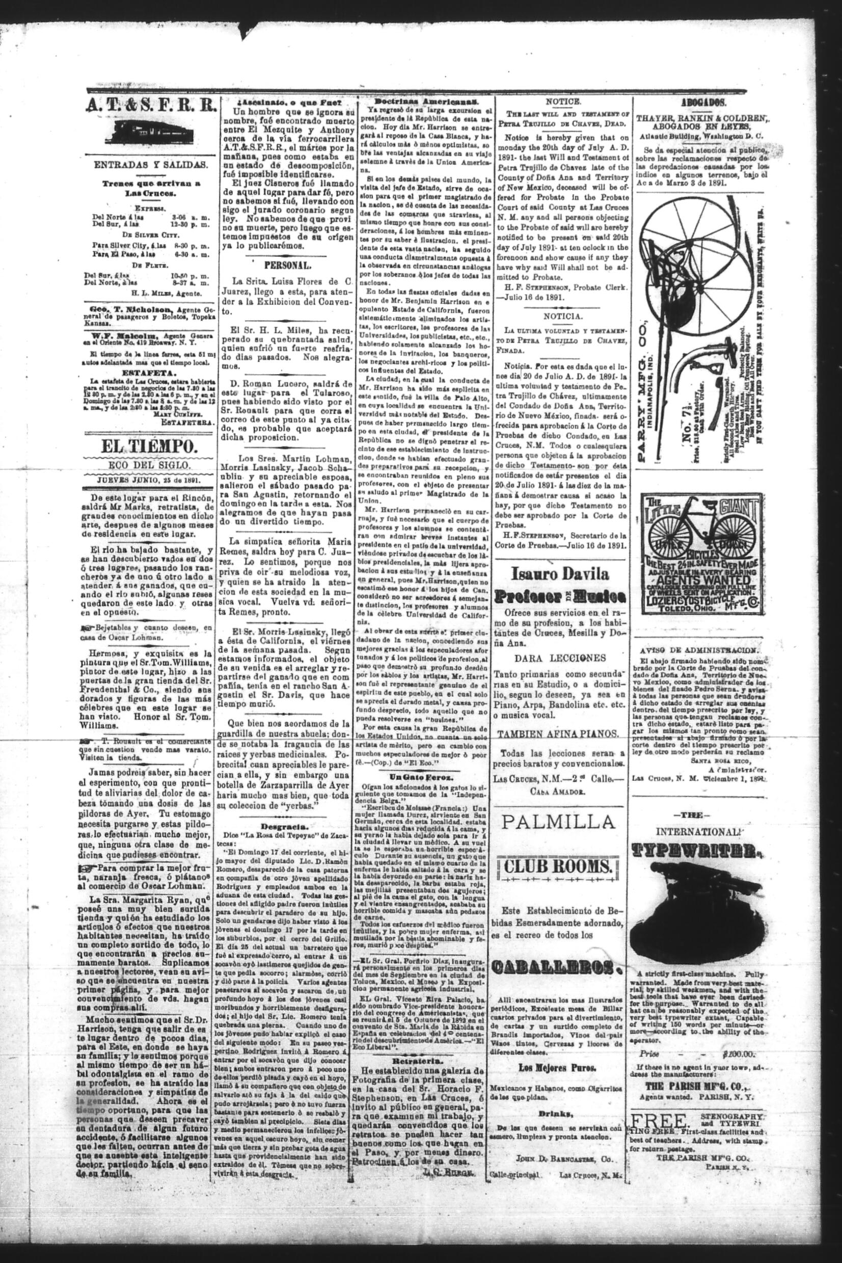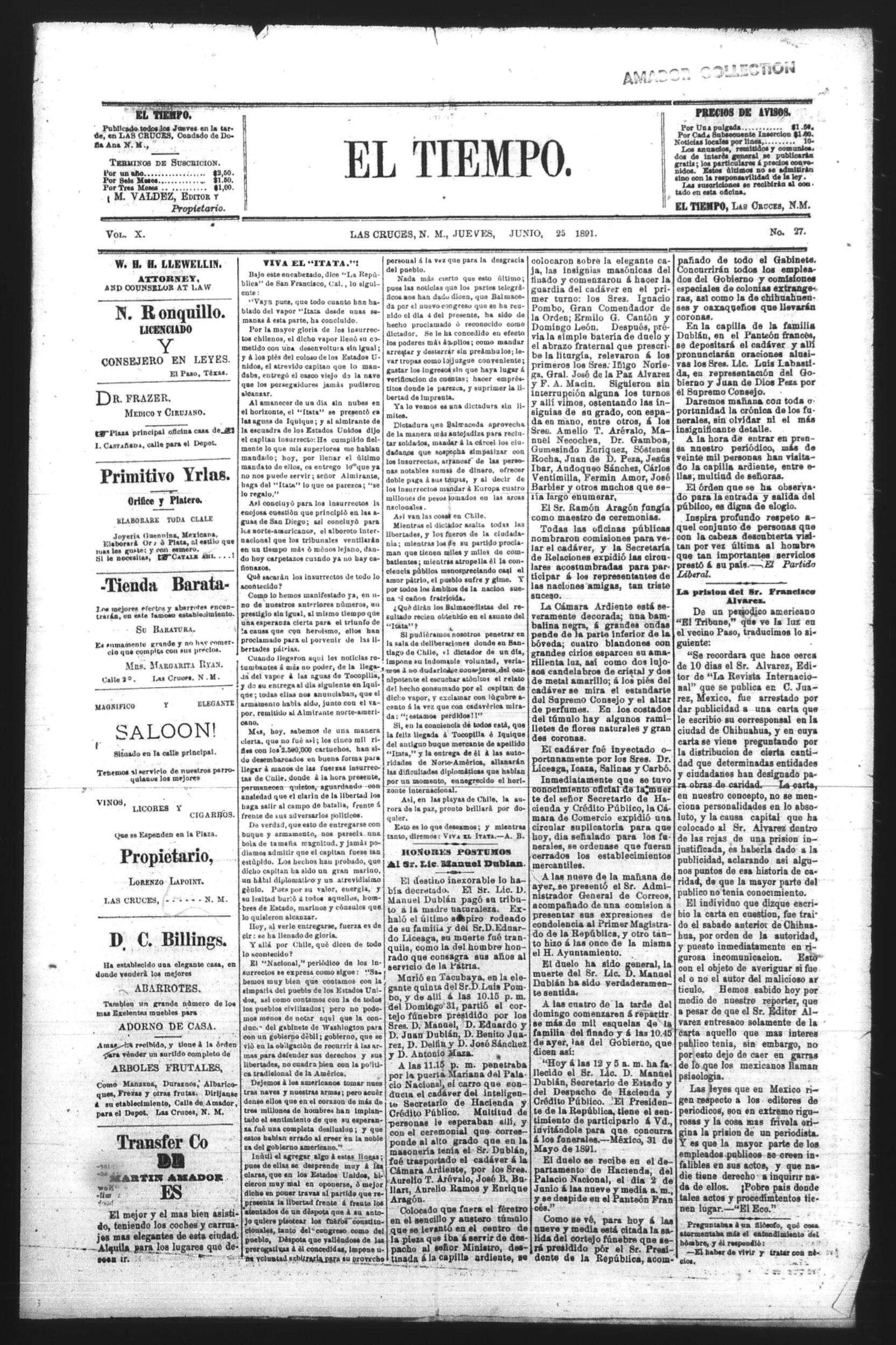 El Tiempo (Las Cruces, New Mexico, United States), 1891, June 25. Periódicos de la frontera México-Estados Unidos. https://latinonewspapers.com/s/es/item/86325.