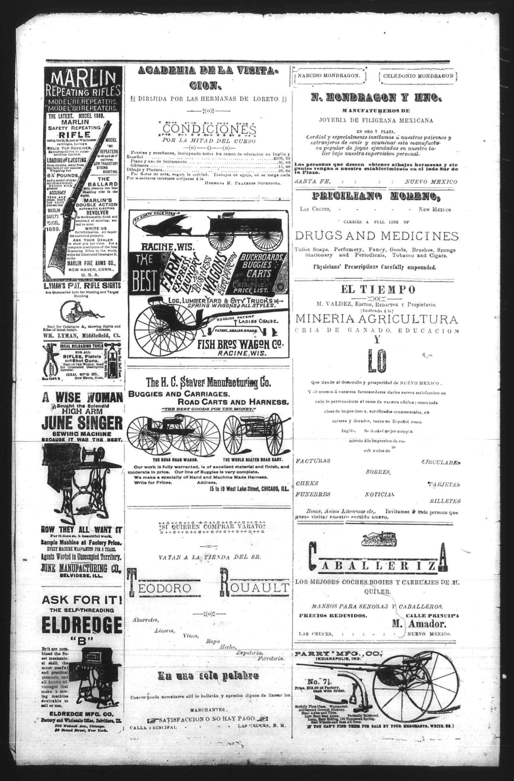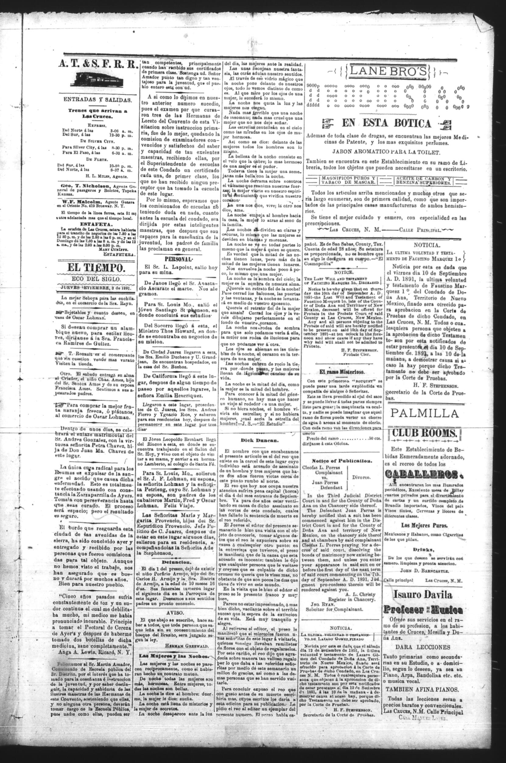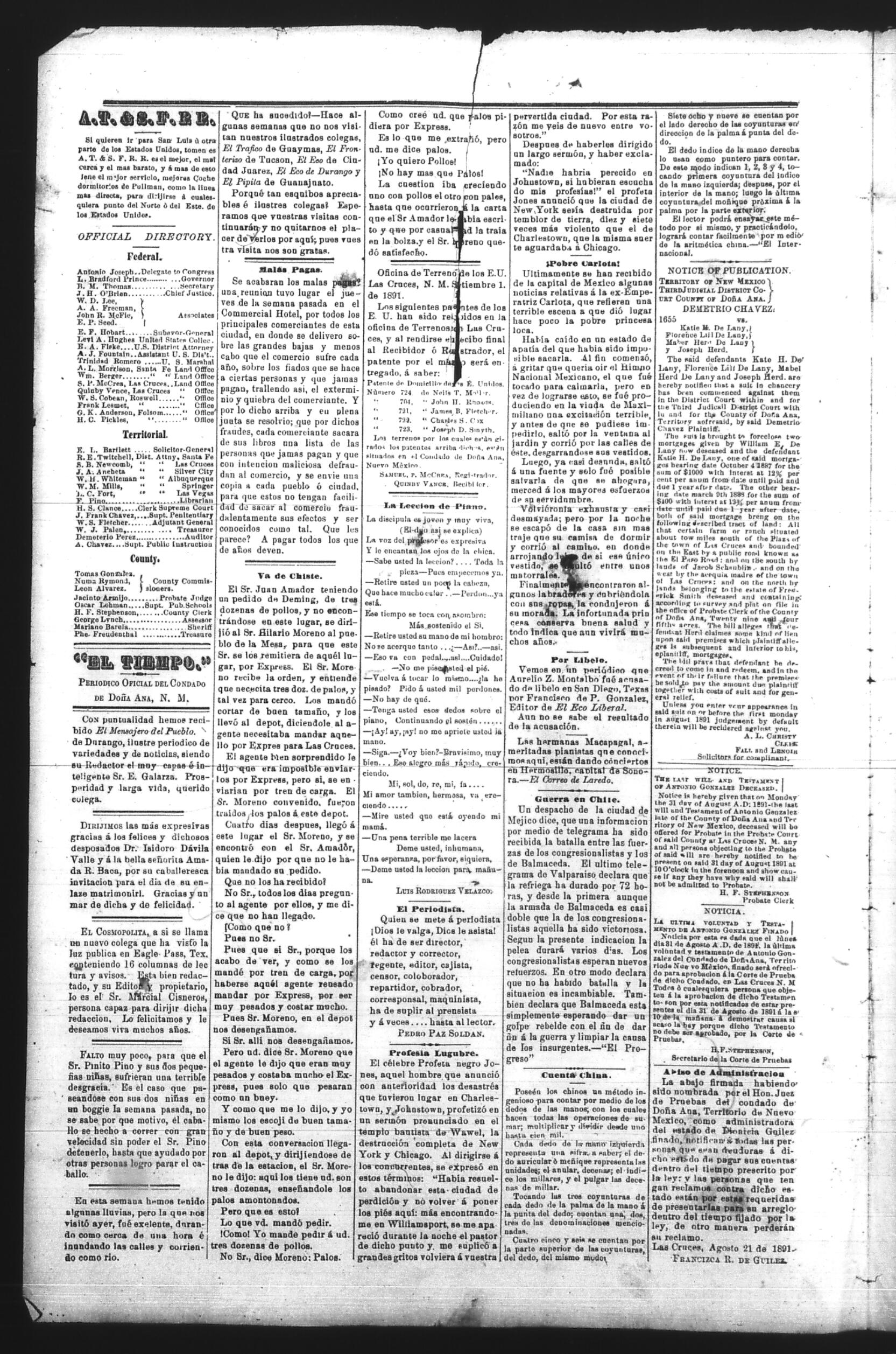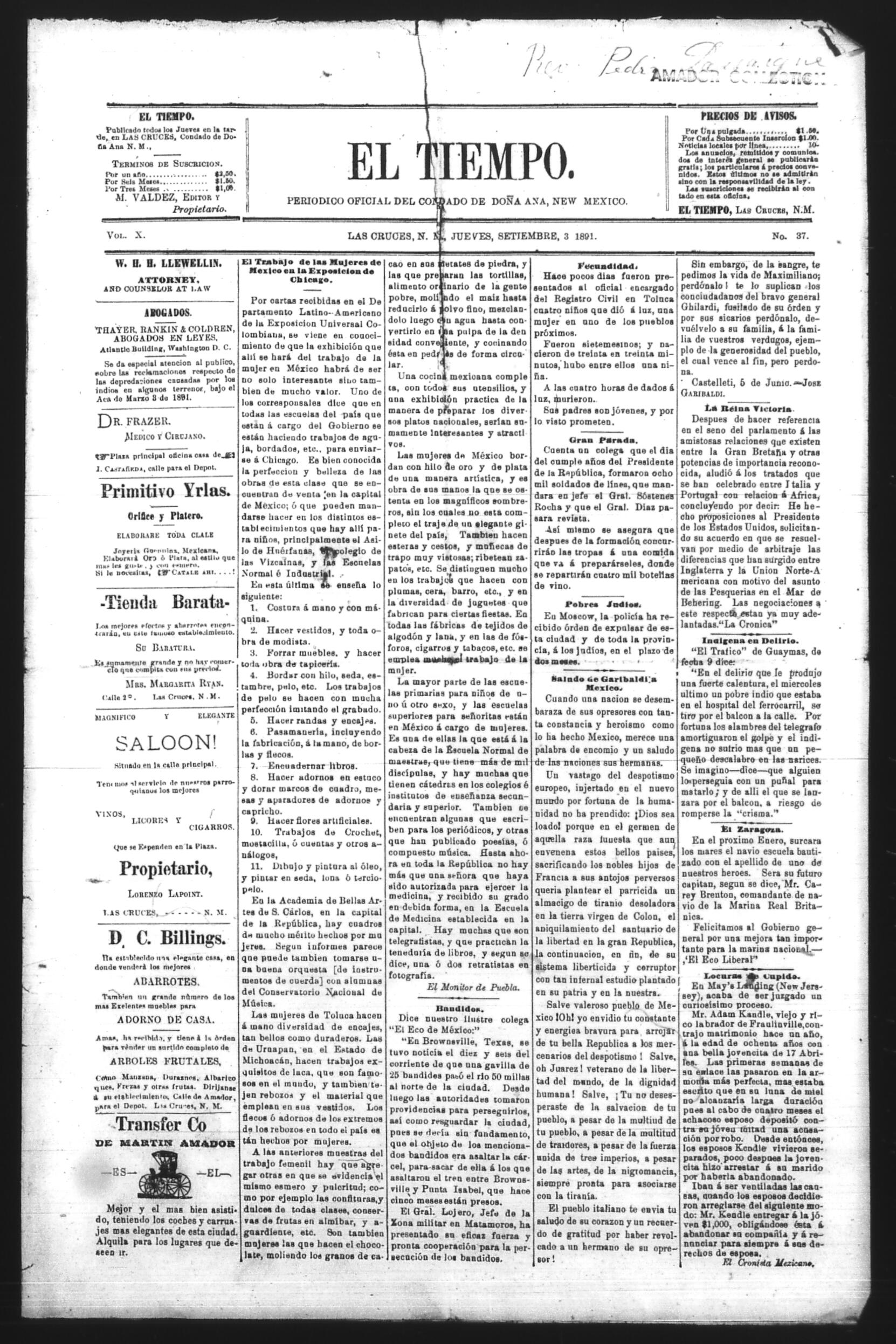 El Tiempo (Las Cruces, New Mexico, United States), 1891, September 3. Periódicos de la frontera México-Estados Unidos. https://latinonewspapers.com/s/es/item/86330.