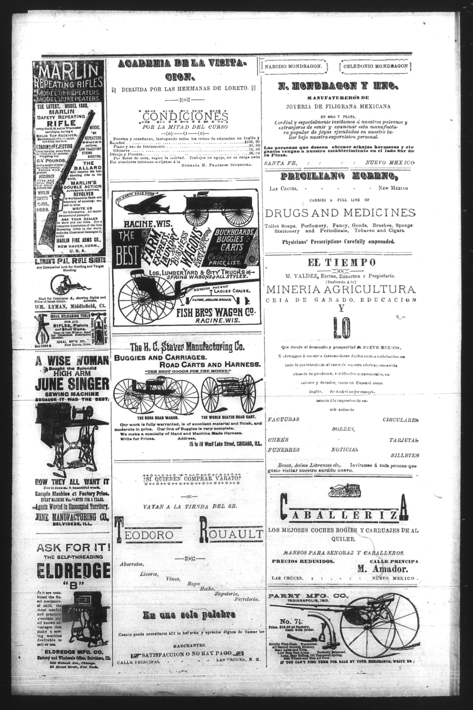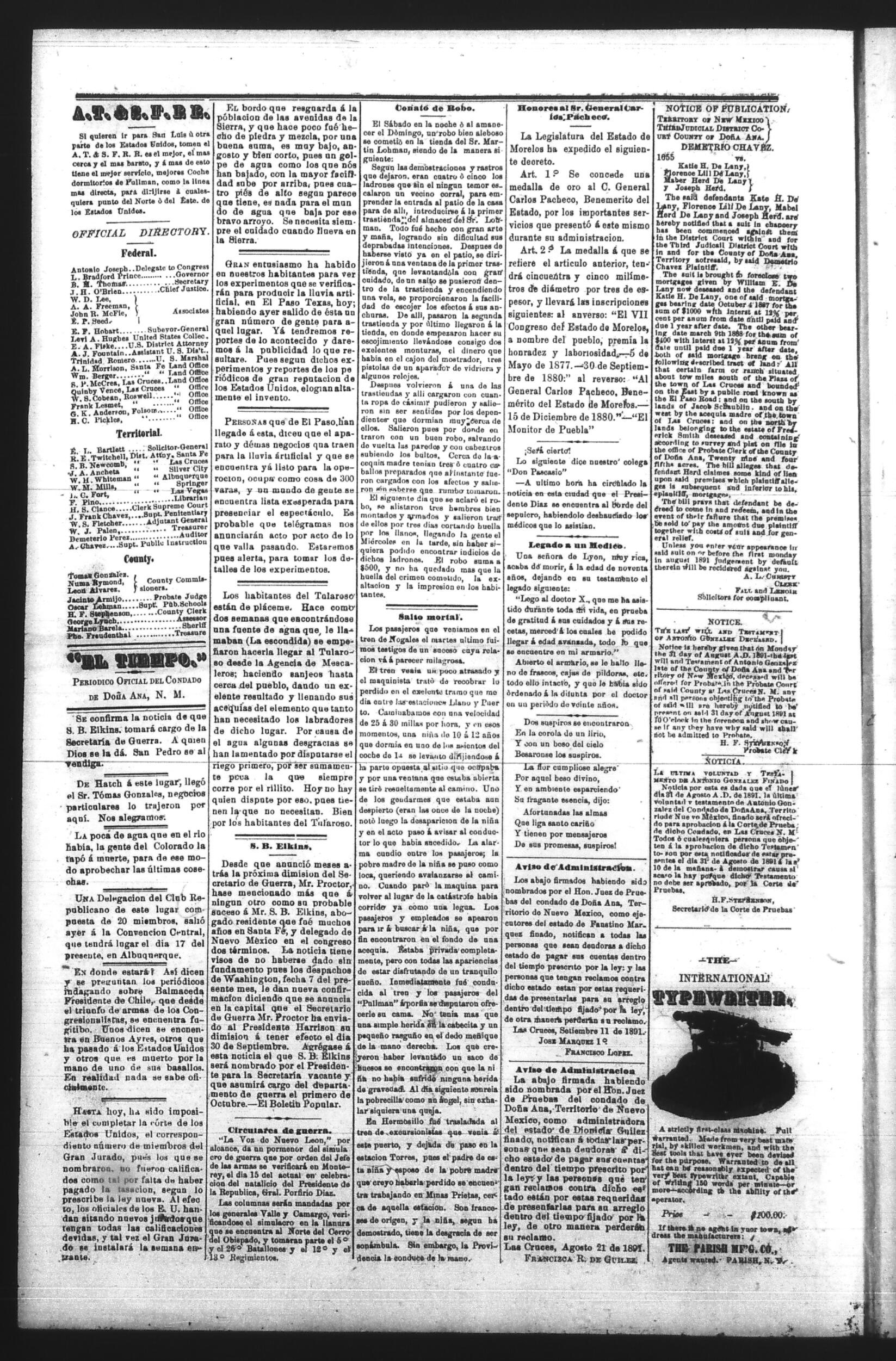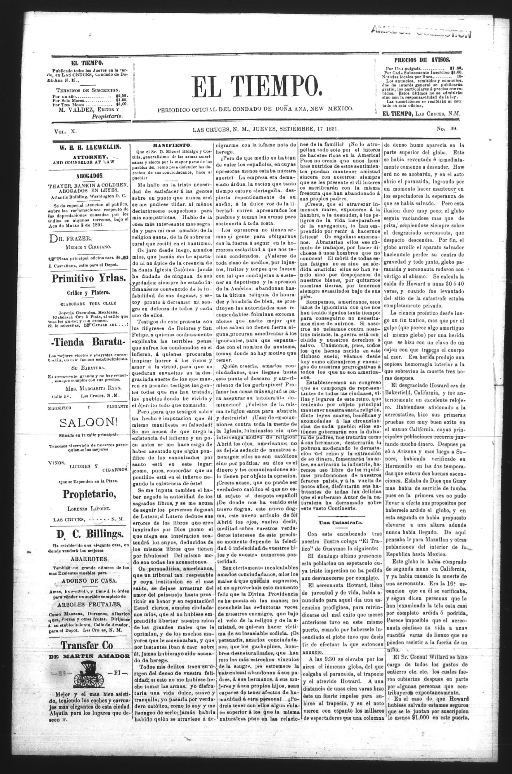 El Tiempo (Las Cruces, New Mexico, United States), 1891, September 17. Periódicos de la frontera México-Estados Unidos. https://latinonewspapers.com/s/es/item/86332.