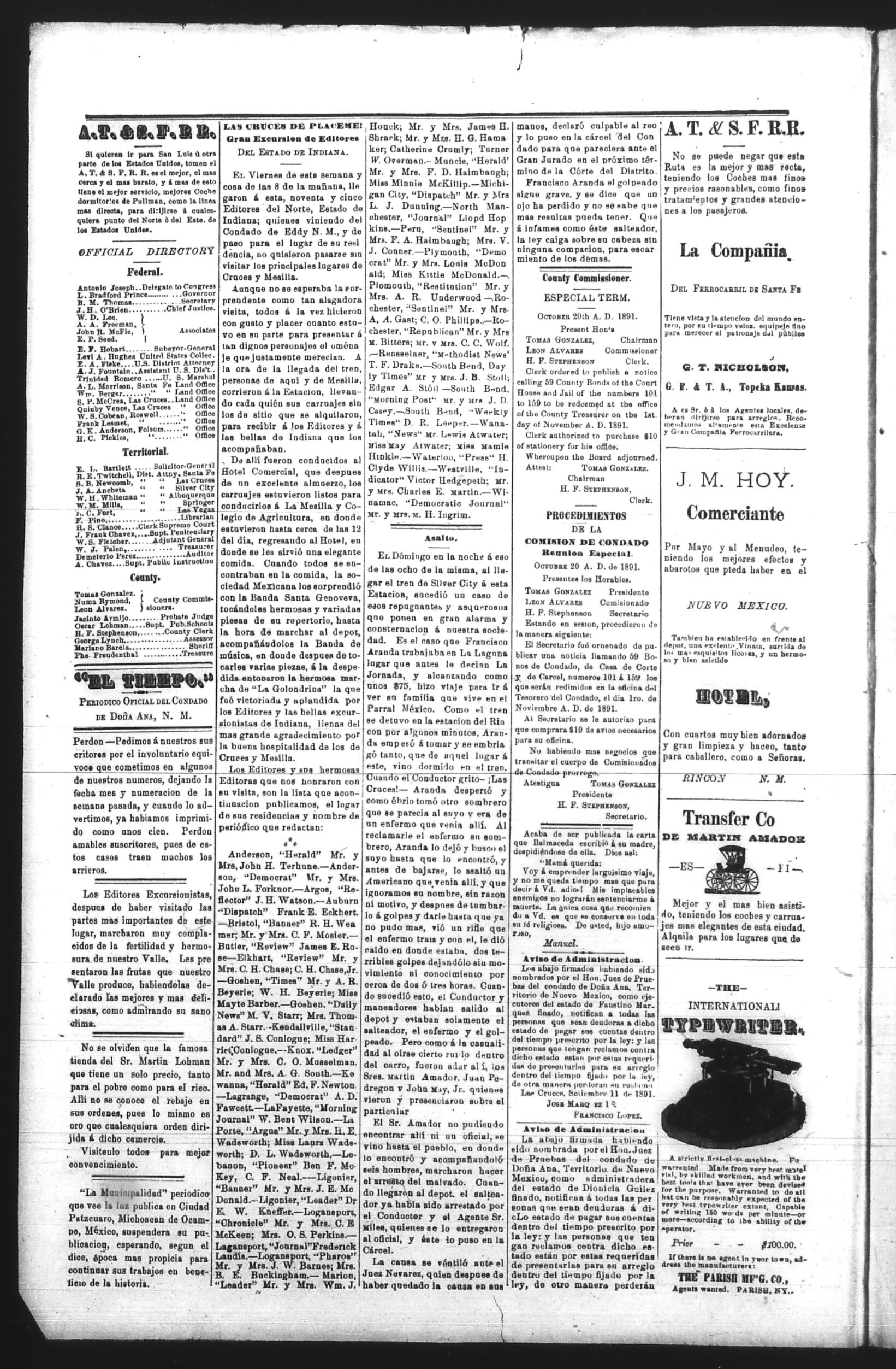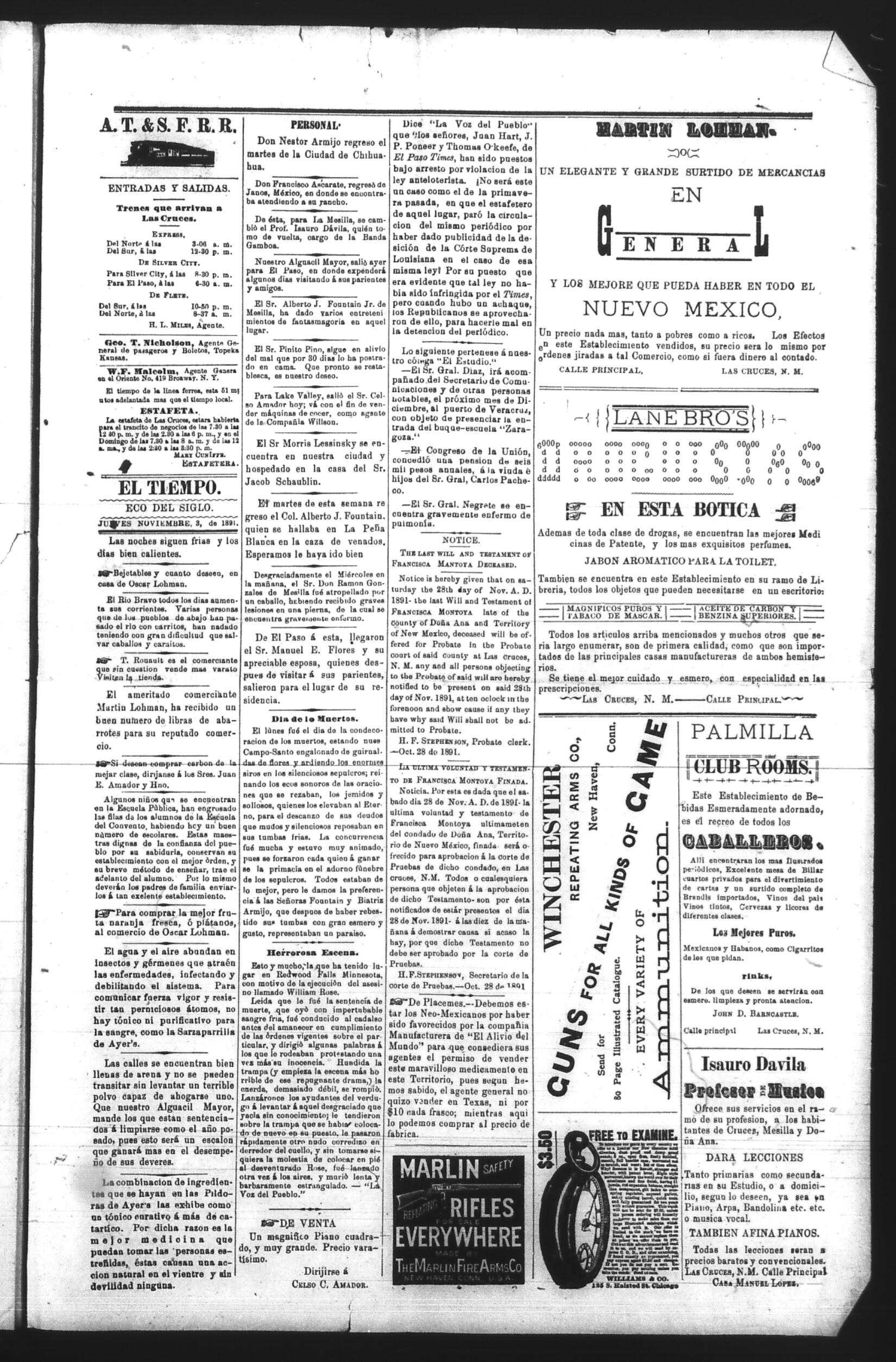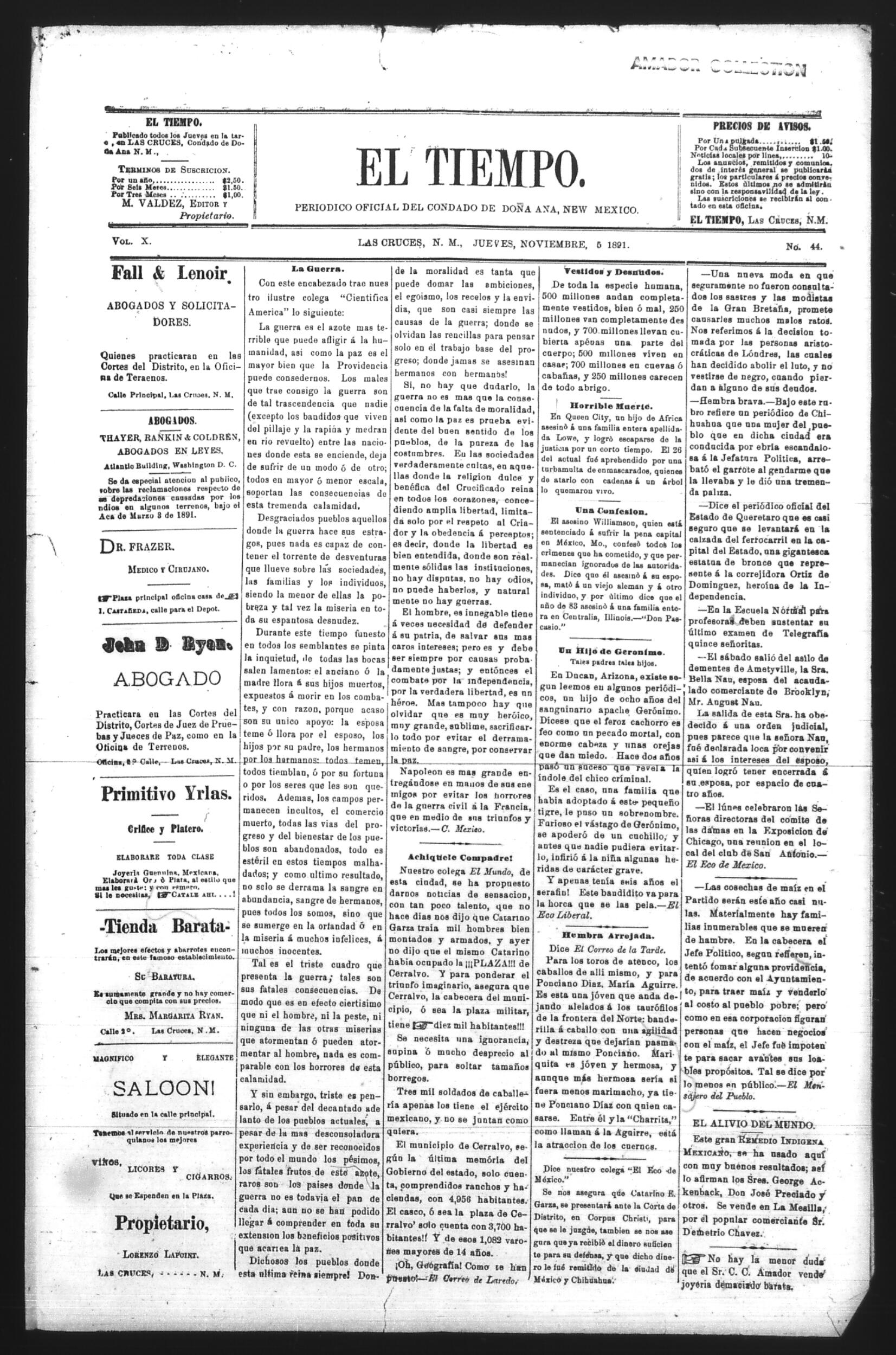 El Tiempo (Las Cruces, New Mexico, United States), 1891, November 5. Periódicos de la frontera México-Estados Unidos. https://latinonewspapers.com/s/es/item/86335.