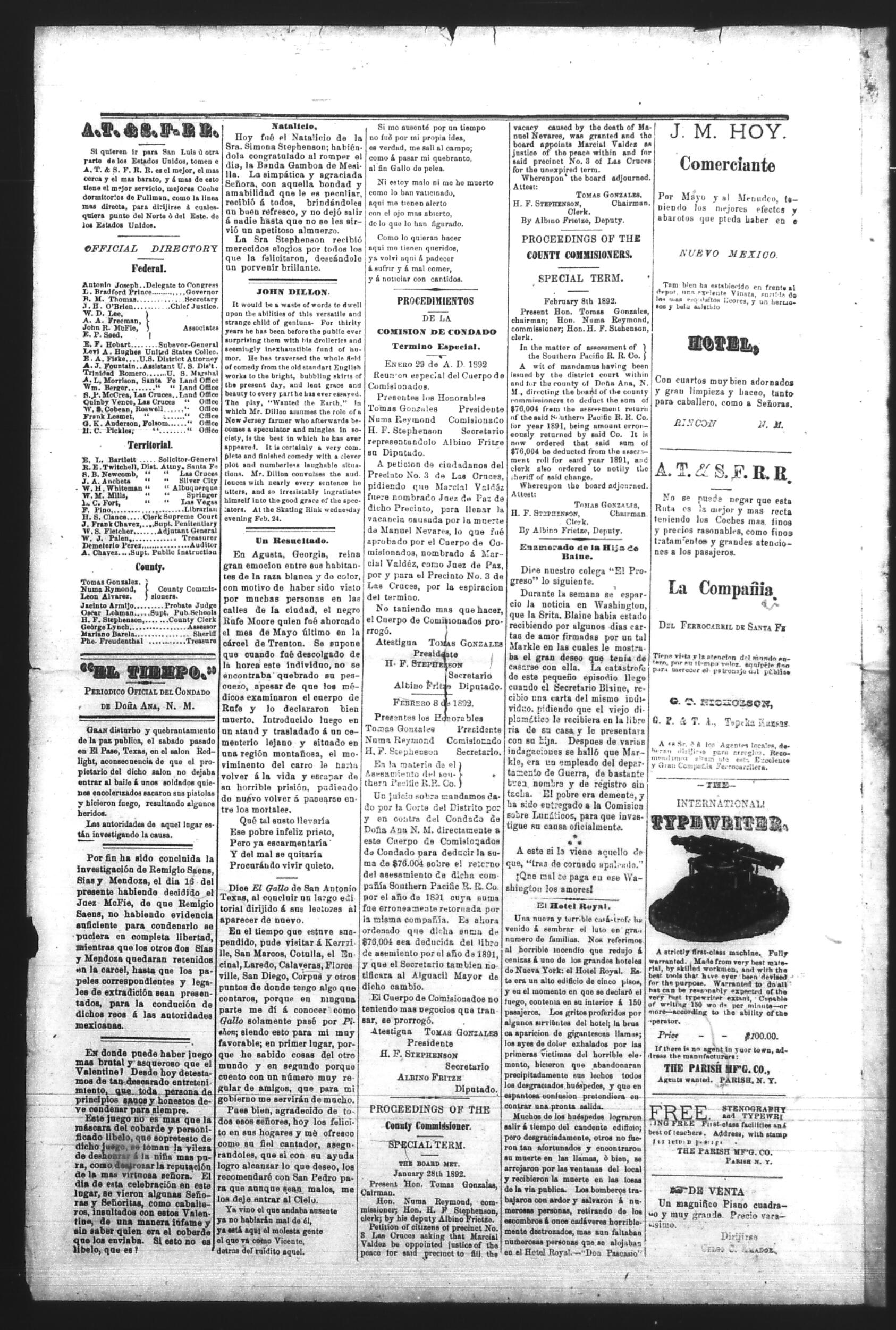 El Tiempo (Las Cruces, New Mexico, United States), 1892, February 18. Periódicos de la frontera México-Estados Unidos. https://latinonewspapers.com/s/es/item/86346.