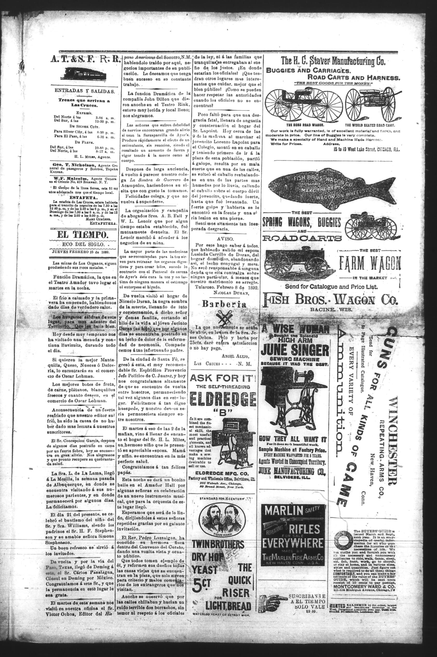 El Tiempo (Las Cruces, New Mexico, United States), 1892, February 25. Periódicos de la frontera México-Estados Unidos. https://latinonewspapers.com/s/es/item/86347.
