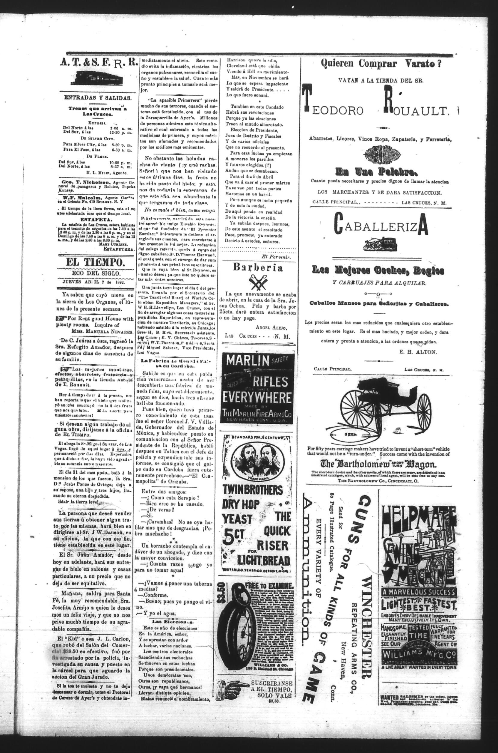 El Tiempo (Las Cruces, New Mexico, United States), 1892, April 7. Periódicos de la frontera México-Estados Unidos. https://latinonewspapers.com/s/es/item/86348.