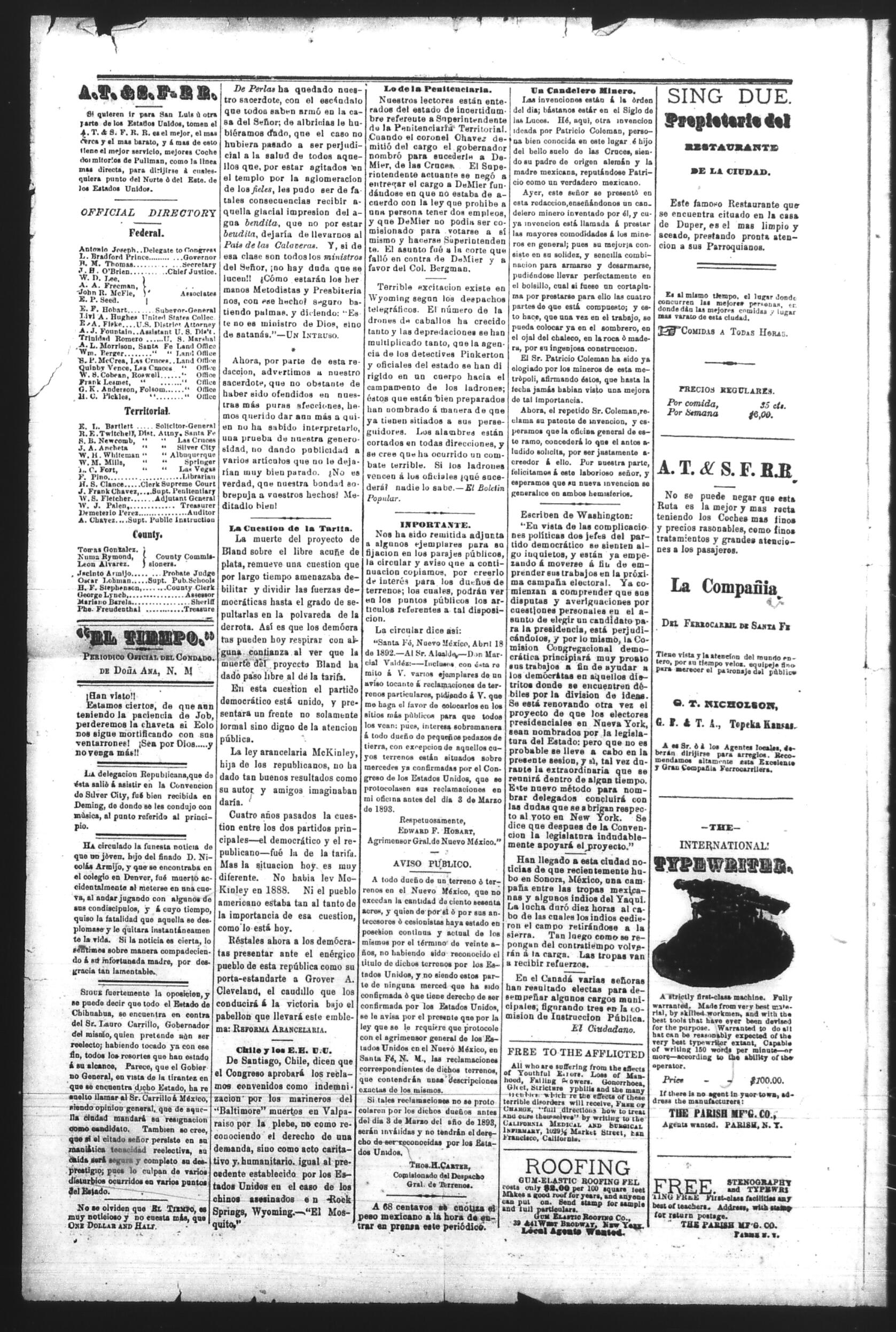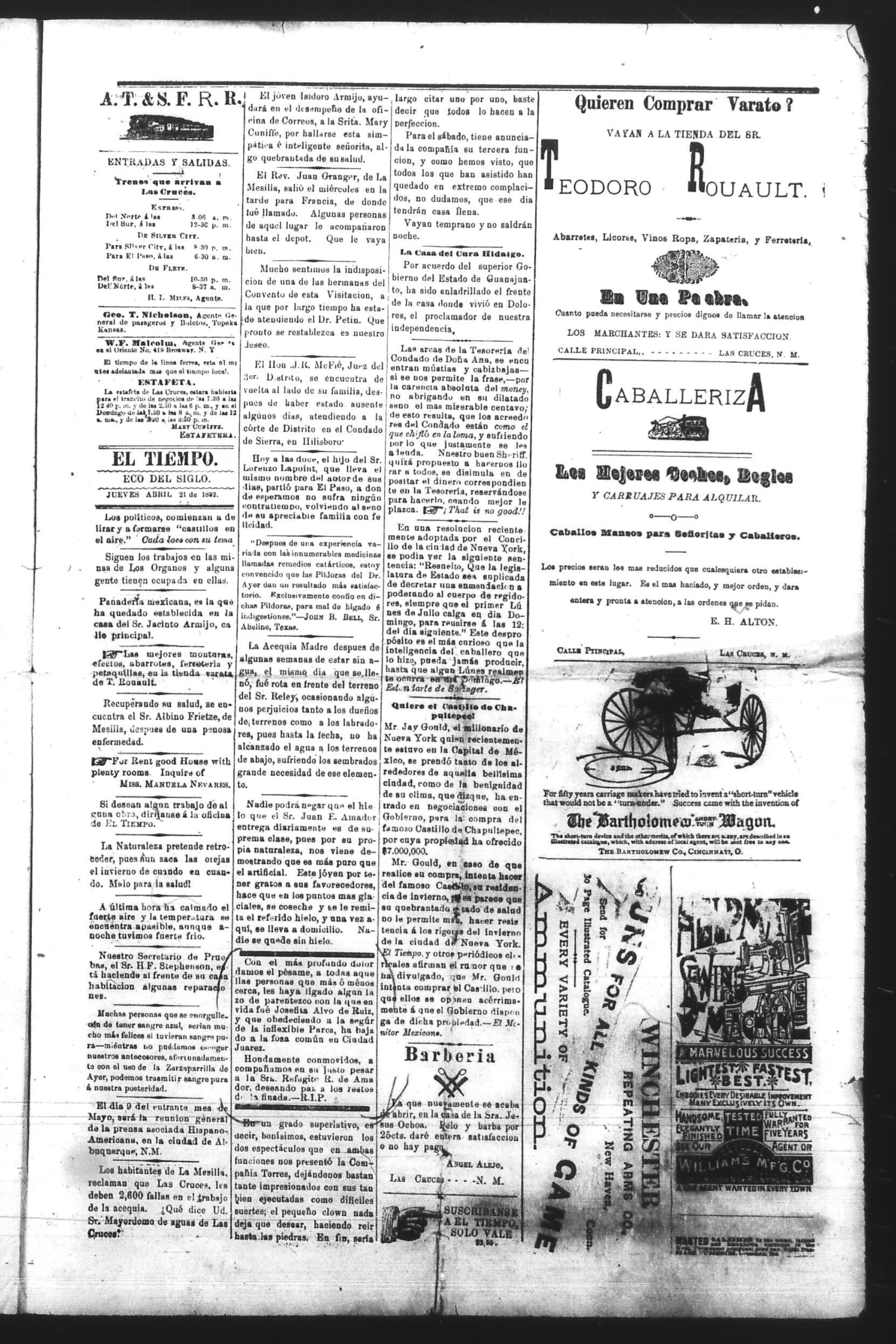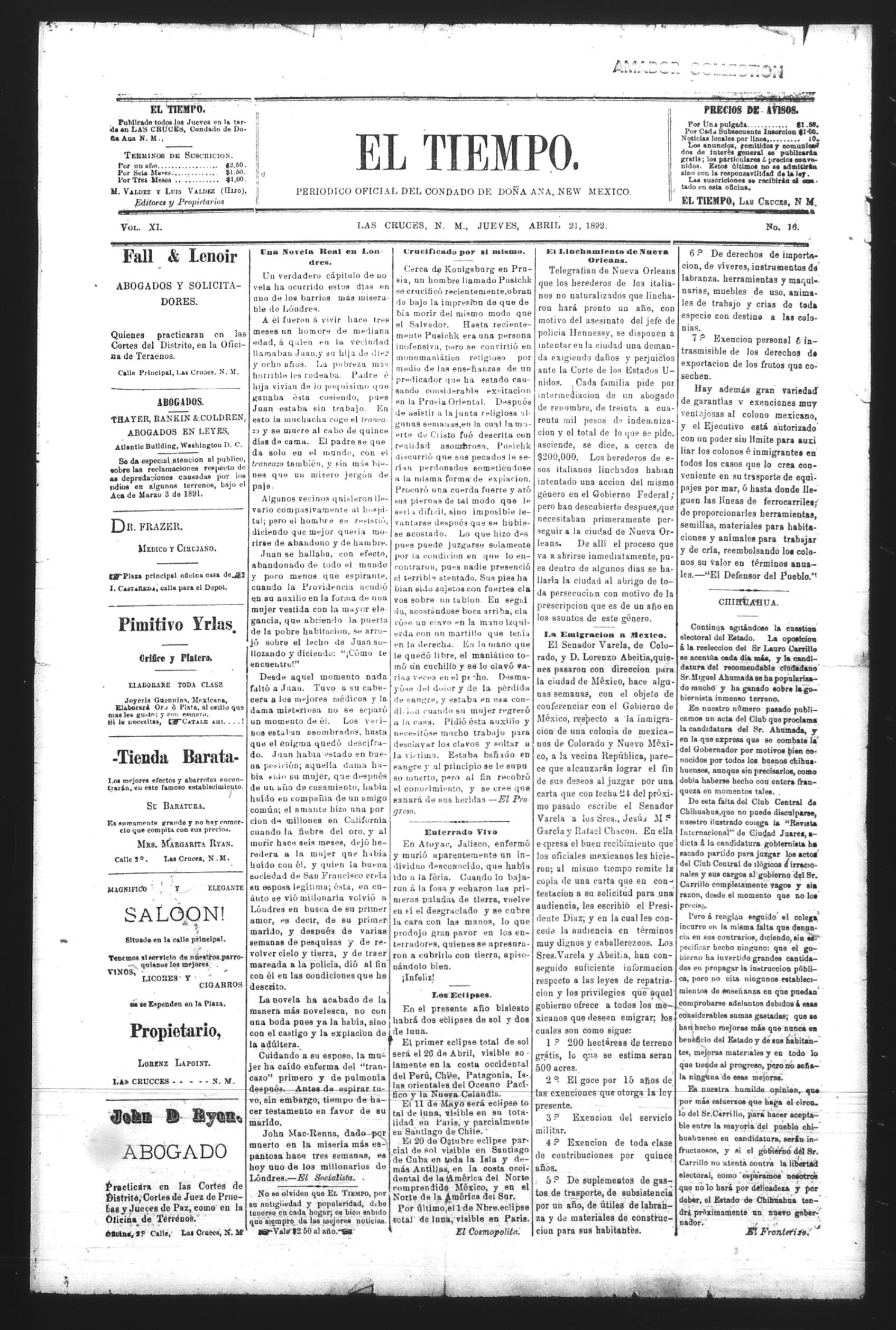El Tiempo (Las Cruces, New Mexico, United States), 1892, April 21. Periódicos de la frontera México-Estados Unidos. https://latinonewspapers.com/s/es/item/86350.