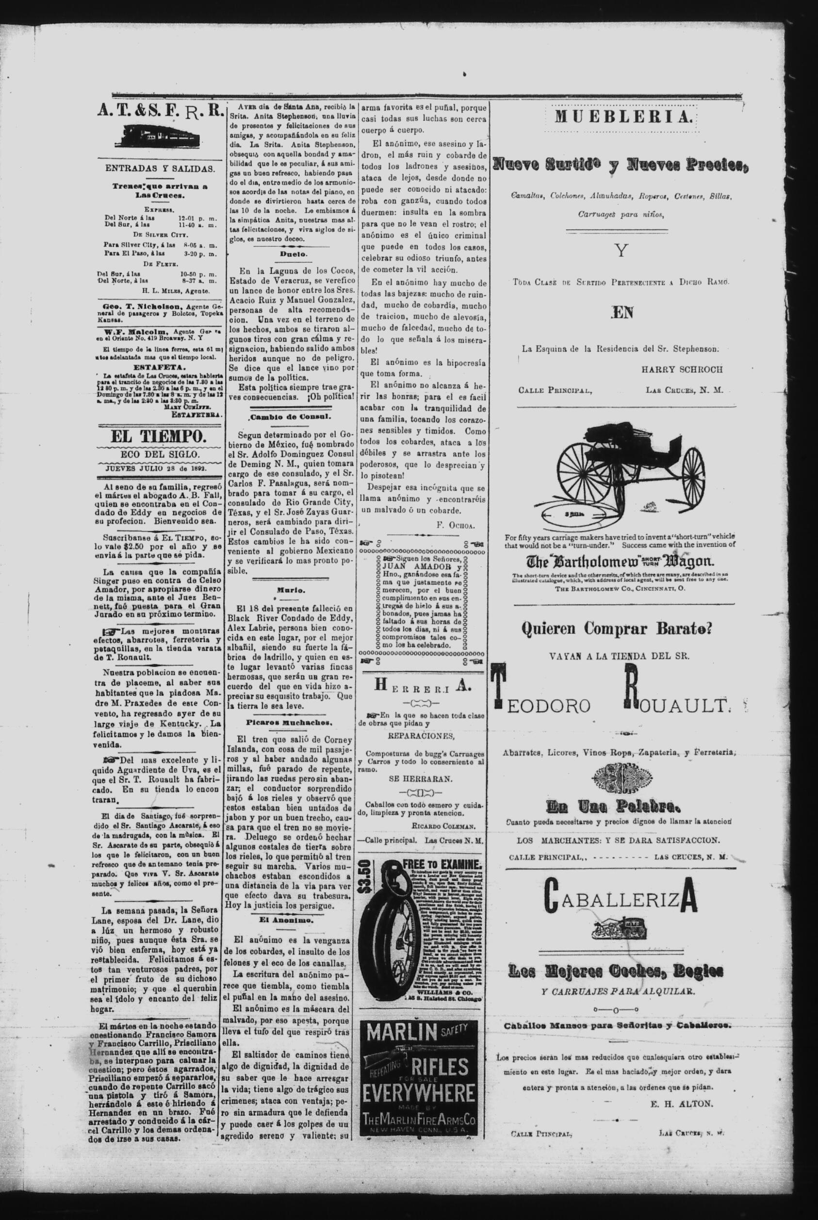 El Tiempo (Las Cruces, New Mexico, United States), 1892, July 28. Periódicos de la frontera México-Estados Unidos. https://latinonewspapers.com/s/es/item/86359.