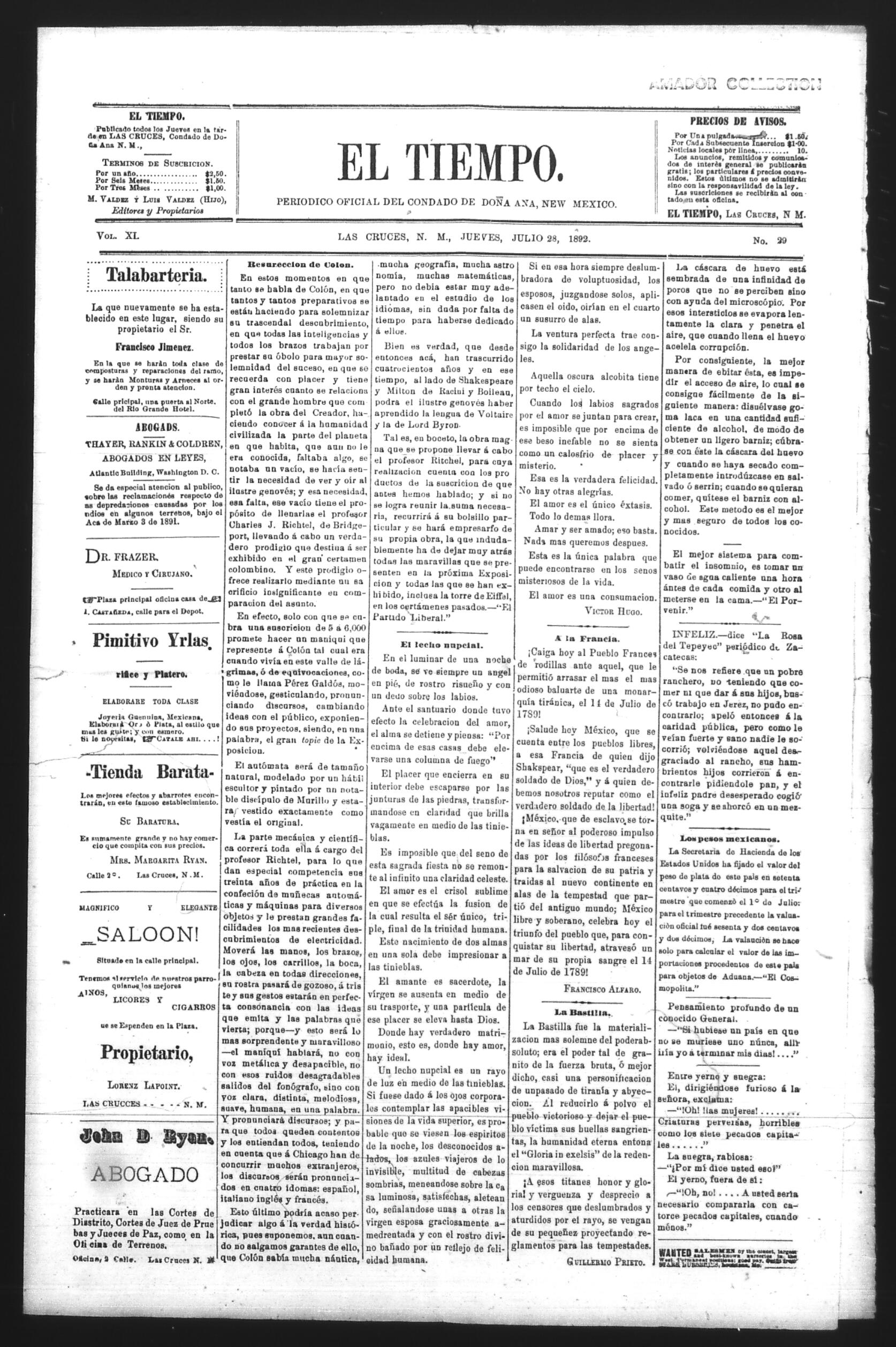 (1892, July 28). El Tiempo. Available from Periódicos de la frontera México-Estados Unidos: https://latinonewspapers.com/s/es/item/86359.